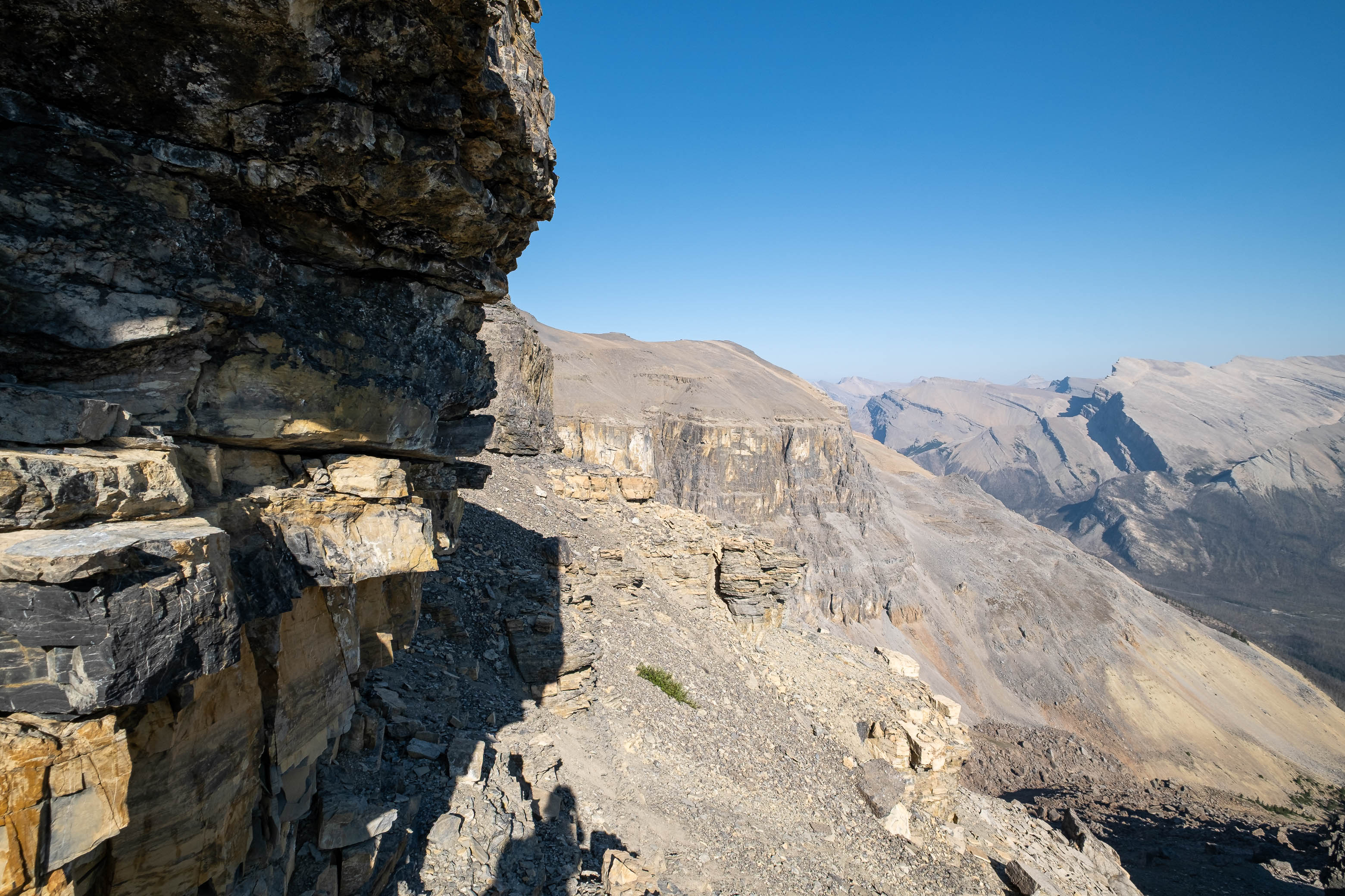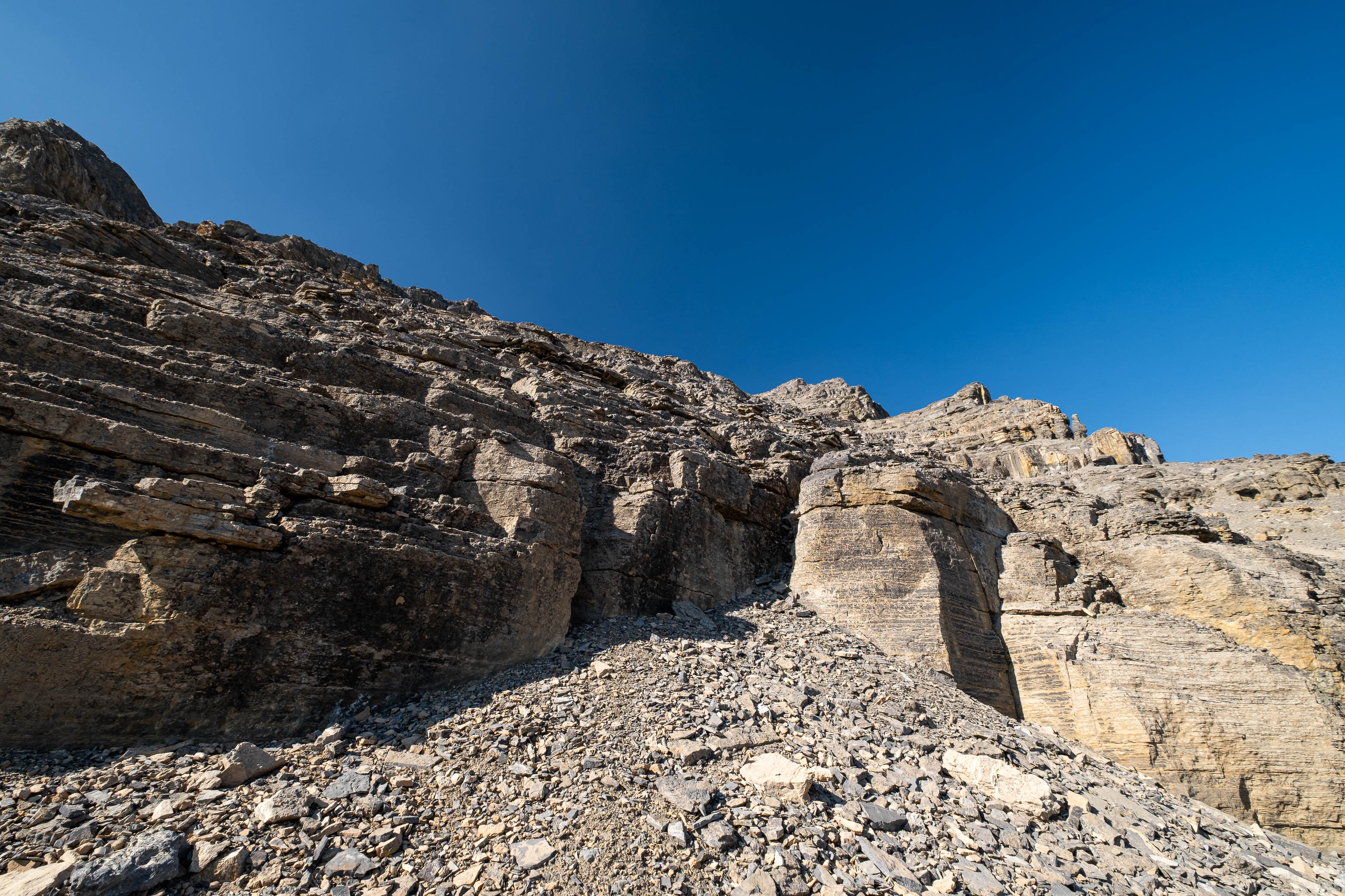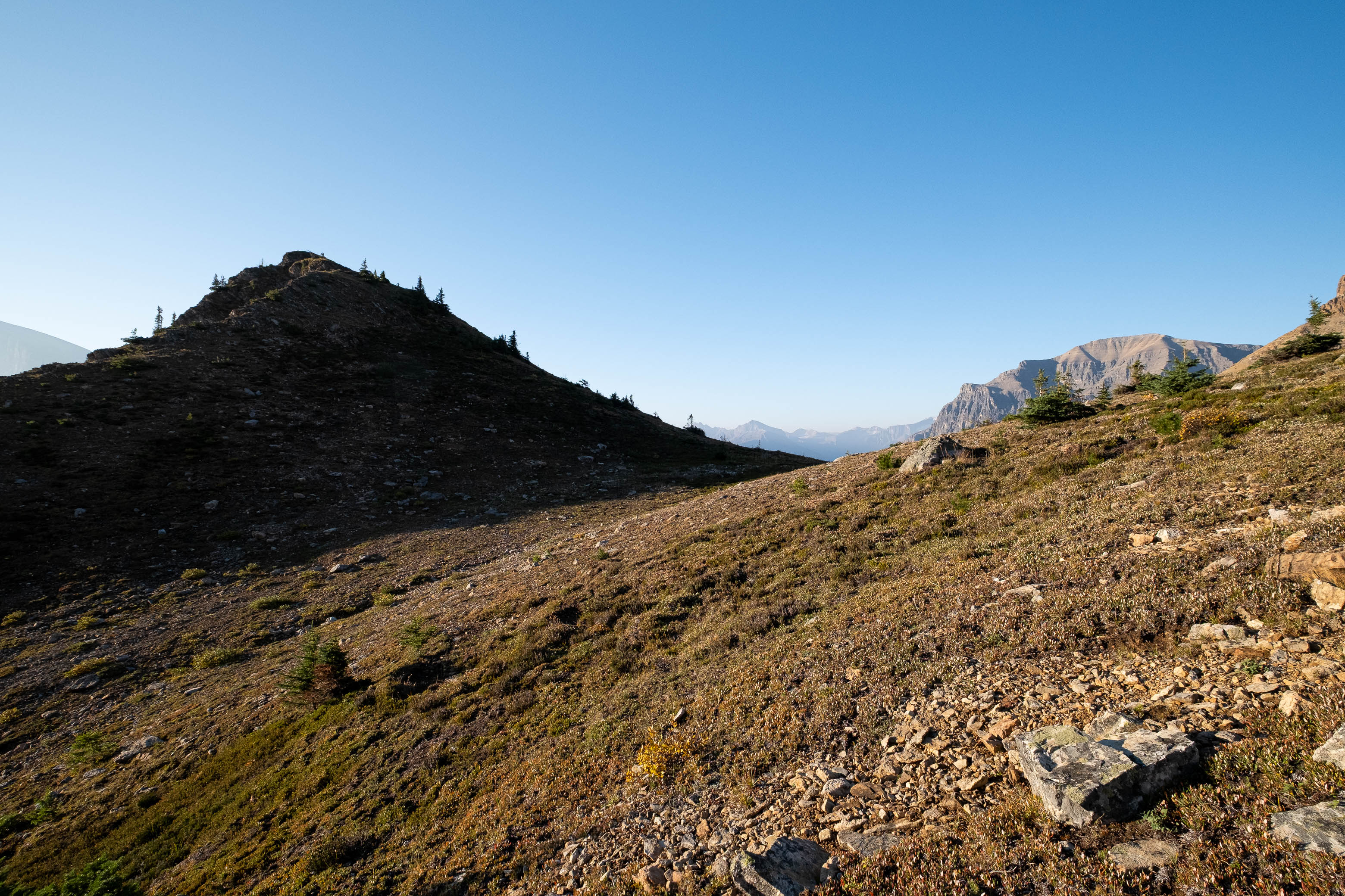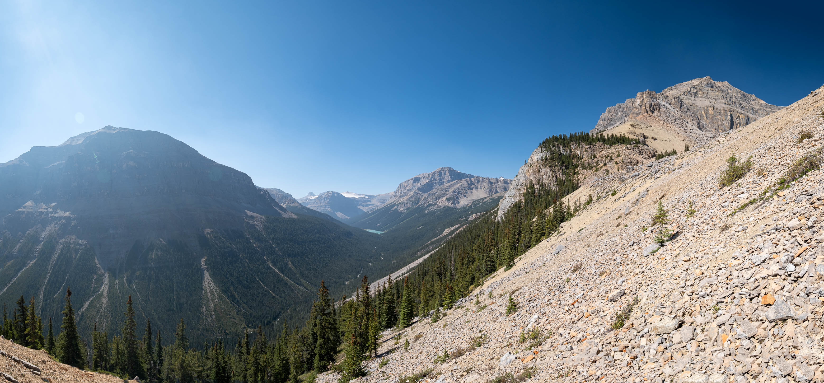 I was both excited and nervous to start up my exploratory route, but first we had a serious problem to address, and that problem was water. We'd been hiking in direct sun for hours since our last water source down at Porcupine Creek and we still had one vertical kilometer of south-facing slopes to go! I was counting on finding a small outlet stream at the mouth of the hanging valley, but unlike Siffleur, this valley was 100% bone dry. I convinced myself that I could ration what little water I had left, but my dad kept things real and made it clear that this would be the end of the road for him if we didn't find some fluids.