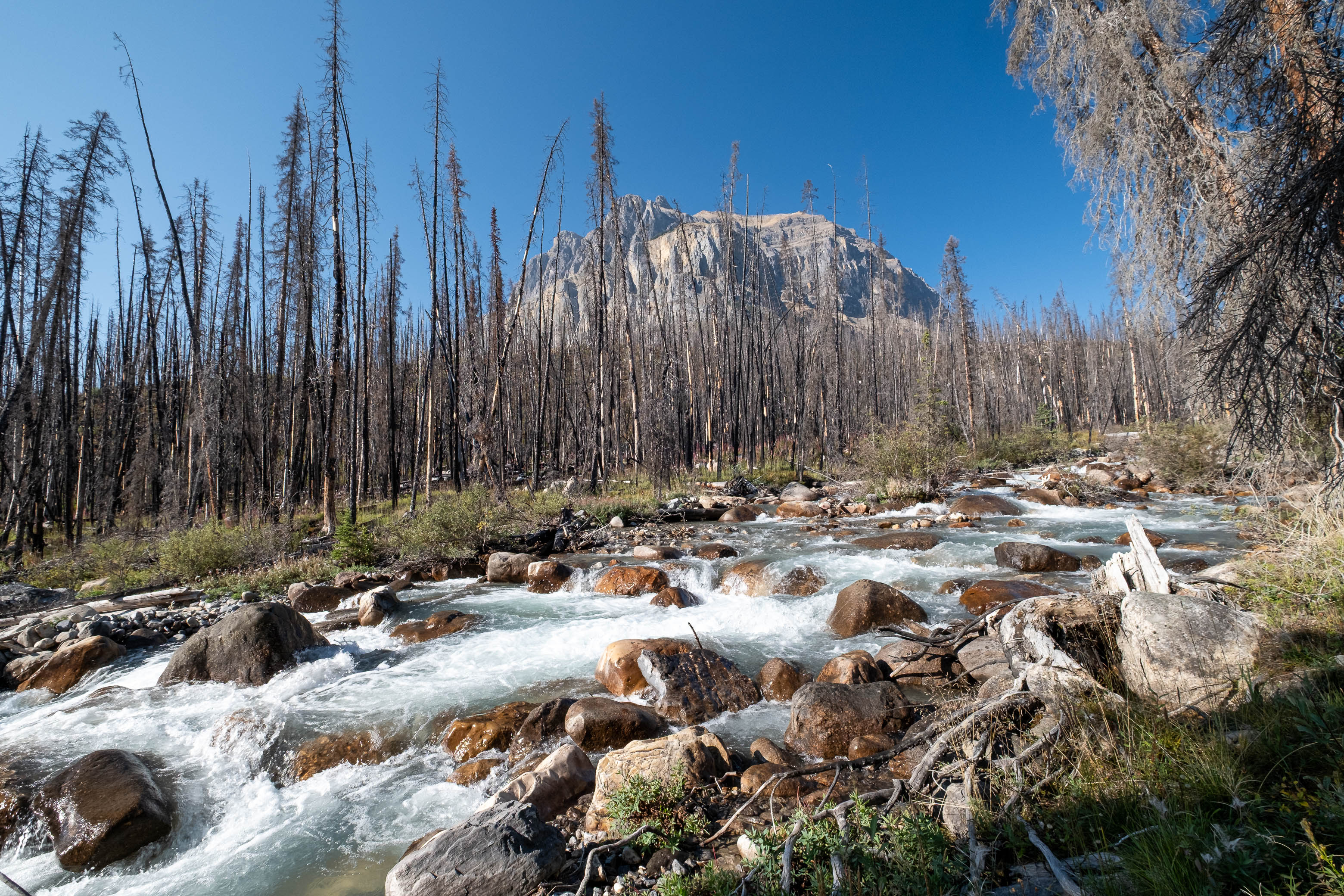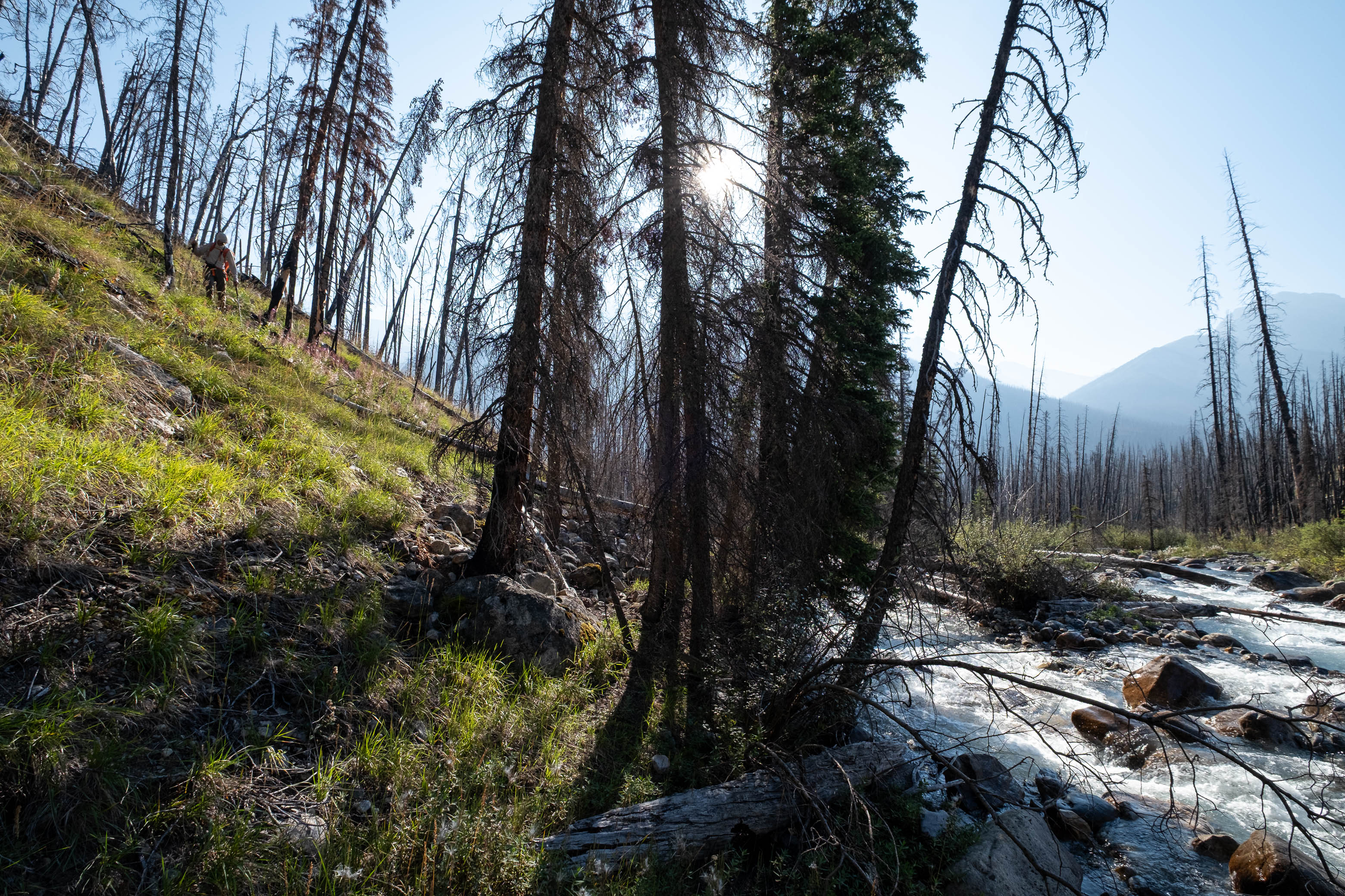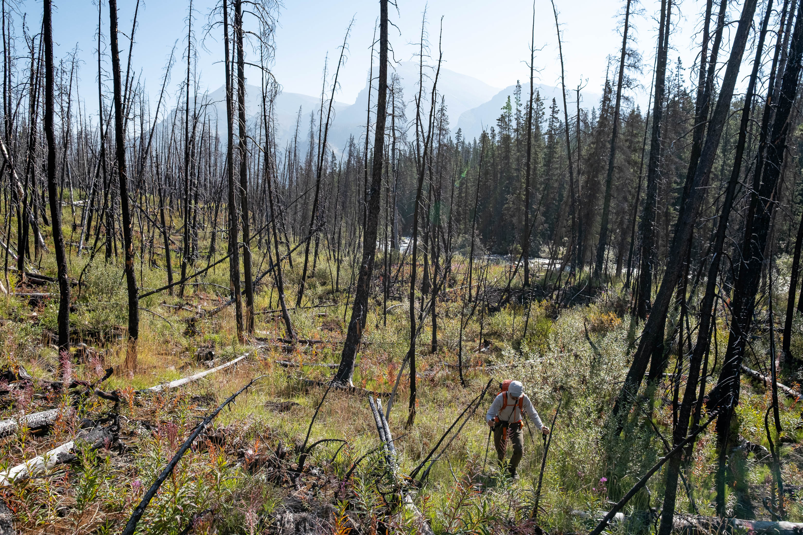 The "thrash up Porcupine Creek" was exactly that - a thrash. Mother nature has been busy since the 2018 wildfire and lots of young growth has already filled in the gaps between the thousands of charred "pick-up sticks" littering the forest floor. As we slowly picked our way alongside the creek I couldn't help but wonder what this forest had looked like during Rick's 1998 ascent. Had the fire helped or hindered passage?