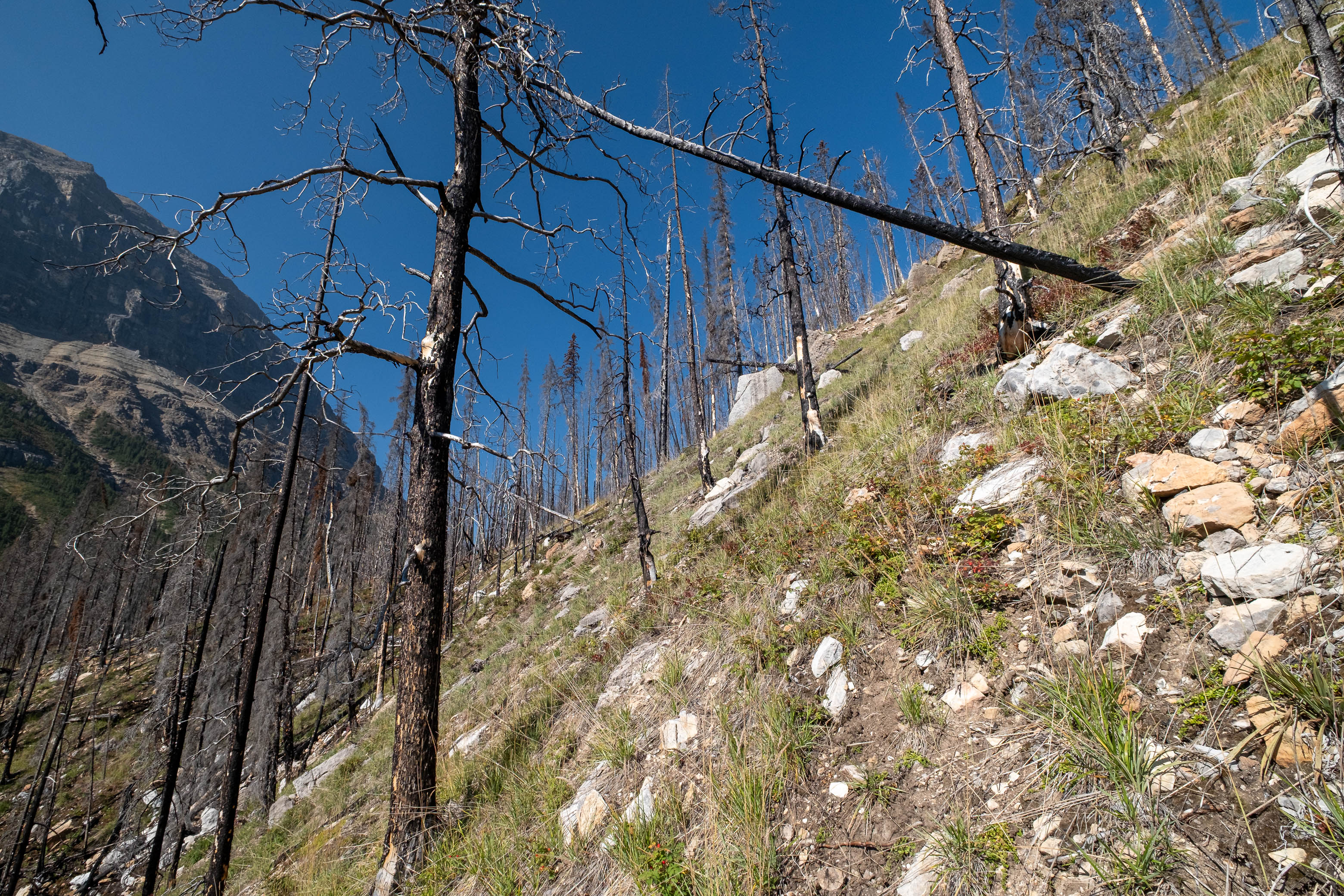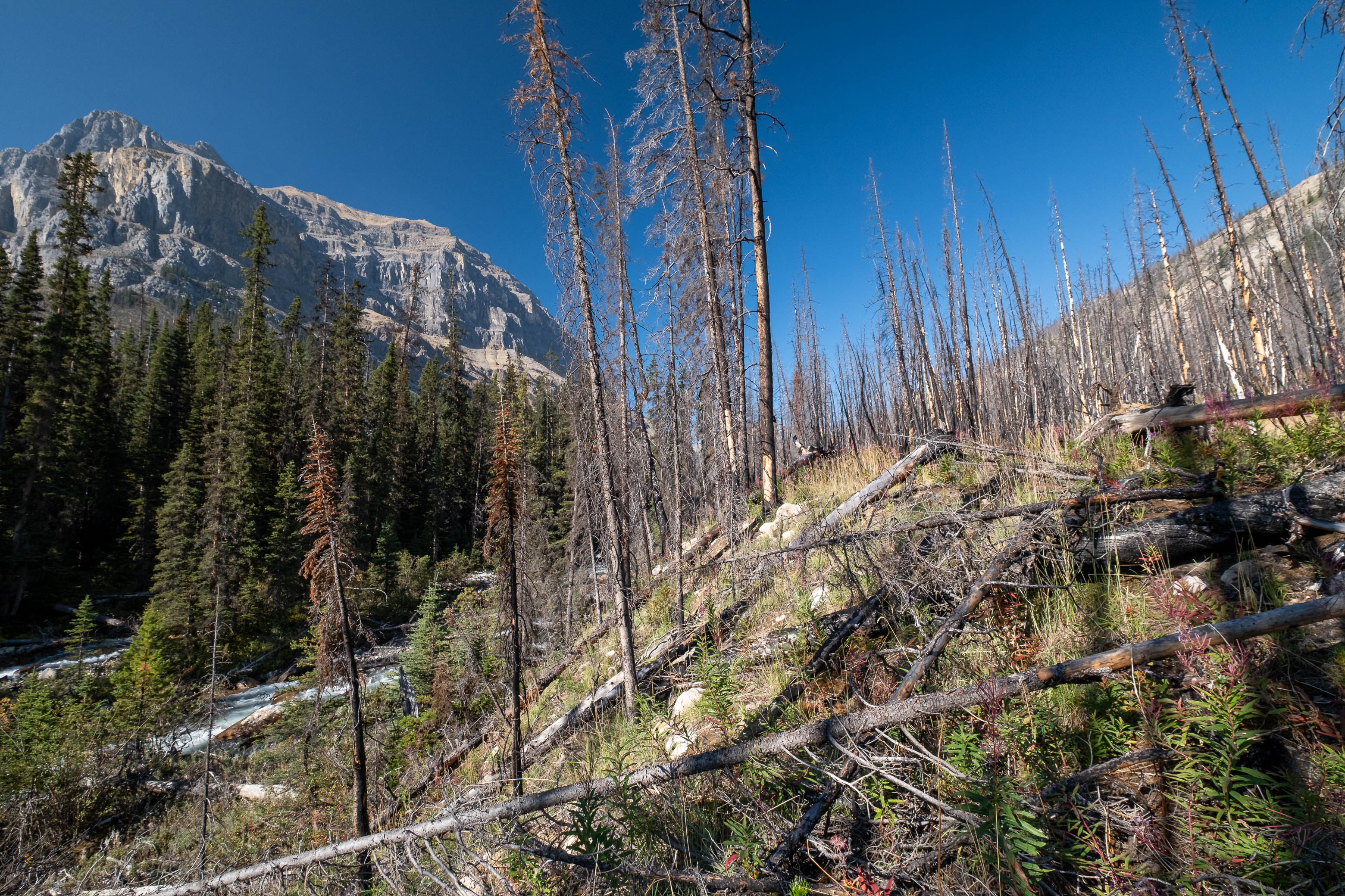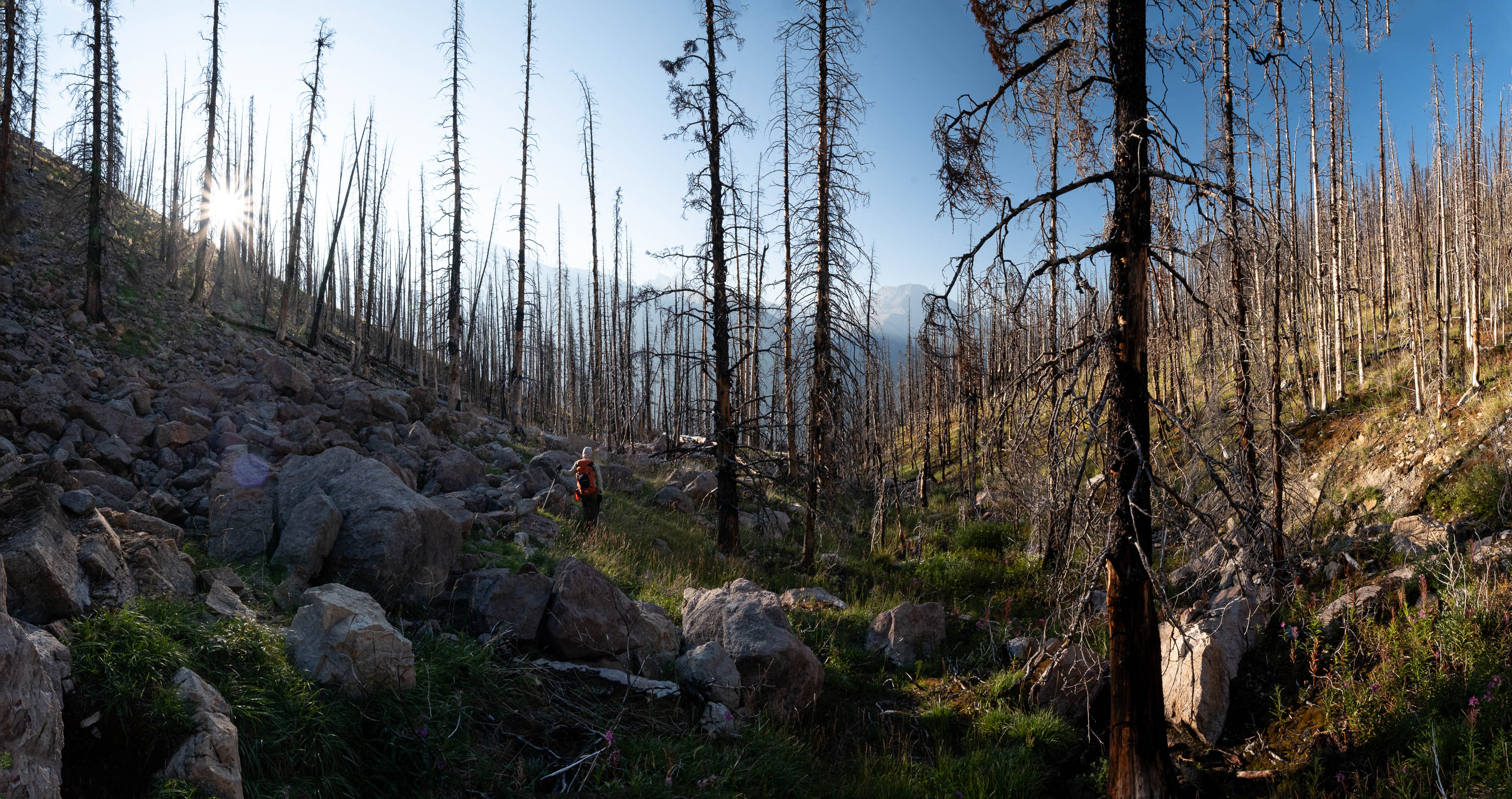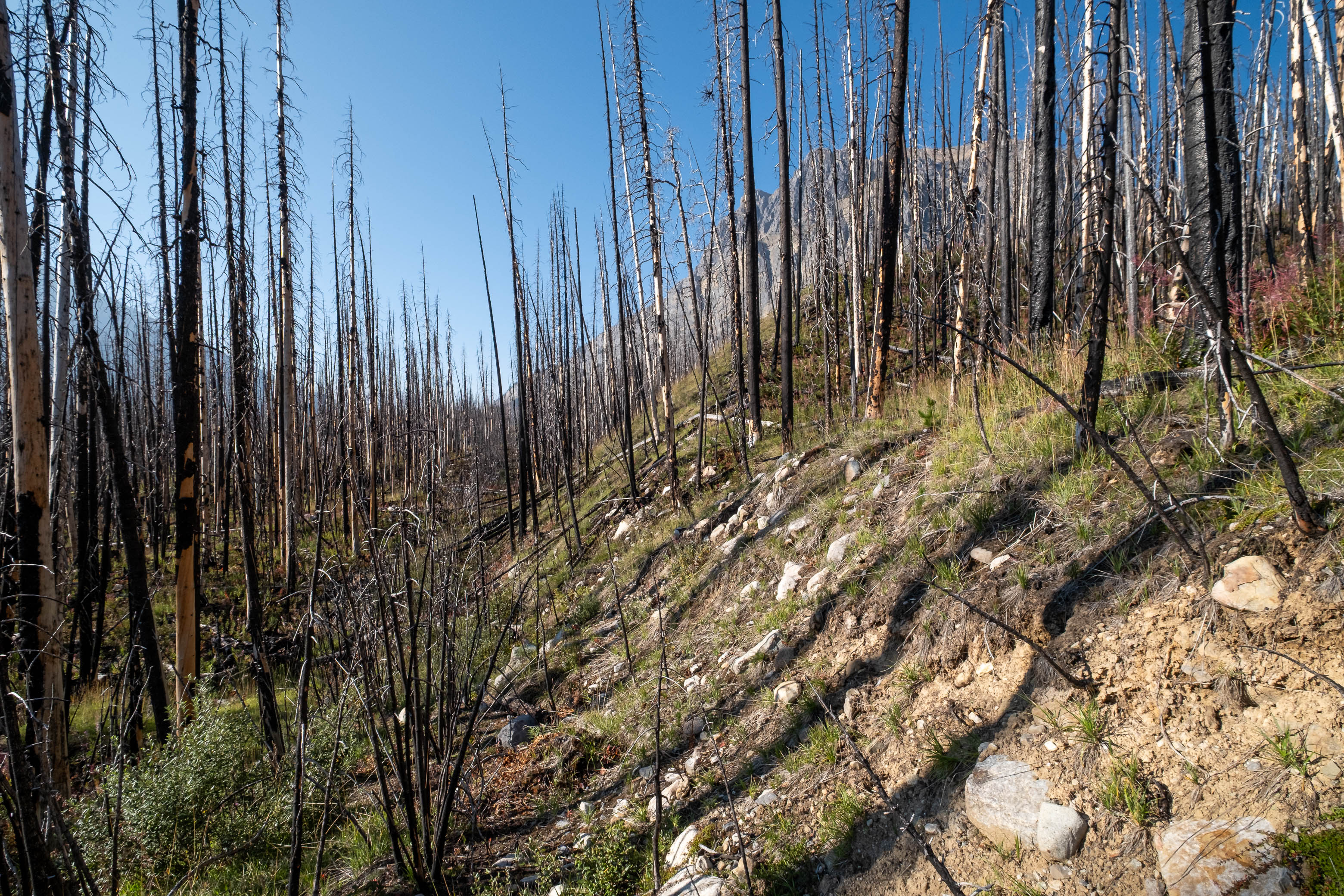 The "thrash up Porcupine Creek" was exactly that - a thrash. Mother nature has been busy since the 2018 wildfire and lots of young growth has already filled in the gaps between the thousands of charred "pick-up sticks" littering the forest floor. As we slowly picked our way alongside the creek I couldn't help but wonder what this forest had looked like during Rick's 1998 ascent. Had the fire helped or hindered passage?