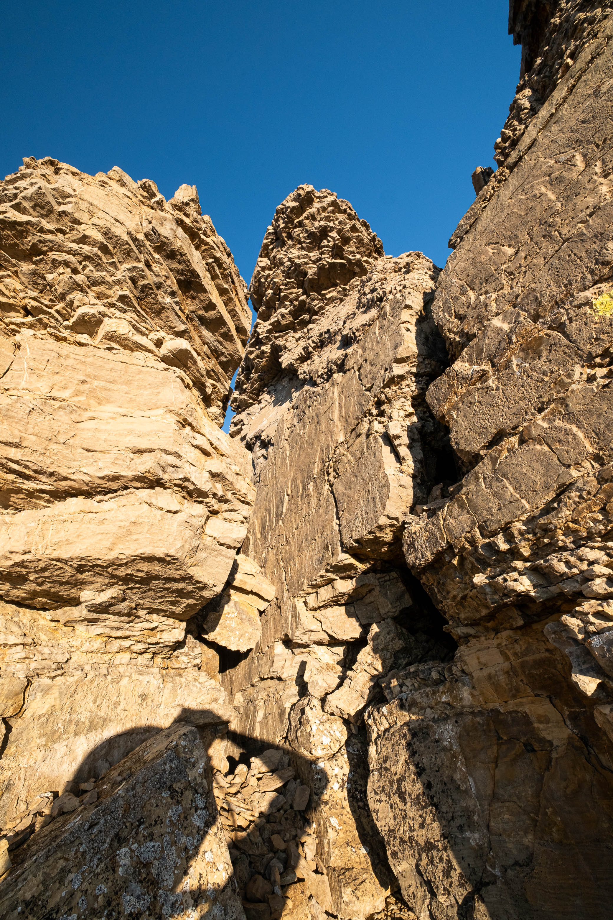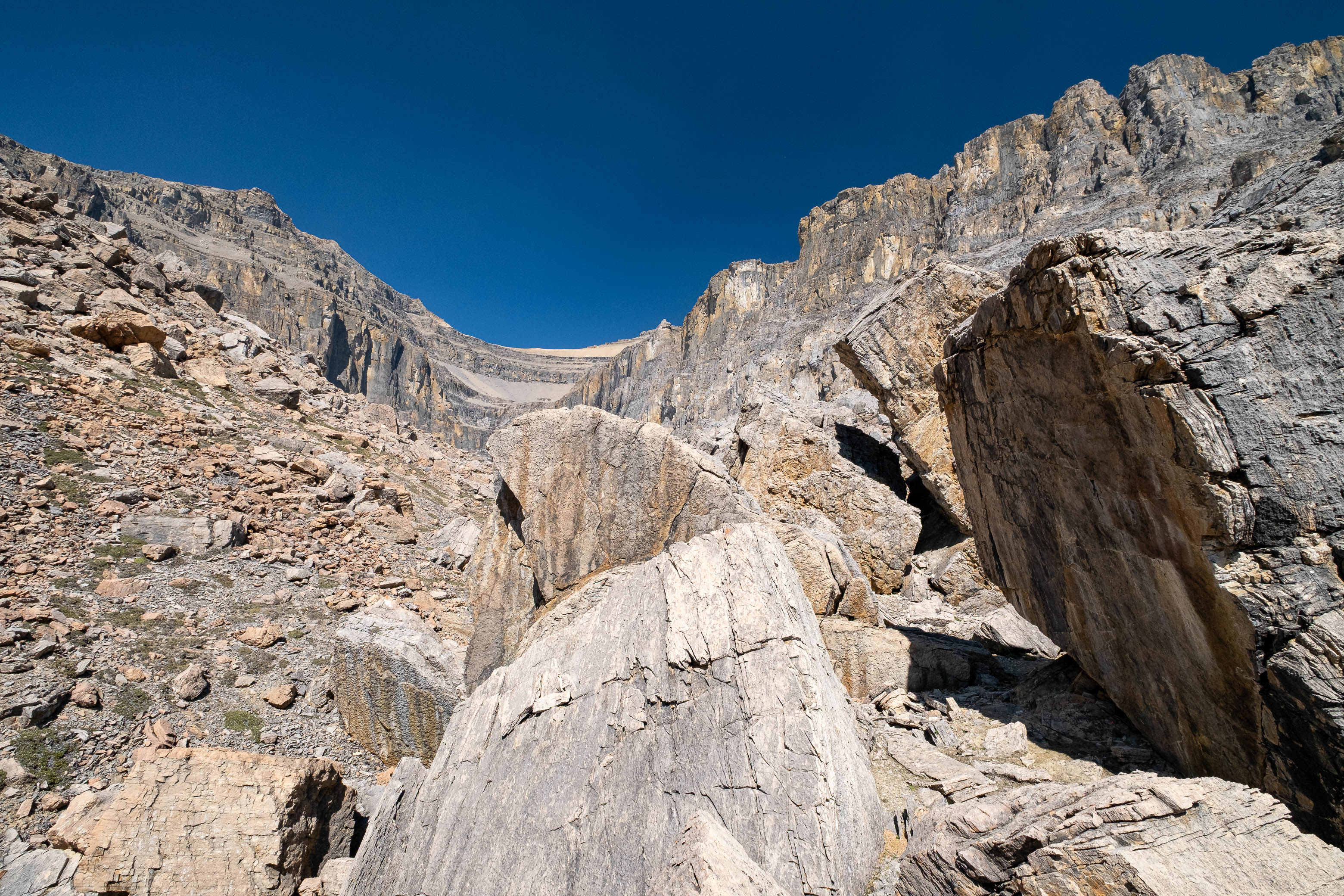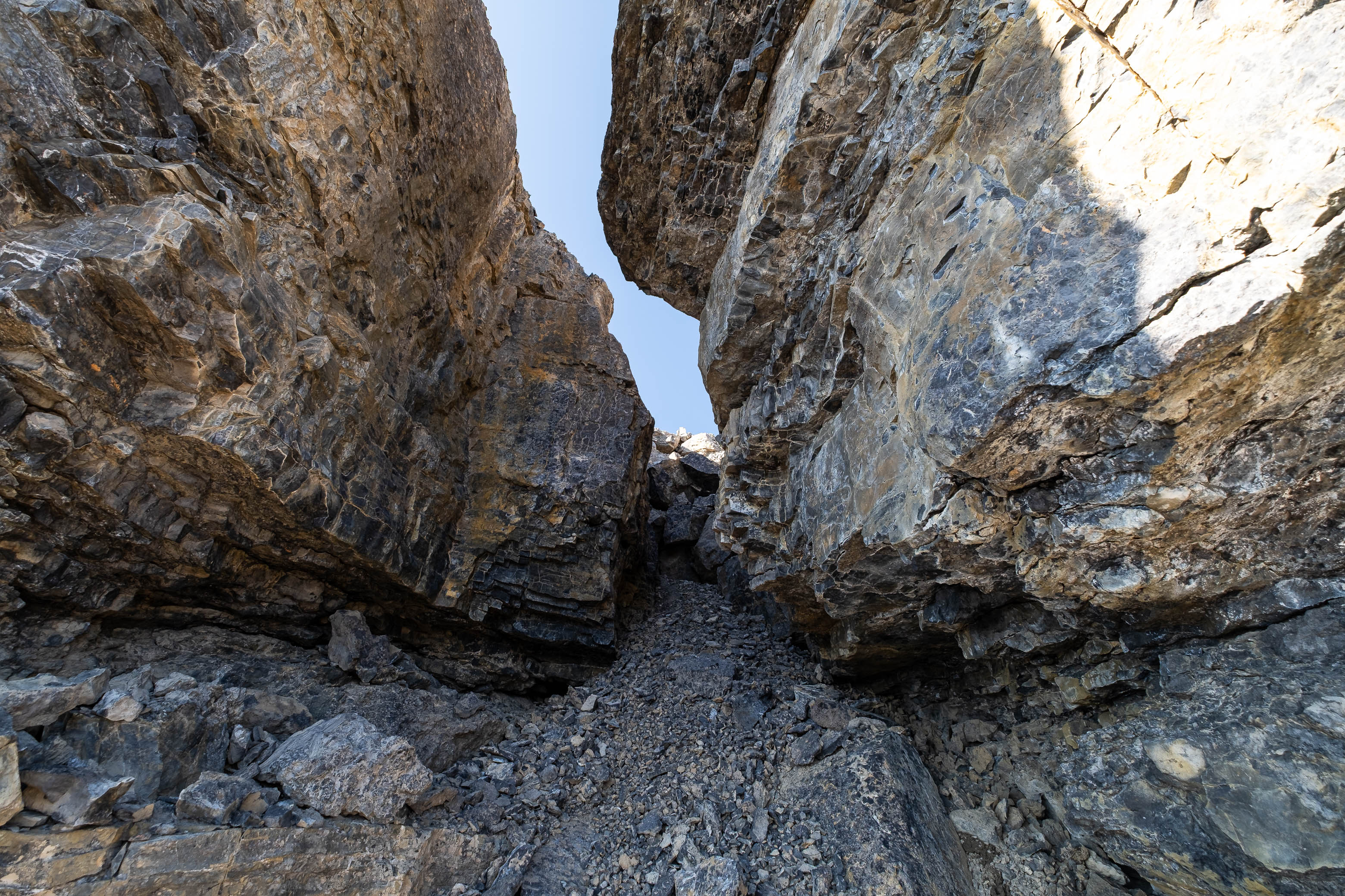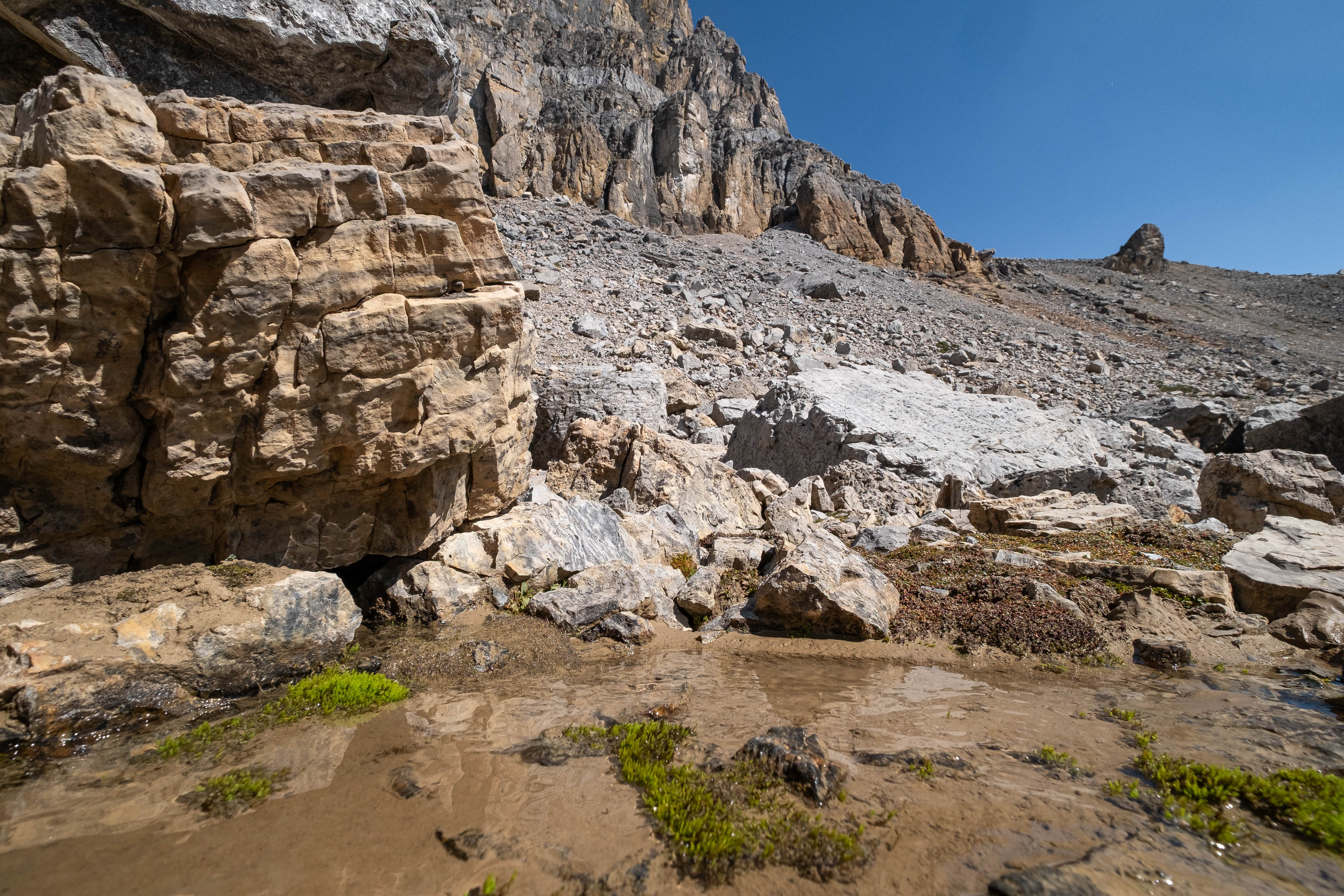 The faint sound of trickling water taunted us as we scanned the barren landscape for the slightest glistening of moisture, and our hearts sank as we reached a raised "platform" in the middle of the boulder field, coming to the realization that the only water in this desert valley was a minor waterfall, trickling down the cliff face high above, before disappearing under the heaps of rubble. RIP.