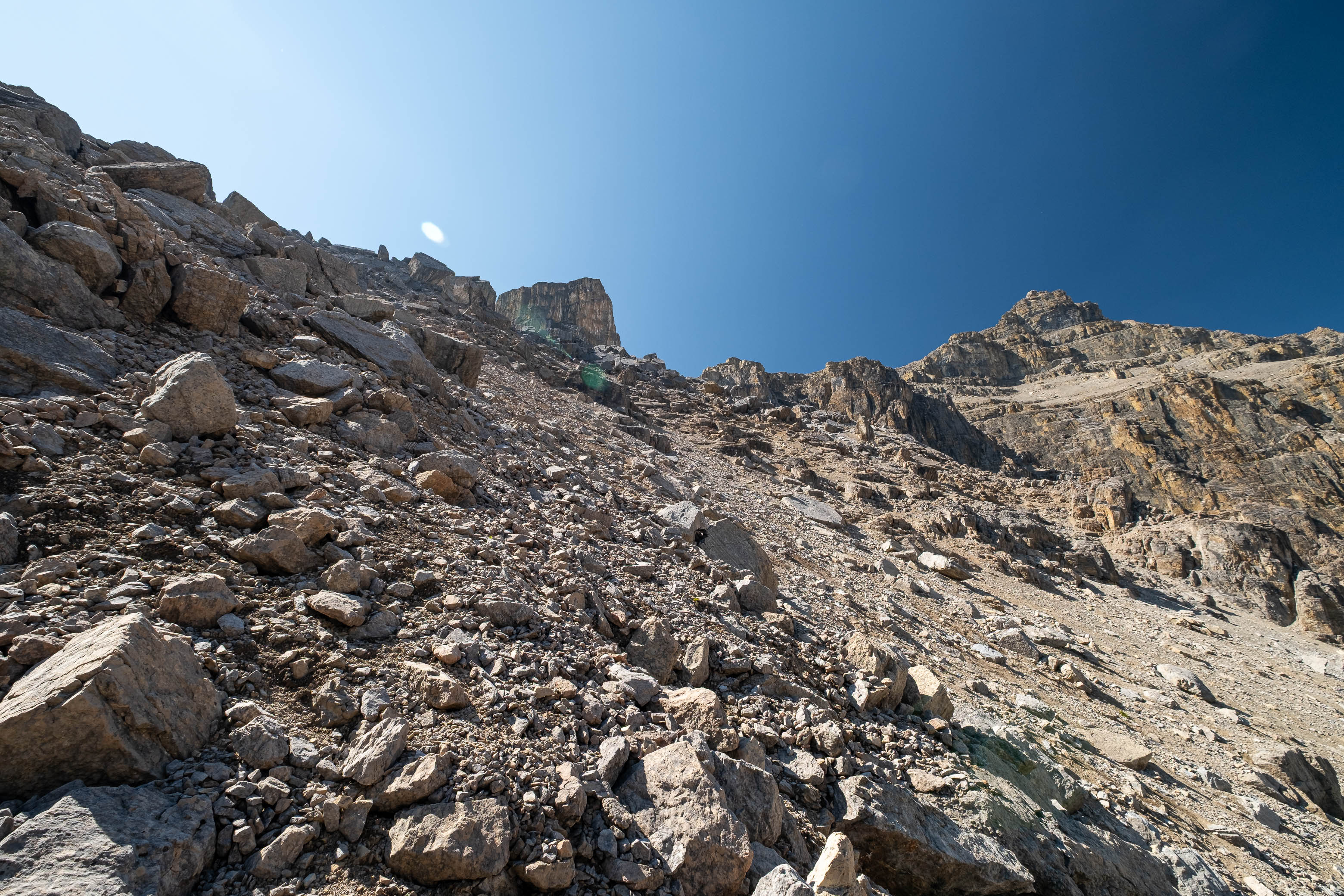 As I descended from the summit block, I almost broke the number one rule in mountain climbing by taking a different, unknown route back. During my ascent, I noticed a major scree ledge that traversed above Loudon's massive headwall, and while I couldn't tell for sure, it seriously looked like this ledge would easily connect to my ascent route far below, completely bypassing the false summit - saving on all the extra elevation gains and losses, while also avoiding the crux ridge. If this route worked, it would save me tons of time and energy (both of which I was majorly lacking), but that was a big IF and the more I thought about it, the more it became clear that the consequences of that route not panning out were simply too great to be worth the risk in my current situation.