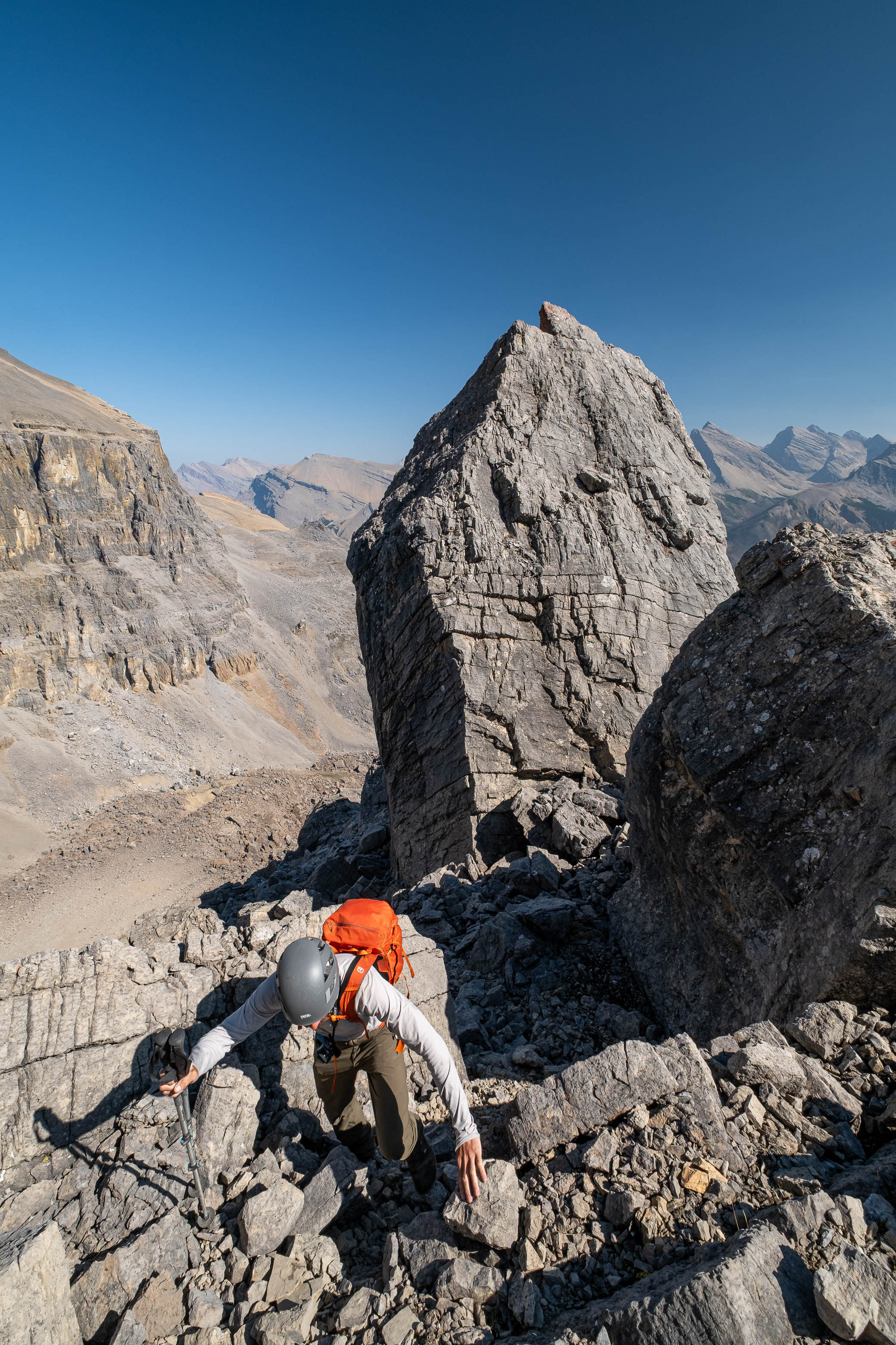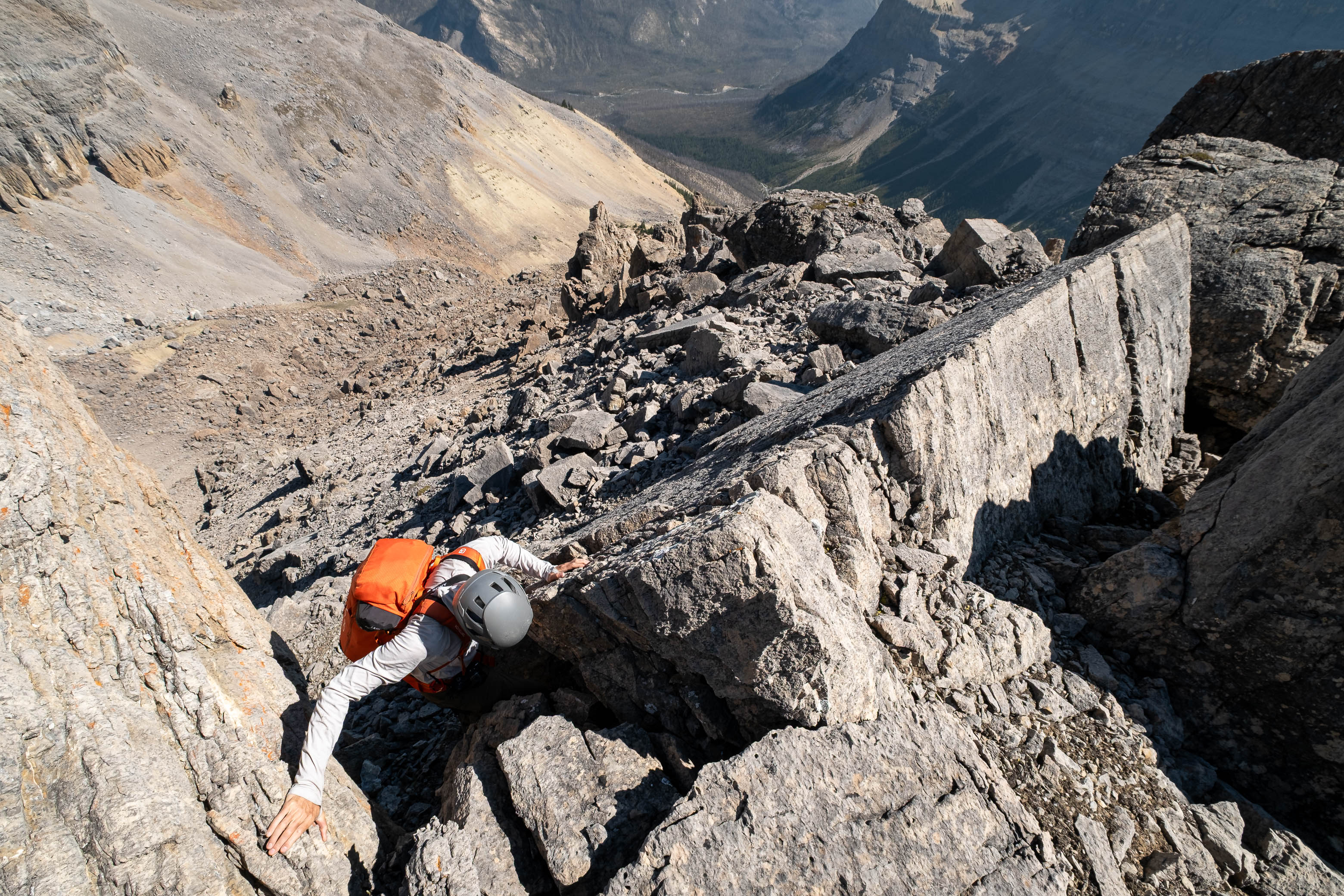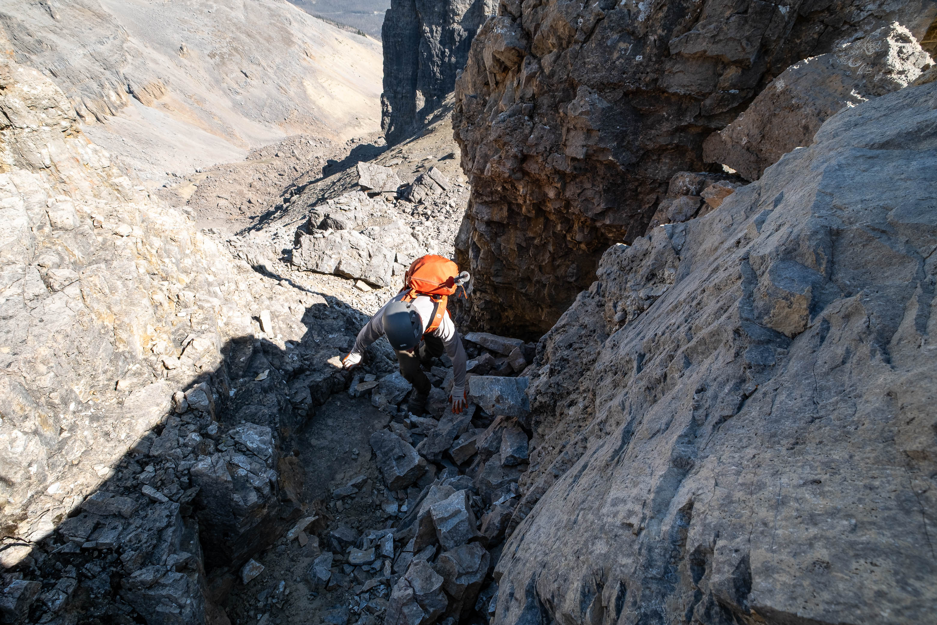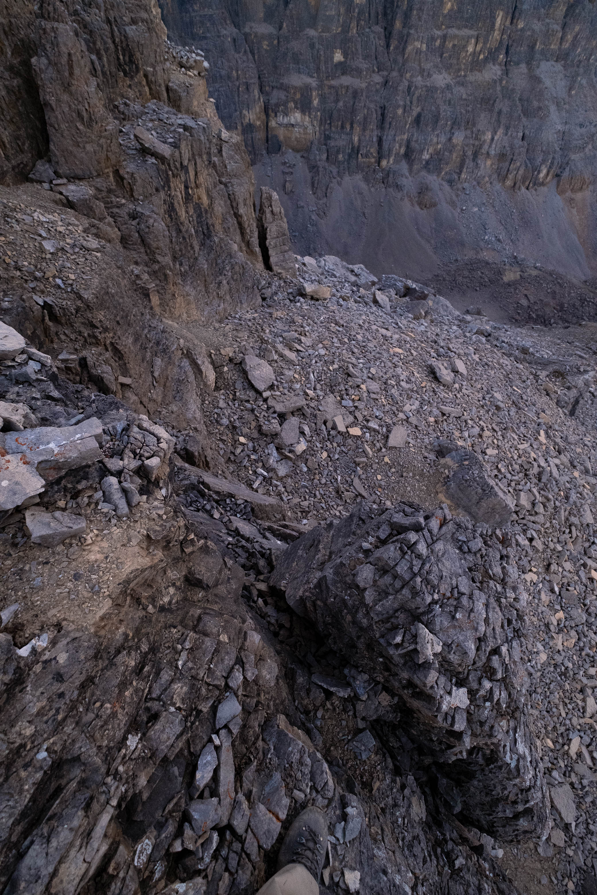We gained the lower SE branch of Loudon's SW ridge by taking a direct line up the steep scree slopes on the left-hand side (climber's) of the basin. This 300 meter slog up loose rubble was draining to say the least but at least it wasn't cement, so that was an improvement! As we topped out on the ridge I was once again blown away but the geological features of this mountain. The views across the hanging valley to Loudon's colourful walls of limestone were stunning, but what impressed me even more were those house-sized boulders, now defying gravity as they balanced precariously on the ridge! Geologists would loose their minds over this stuff! (Maybe...I don't know any Geologists actually, so I'm just speculating here 😂)