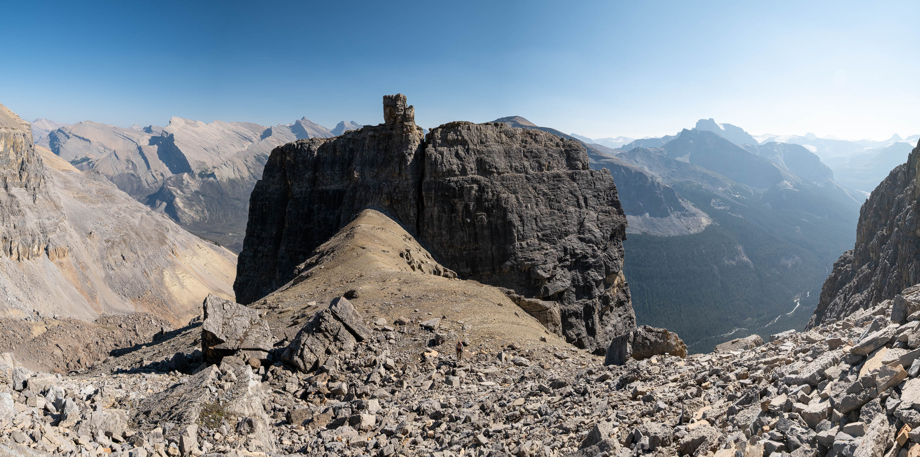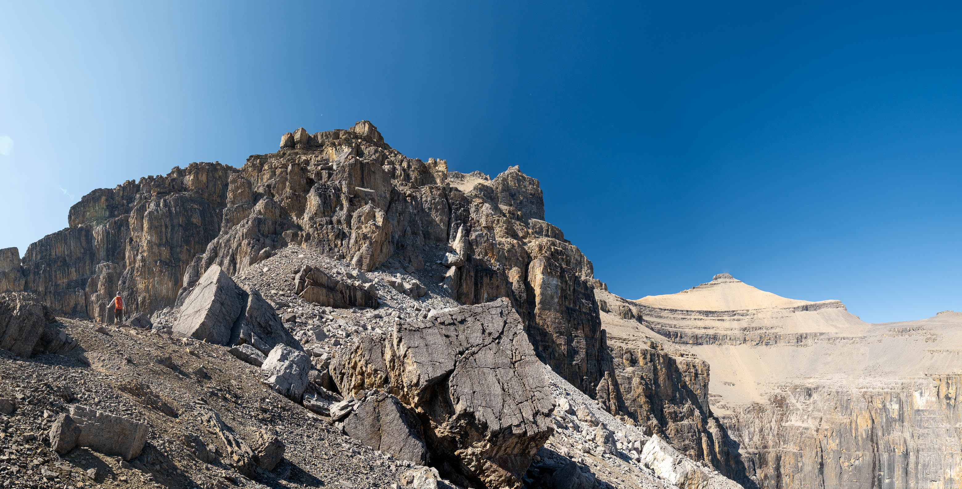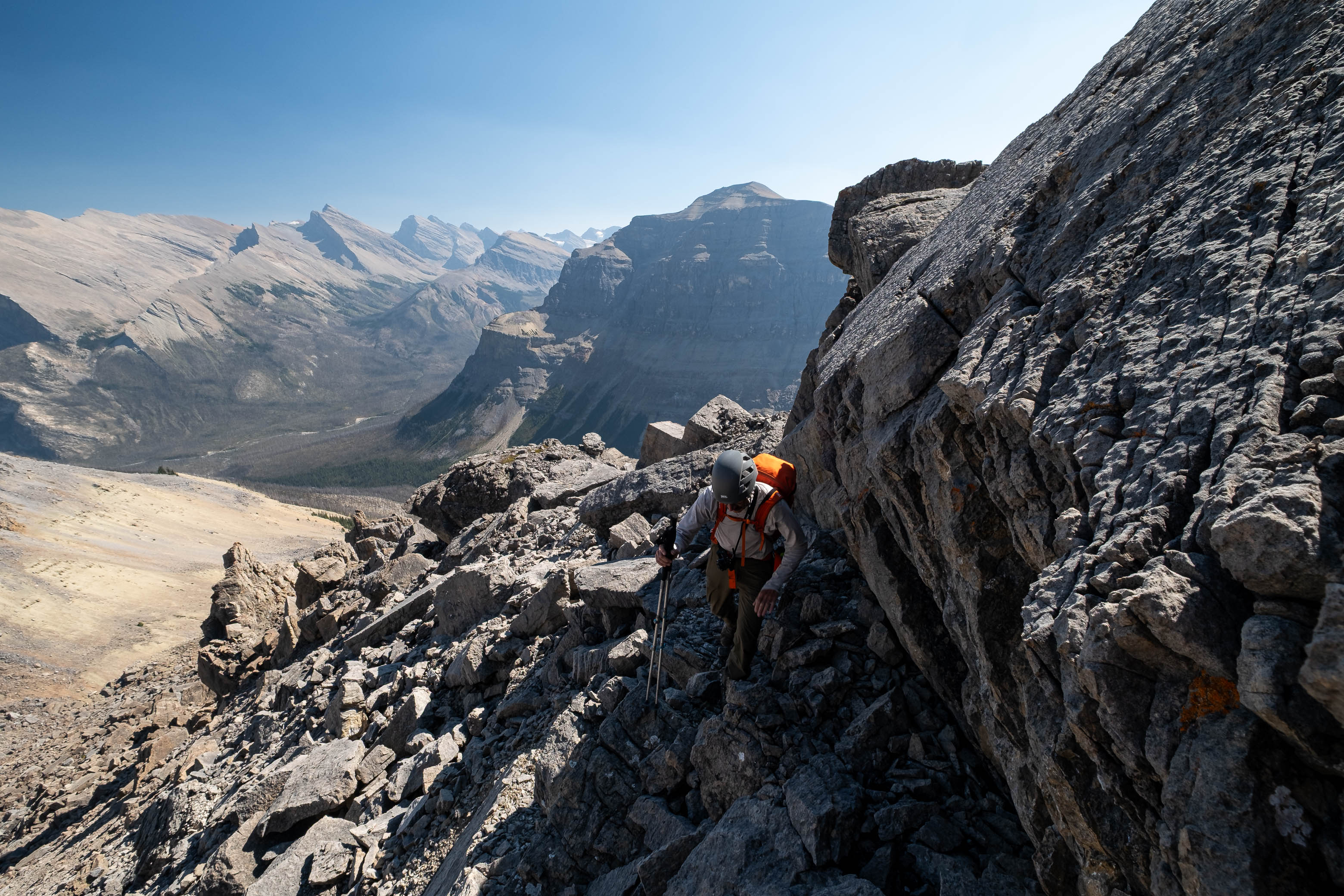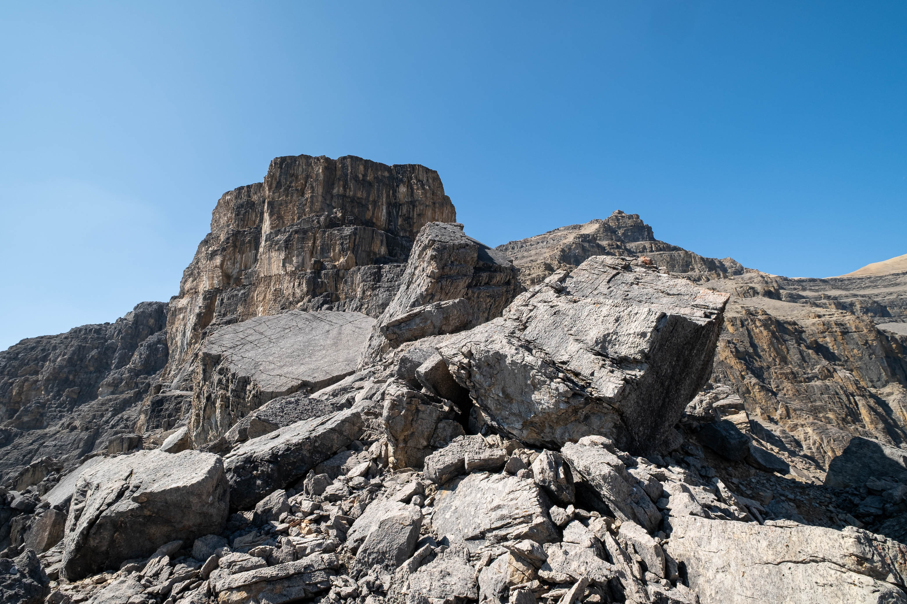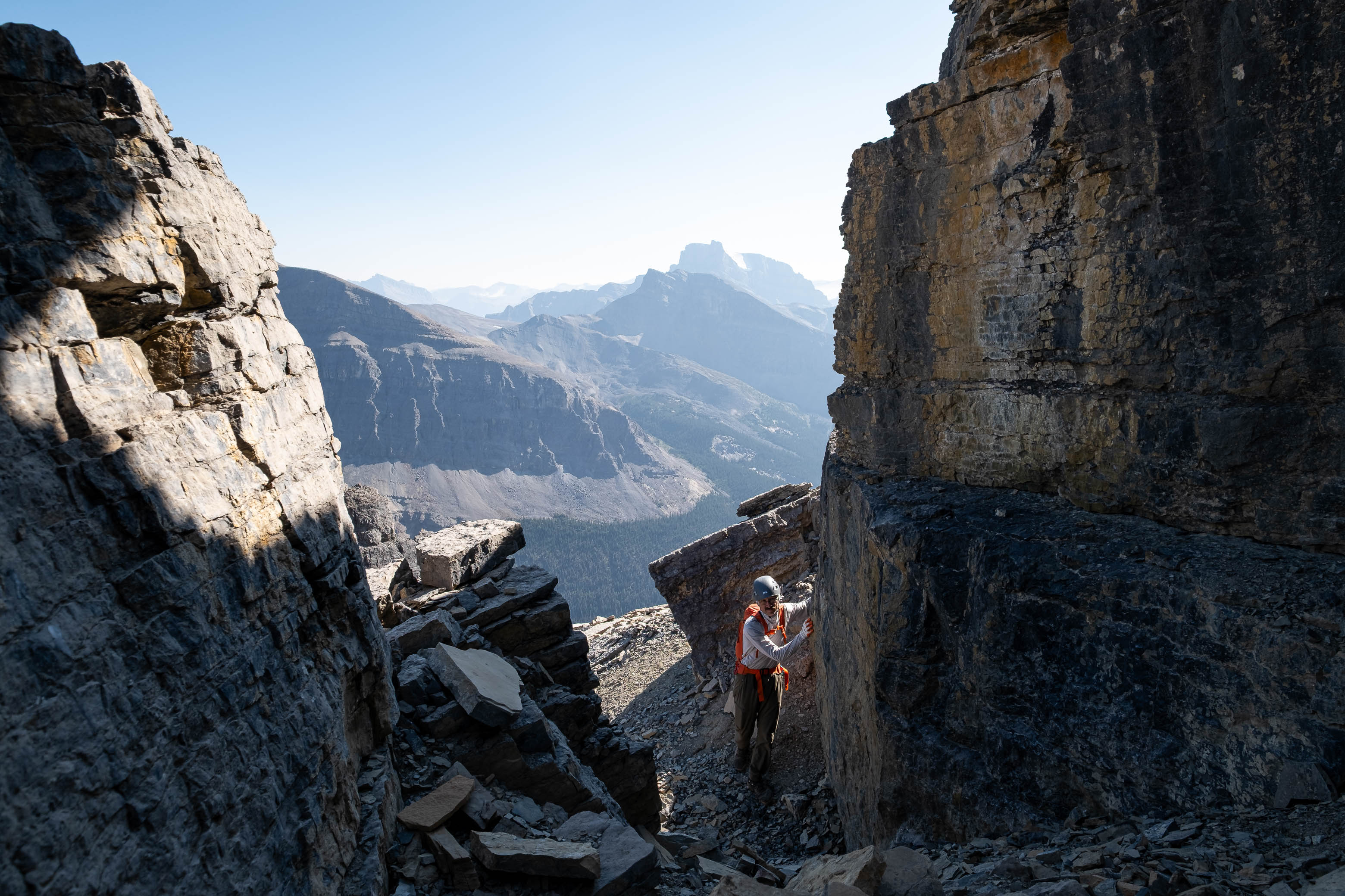 We gained the lower SE branch of Loudon's SW ridge by taking a direct line up the steep scree slopes on the left-hand side (climber's) of the basin. This 300 meter slog up loose rubble was draining to say the least but at least it wasn't cement, so that was an improvement! As we topped out on the ridge I was once again blown away but the geological features of this mountain. The views across the hanging valley to Loudon's colourful walls of limestone were stunning, but what impressed me even more were those house-sized boulders, now defying gravity as they balanced precariously on the ridge! Geologists would loose their minds over this stuff! (Maybe...I don't know any Geologists actually, so I'm just speculating here 😂)
