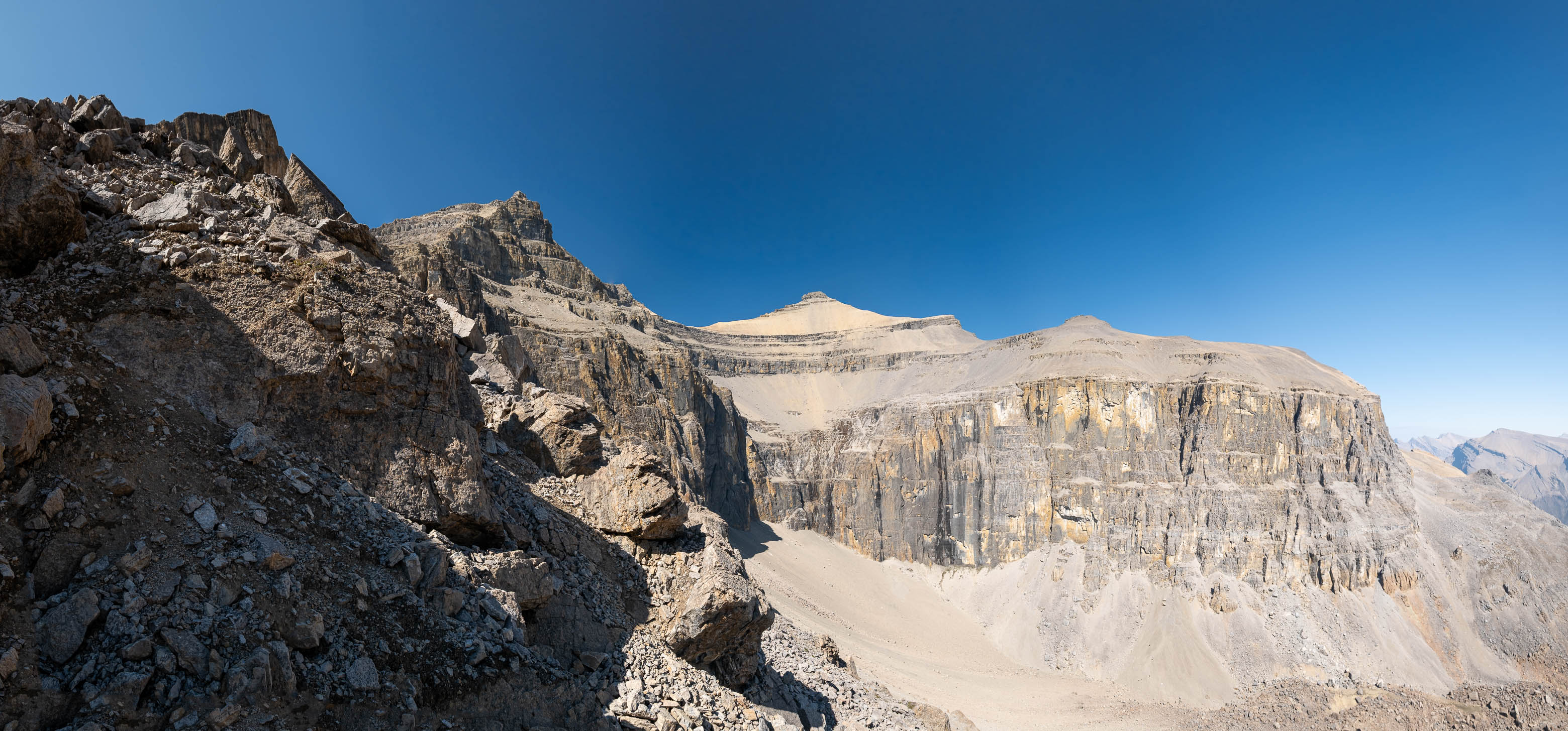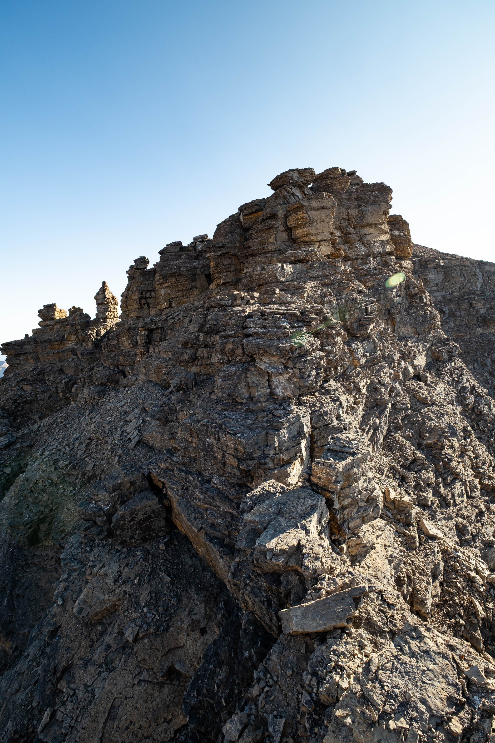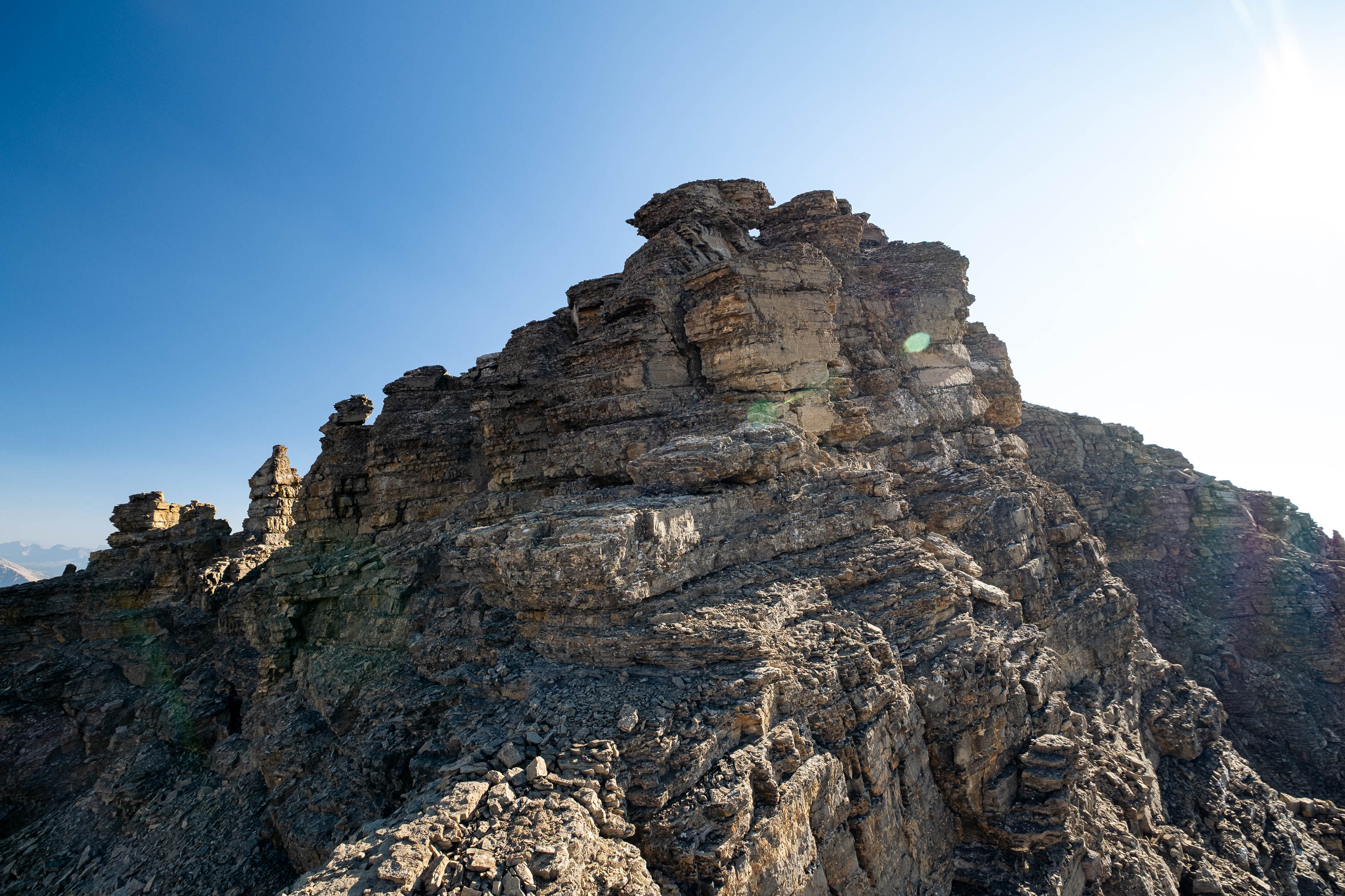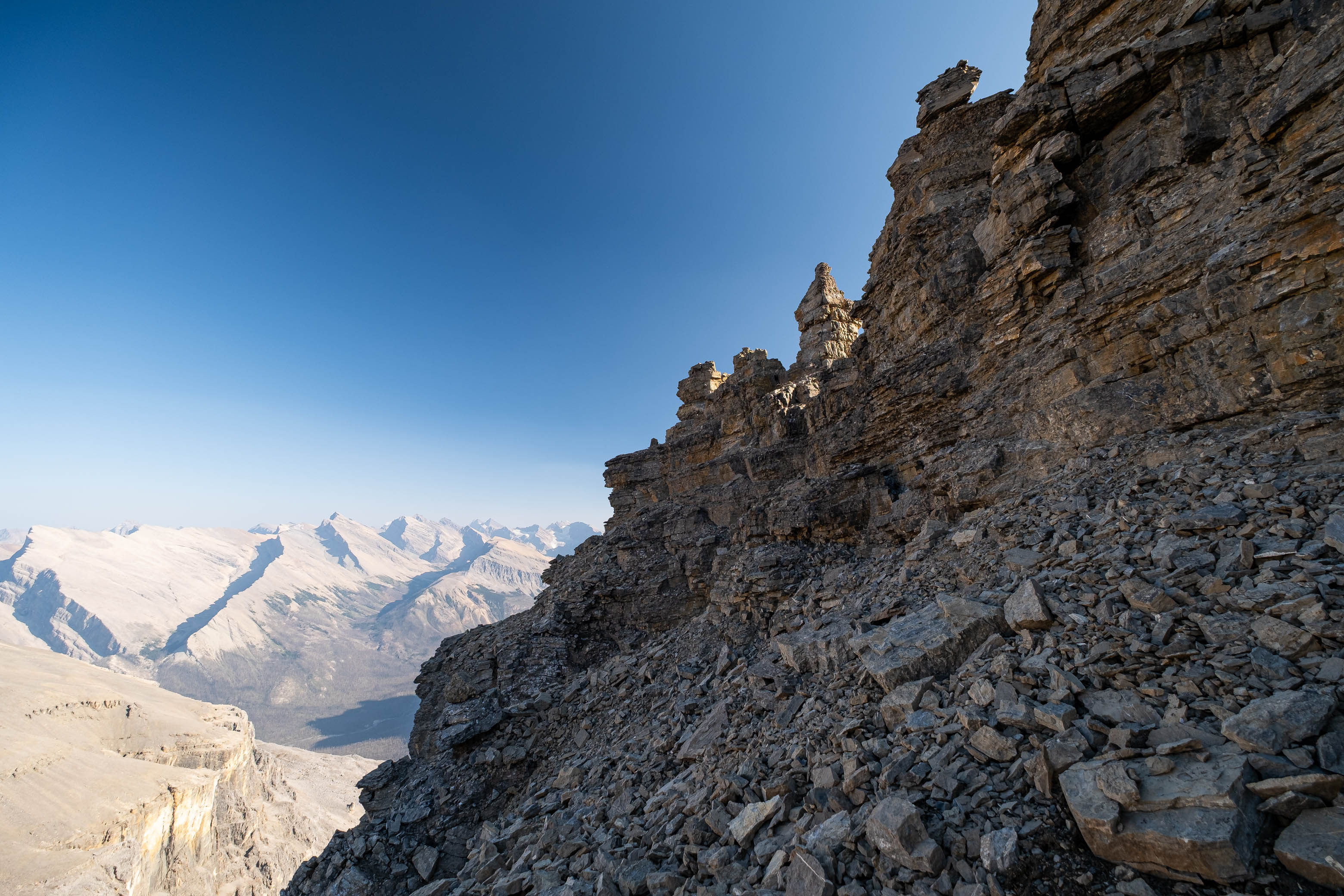 We gained the lower SE branch of Loudon's SW ridge by taking a direct line up the steep scree slopes on the left-hand side (climber's) of the basin. This 300 meter slog up loose rubble was draining to say the least but at least it wasn't cement, so that was an improvement! As we topped out on the ridge I was once again blown away but the geological features of this mountain. The views across the hanging valley to Loudon's colourful walls of limestone were stunning, but what impressed me even more were those house-sized boulders, now defying gravity as they balanced precariously on the ridge! Geologists would loose their minds over this stuff! (Maybe...I don't know any Geologists actually, so I'm just speculating here 😂)