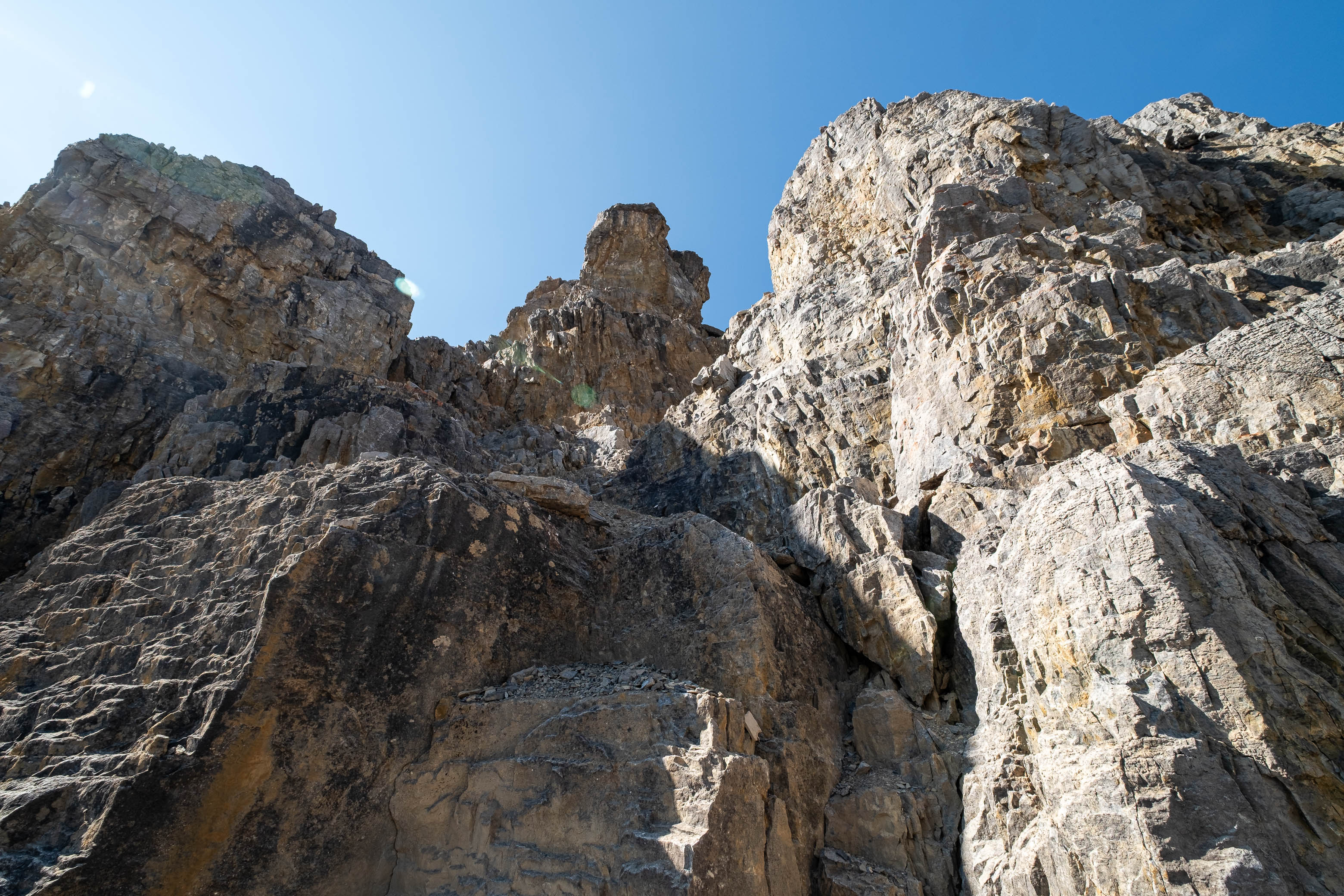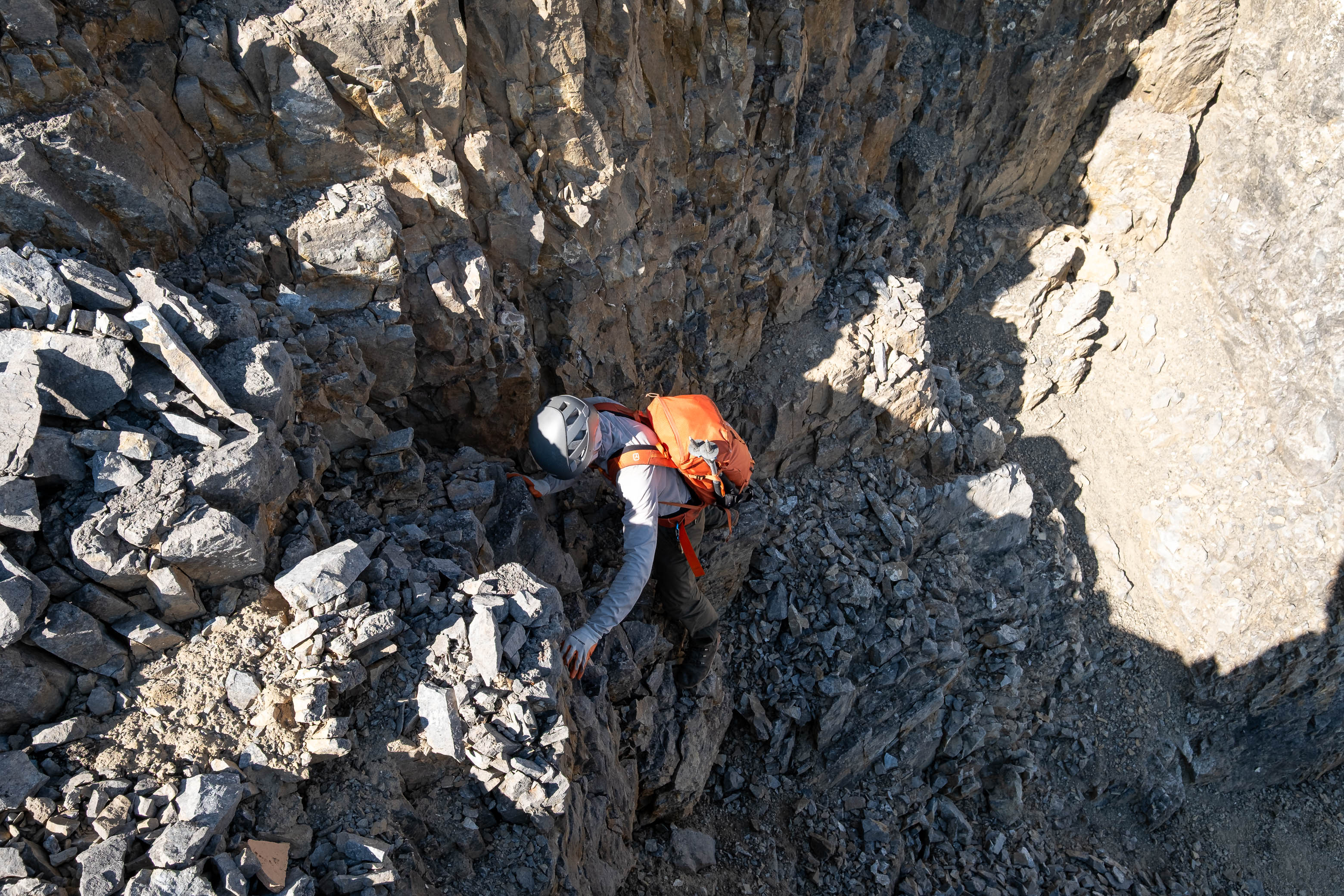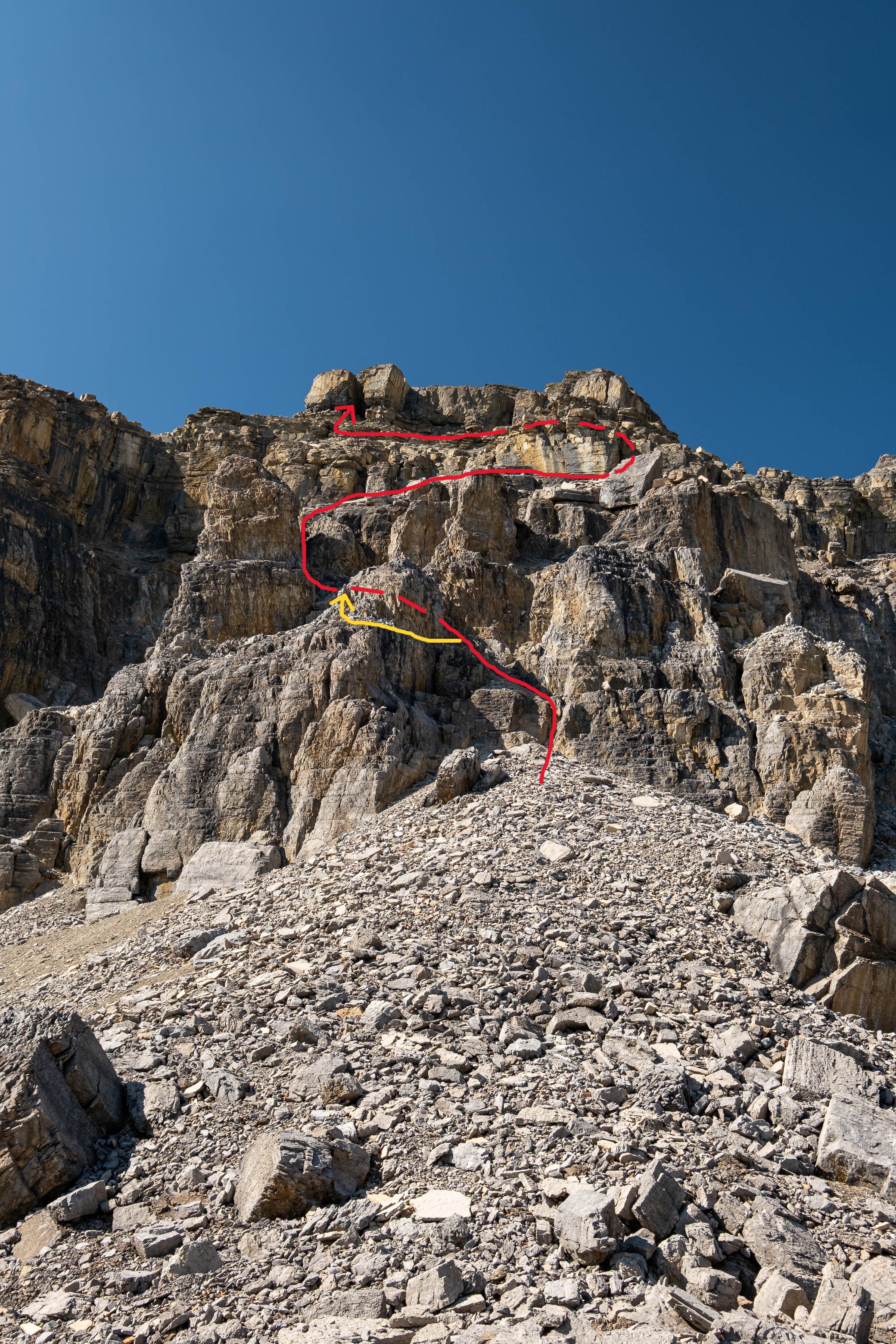 I started by ascending the first obvious weakness up loose, crumbly rock, before making a short, downsloping traverse to climber's left and continuing up a chimney that easily led me to a broad scree ledge about halfway up the wall. My dad wasn't willing to commit to the final move of the first weakness on questionable holds, but luckily I was able to find him a bypass using a narrow flake to climber's left.