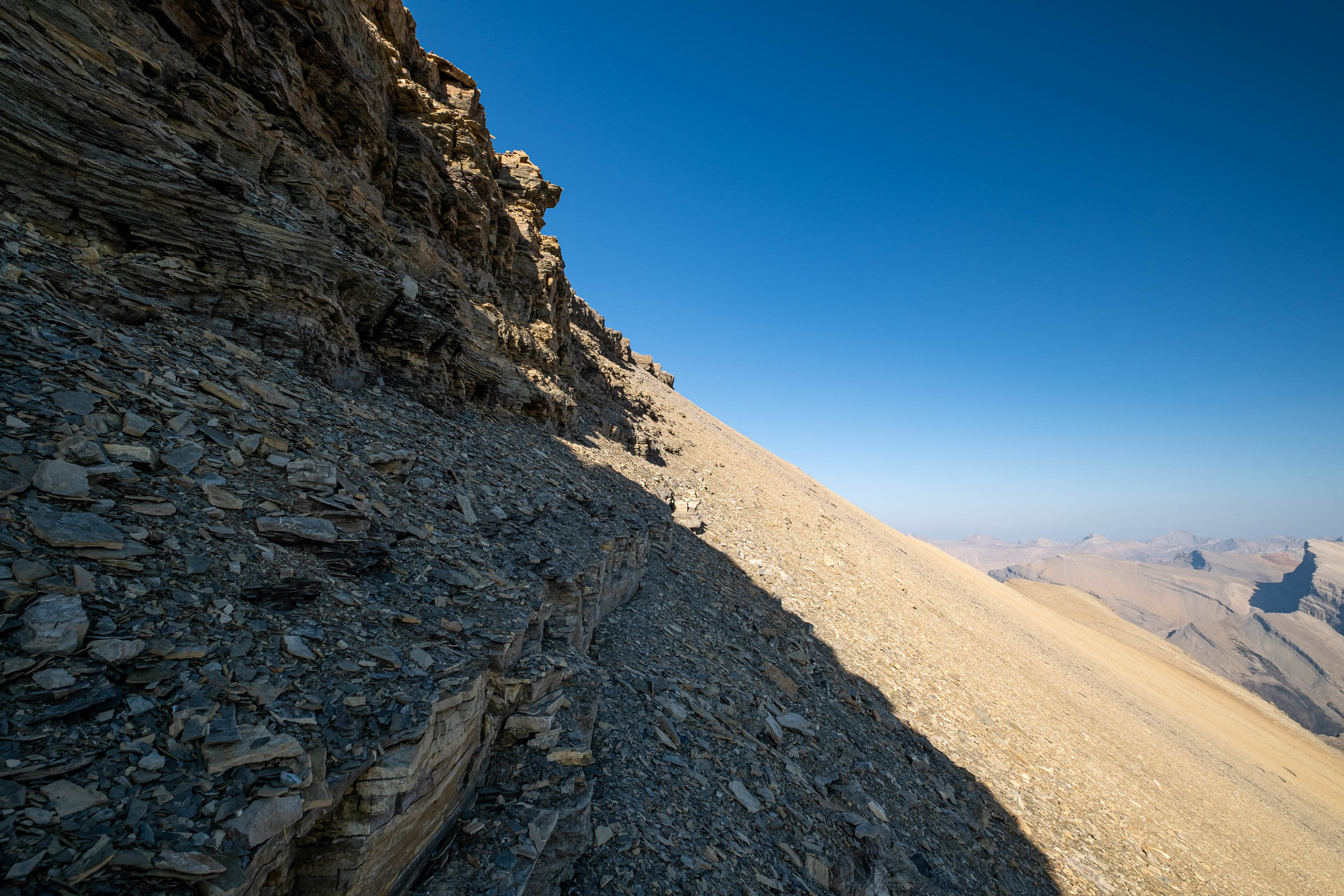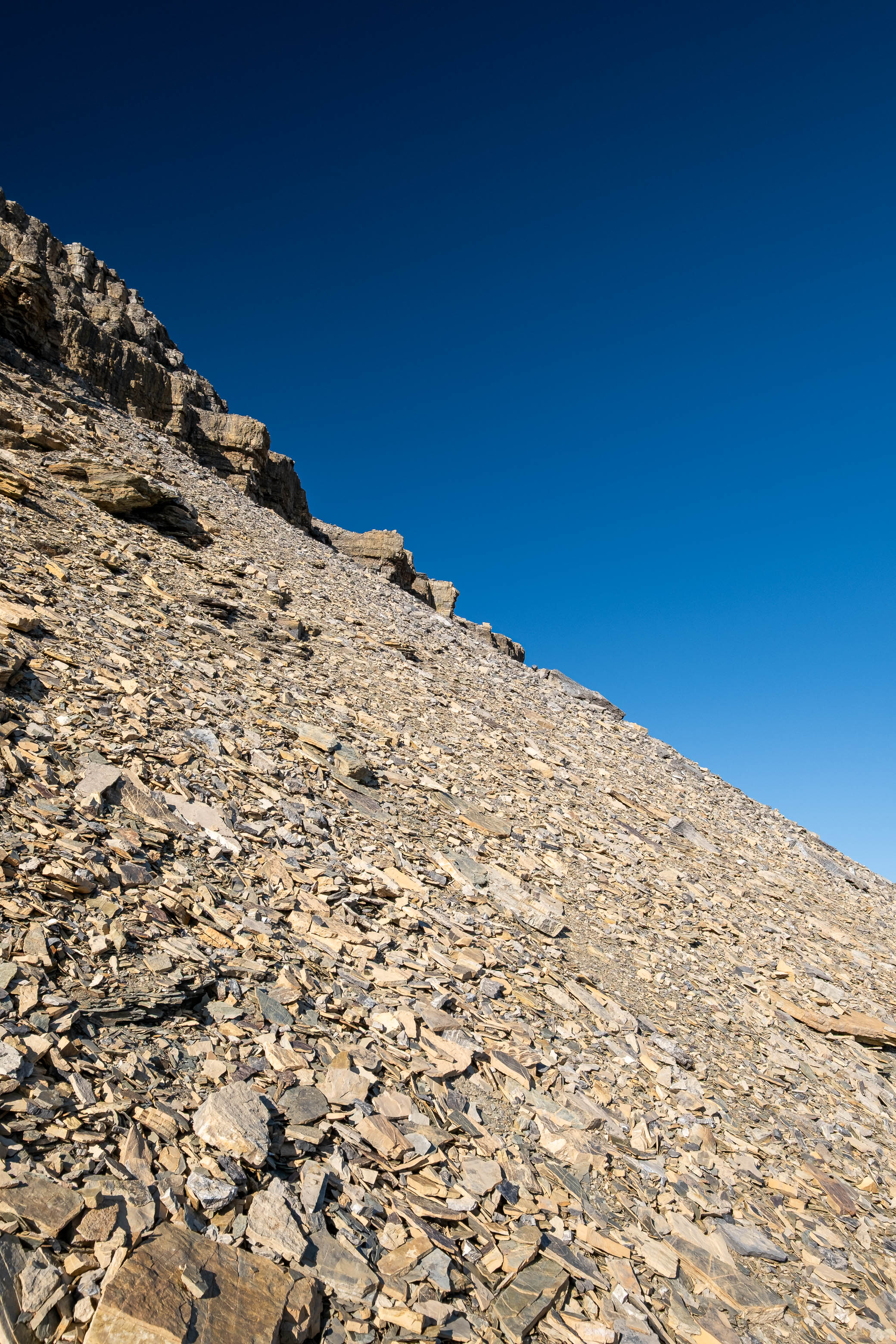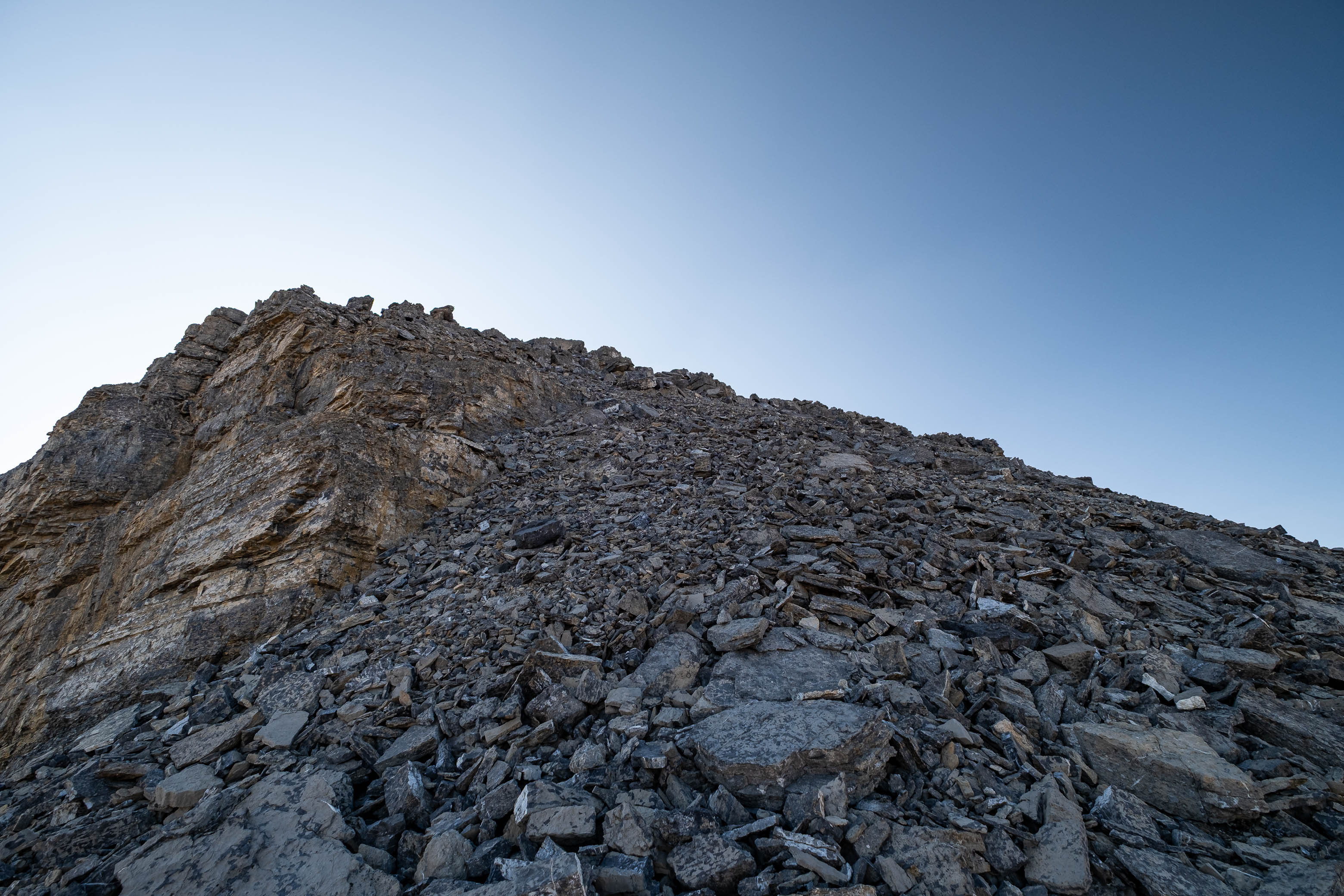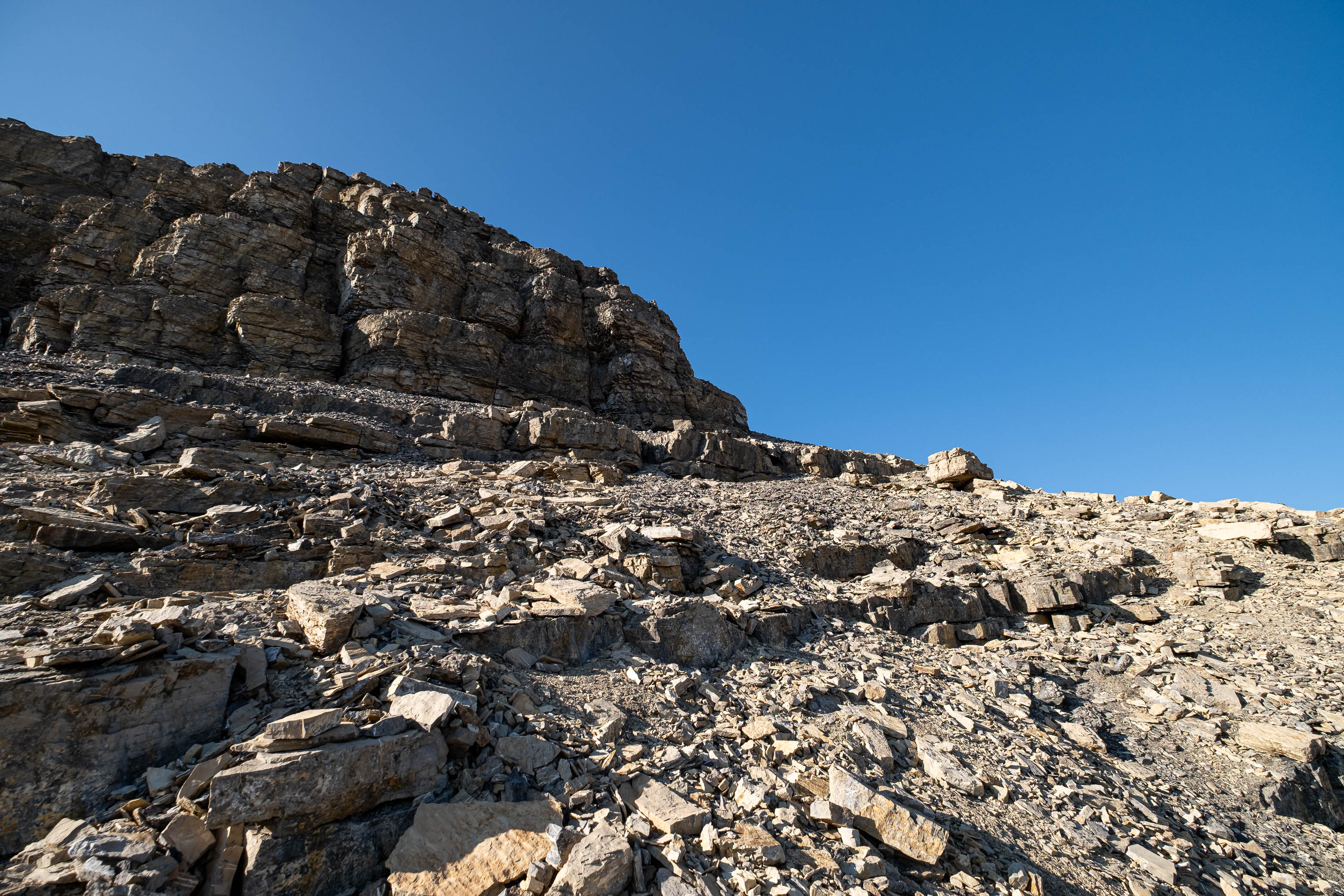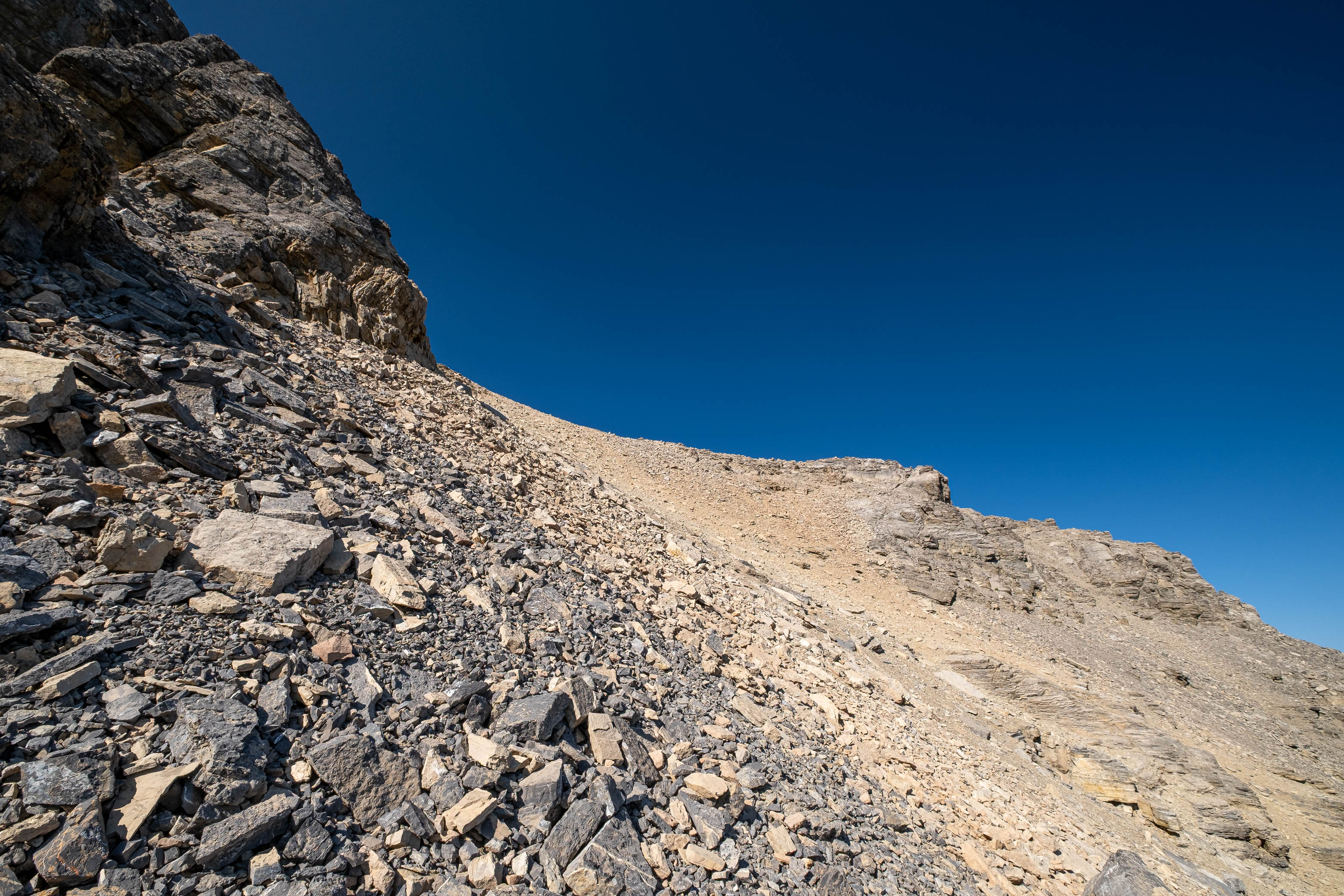 After successfully solving this first puzzle, it was right on to the second as Loudon's 3100 meter false summit reared up in front of me. I knew that every minute I wasted meant another minute of my dad waiting and worrying, and this thought alone was enough to push me into a higher gear as I powered off towards the next obstacle. I quickly picked out a direct line up the stepped terrain ahead, traversed a short distance below the first set of cliffs, and crossed my fingers as I started the loose 400 m grind to the false summit, desperately hoping my route would work.