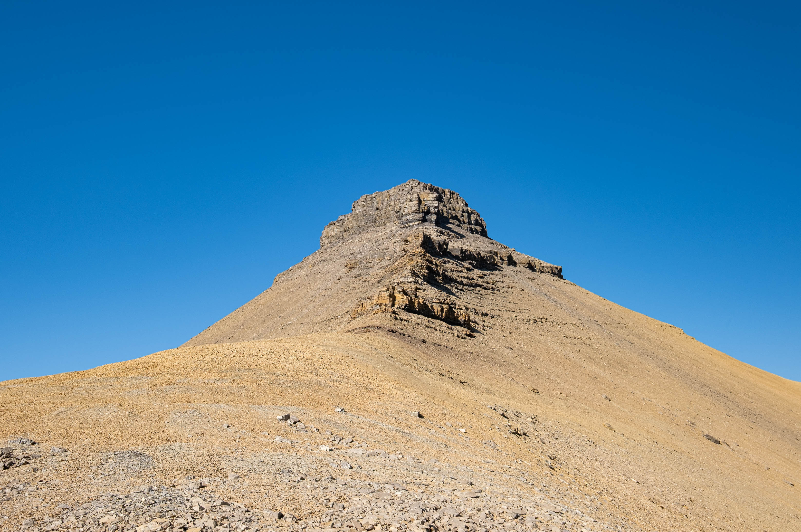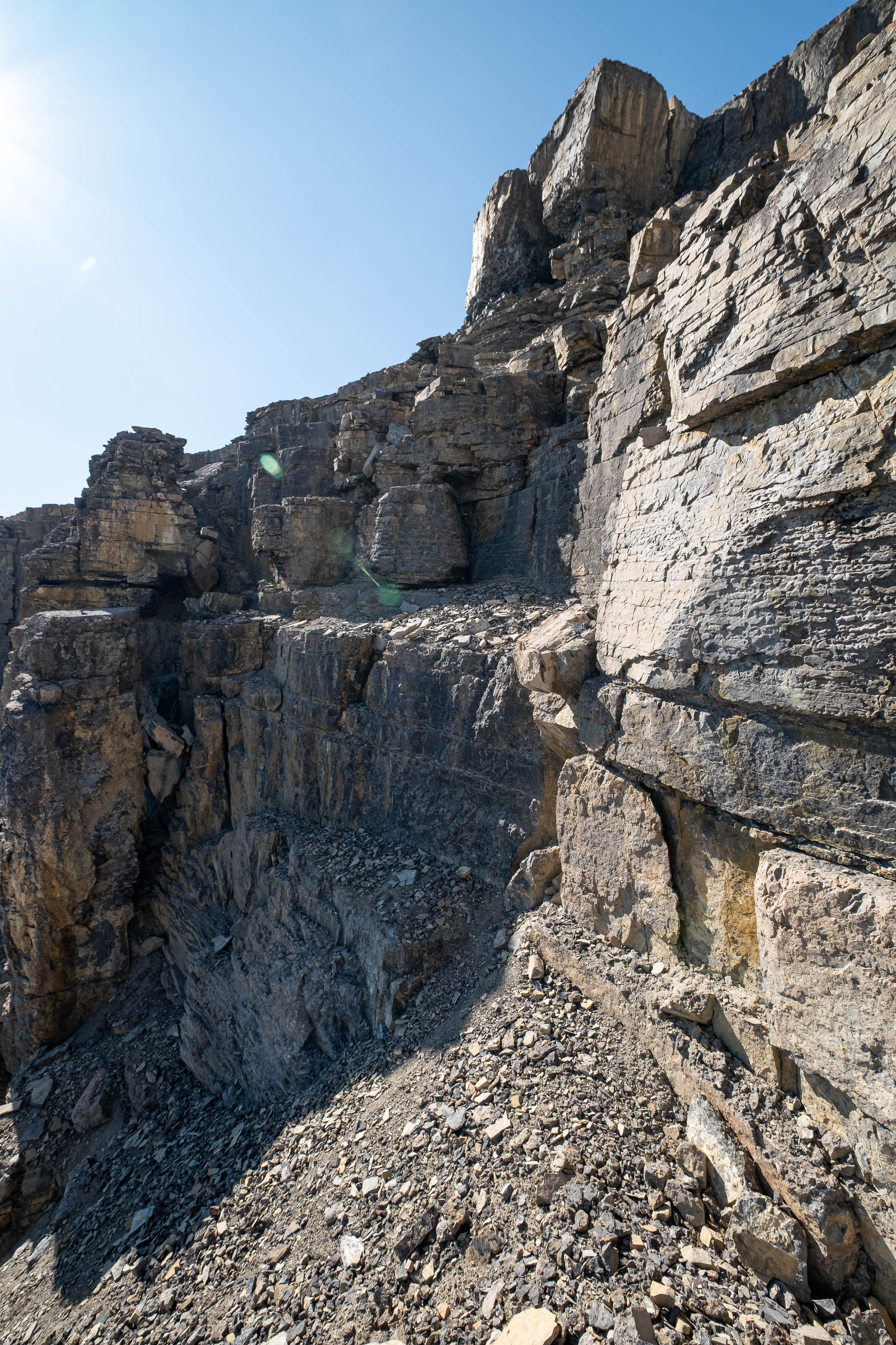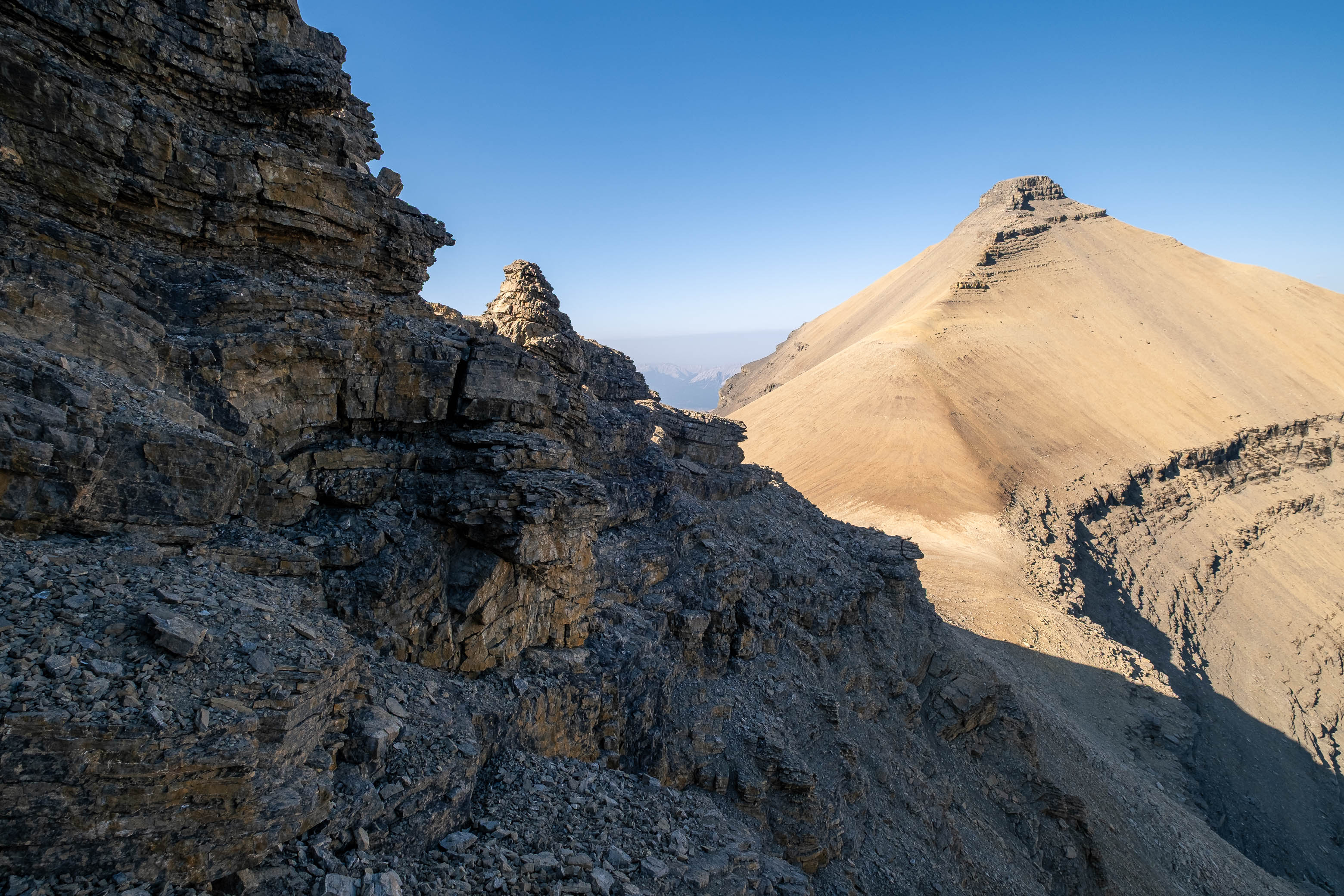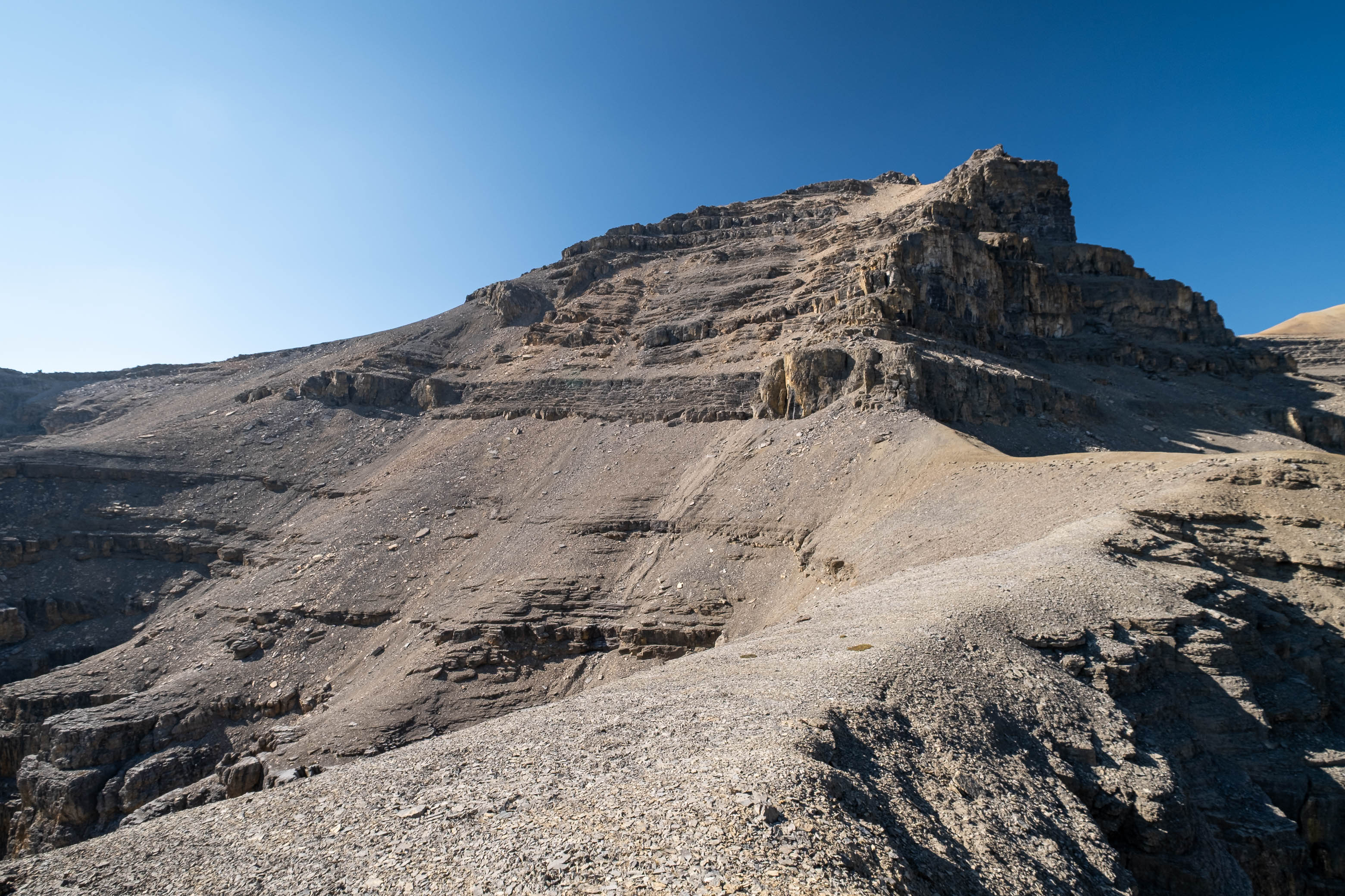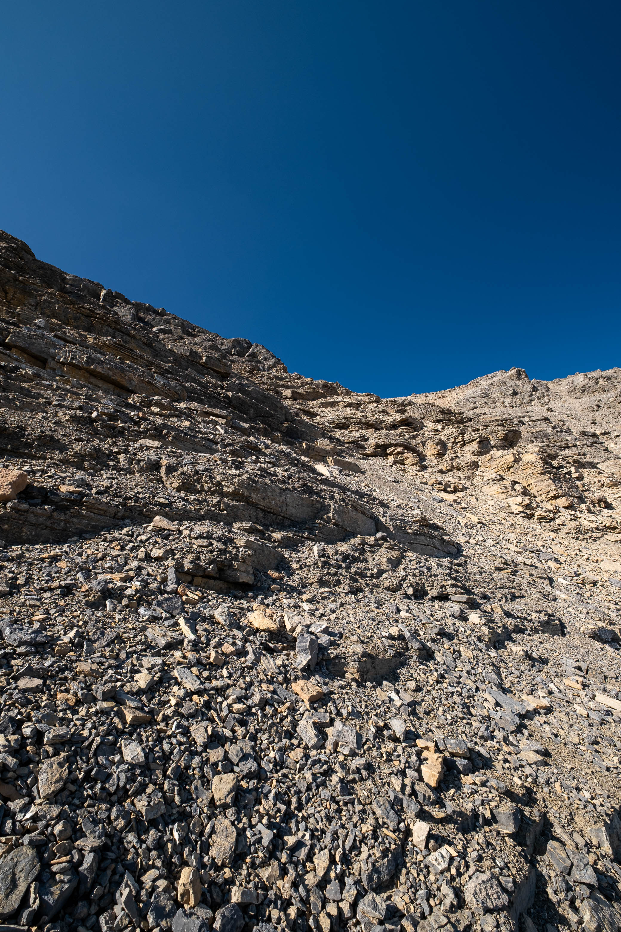 After successfully solving this first puzzle, it was right on to the second as Loudon's 3100 meter false summit reared up in front of me. I knew that every minute I wasted meant another minute of my dad waiting and worrying, and this thought alone was enough to push me into a higher gear as I powered off towards the next obstacle. I quickly picked out a direct line up the stepped terrain ahead, traversed a short distance below the first set of cliffs, and crossed my fingers as I started the loose 400 m grind to the false summit, desperately hoping my route would work.