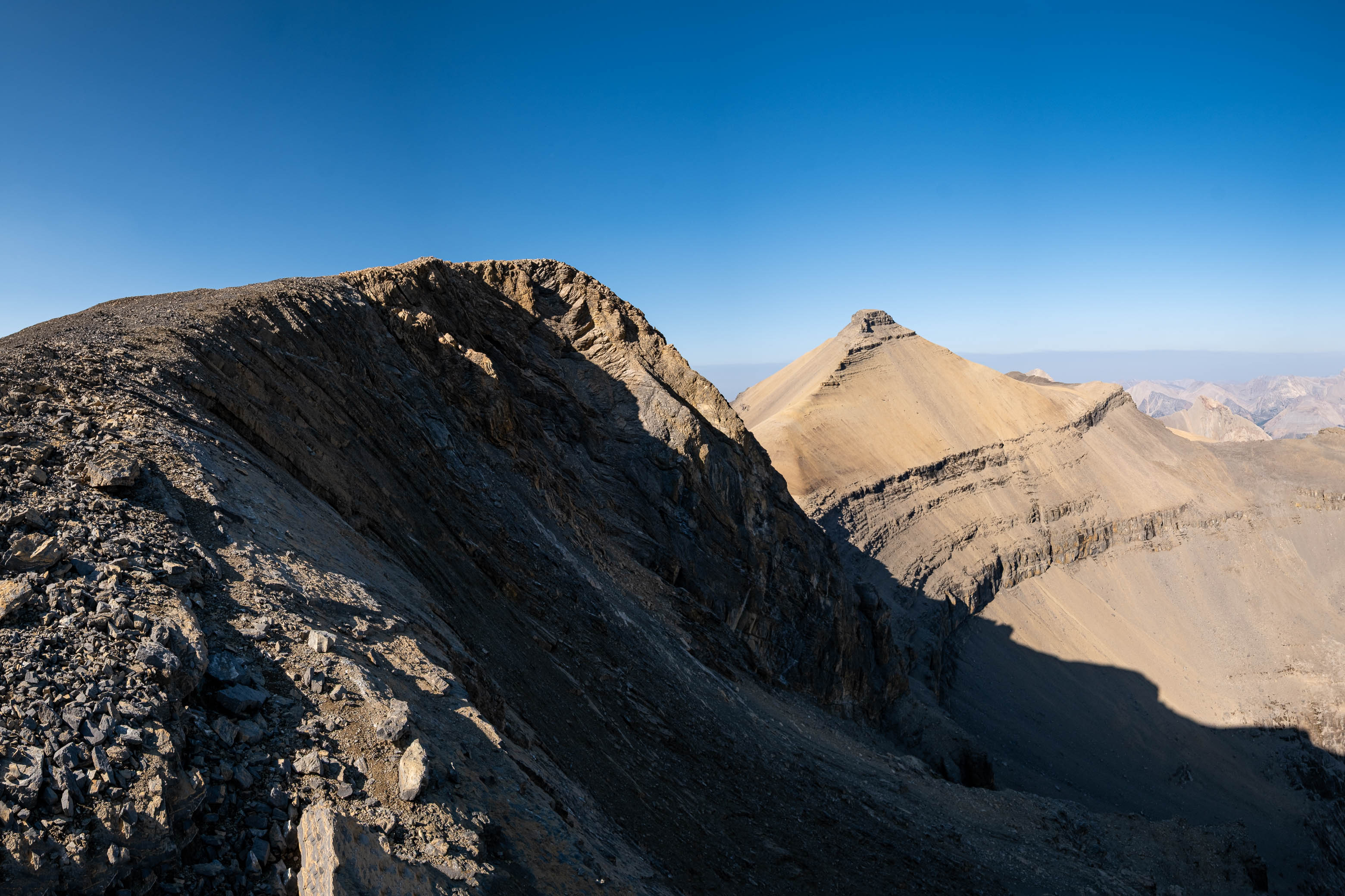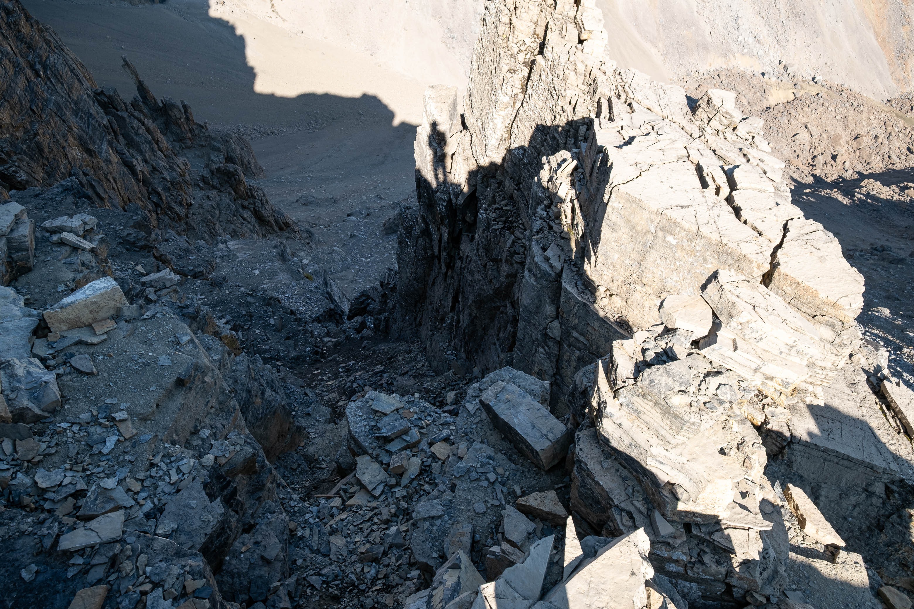 What started out as the most innocent scree slope I'd ever seen, abruptly crumbled away to a narrow, rotten ridge of precariously stacked blocks, and with steep drops down to the valleys on either side, any confidence that I had building just moments ago was wiped away in an instant. I gazed longingly across the ~ 100 meters of gnarly terrain to the once again benign ridge below, but ultimately knew at first glance that this was way above my pay grade, especially solo. Loudon's summit block, that seemed just out of reach moments ago, now felt miles away, but I'm not one to give up without a fight, and decided to see if a route traversing the incredibly steep and loose, downsloping ledges on the right (south) side of the ridge would go.