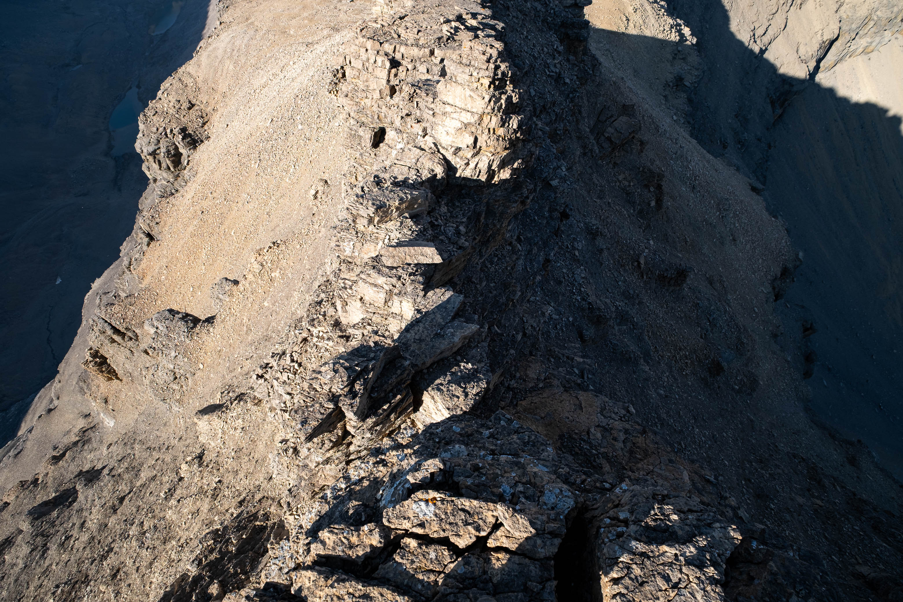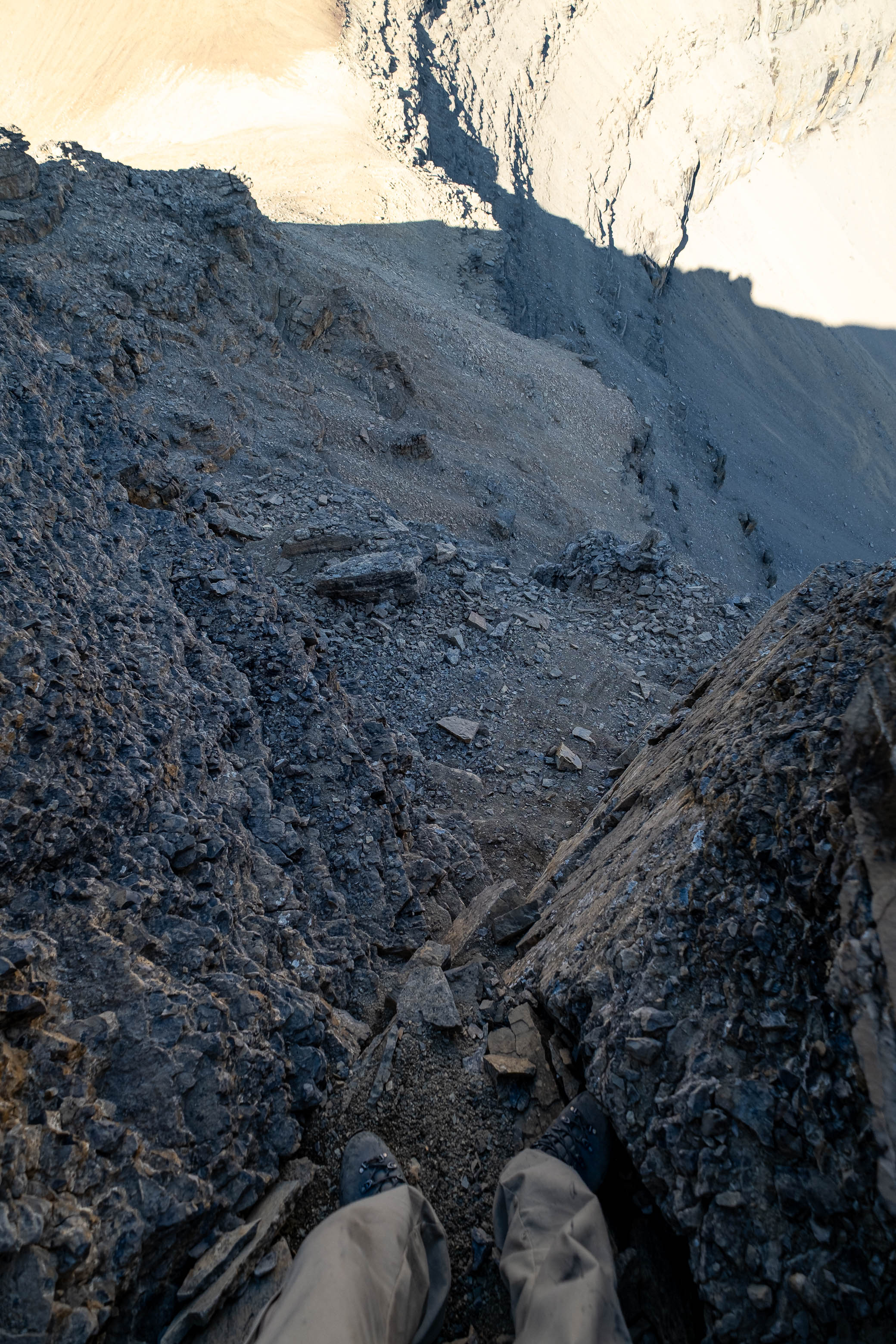 Having already gone through the motions, I now knew exactly what I had to do to overcome this obstacle and did my best to block out the world around me, focusing only on the rock directly beneath my feet as I delicately retraced my steps across it. Reascending the ridge definitely felt easier than blindly downclimbing it had, but I still felt like a weight had lifted off my shoulders as I stepped off the crumbly, exposed terrain and back onto "solid" ground, knowing the worst was now behind me for good.