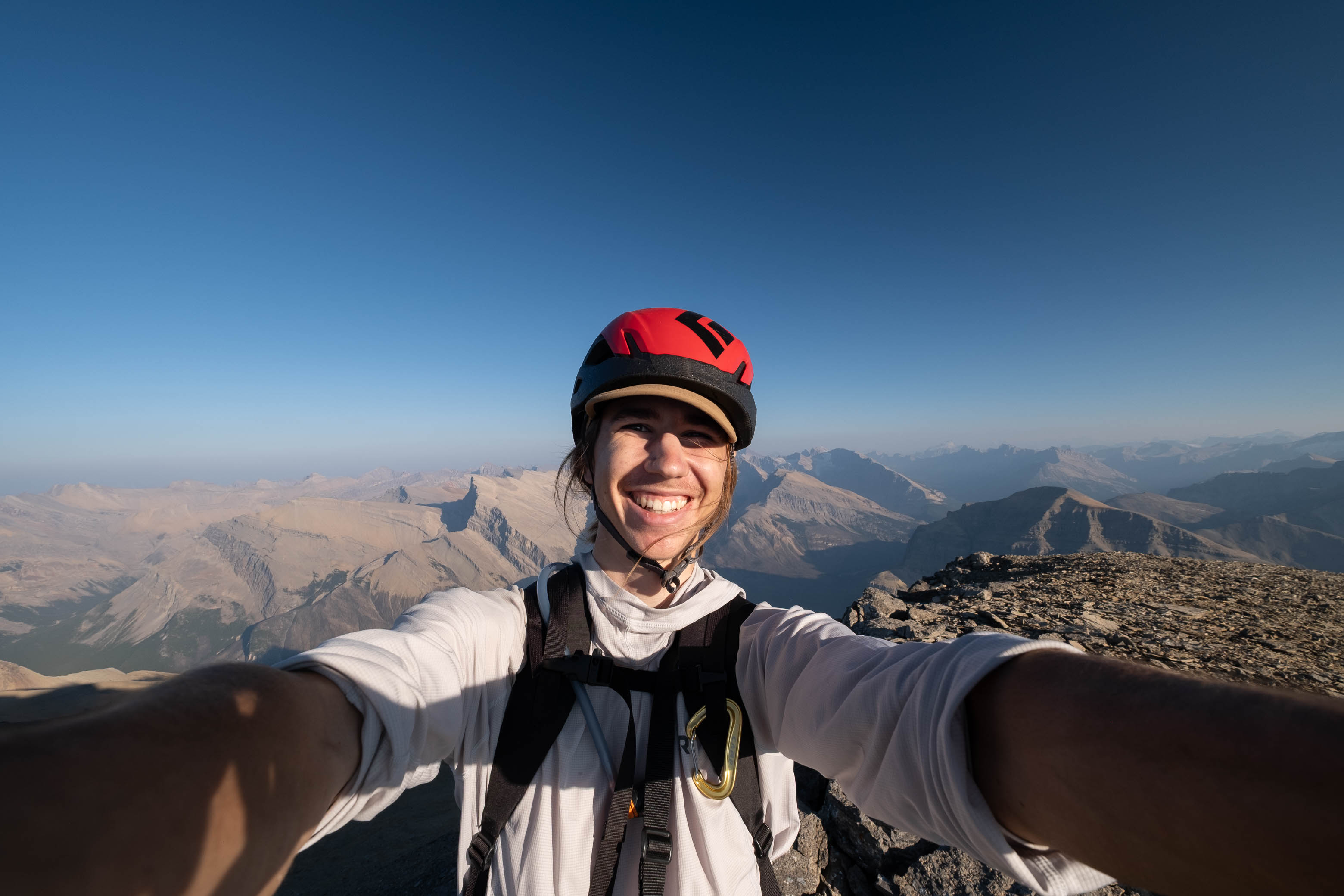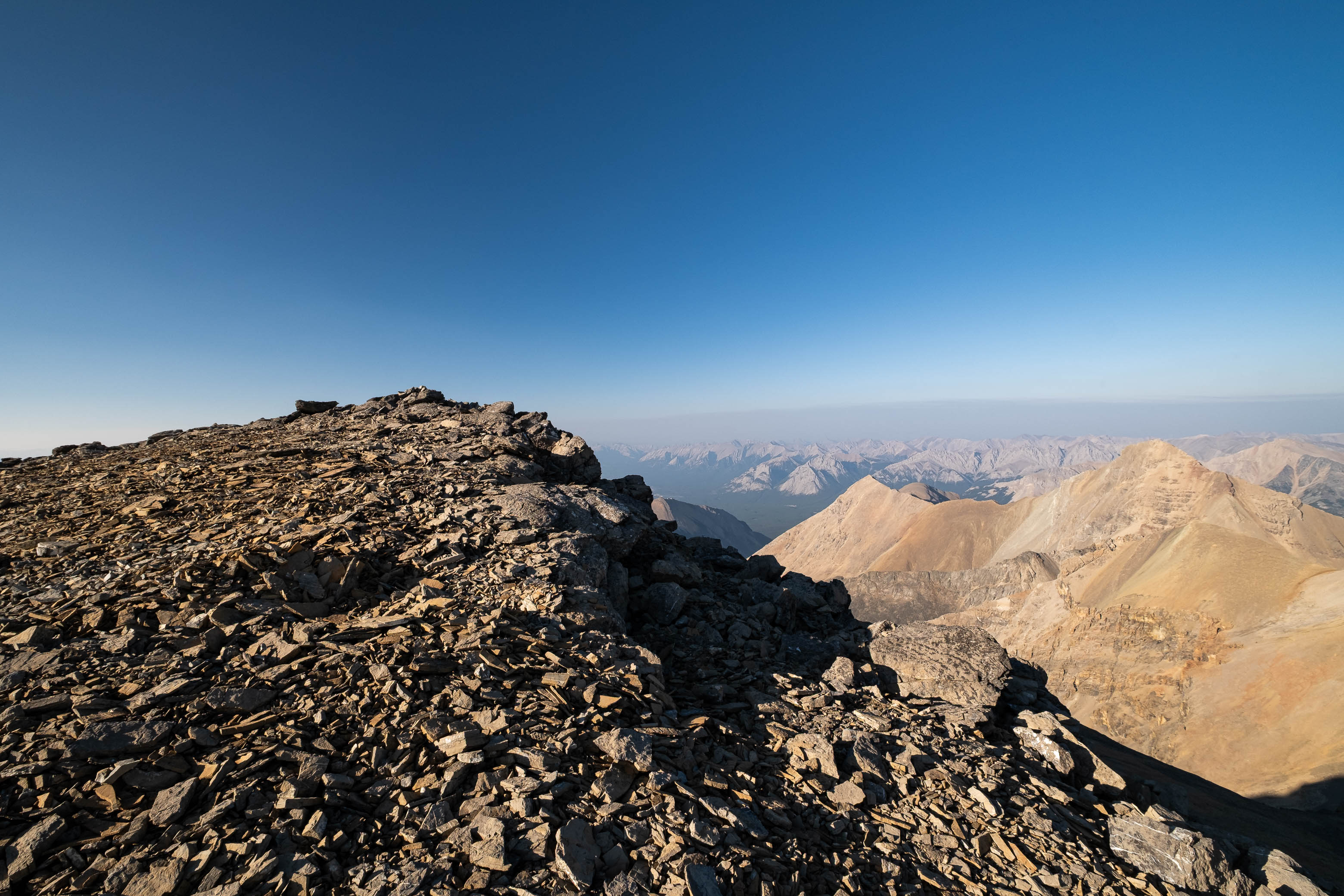As I made the final few steps to the summit cairn I was hit with a wave of emotions. After coming so incredibly close to turning around, I was actually about to stand on the summit of this mountain!! I dropped my pack at my side and just stood there in a daze for a few minutes, admiring the far-reaching, albeit hazy, evening views, feeling so incredibly lucky to be standing atop such a big and remote peak. There truly is nothing like exploring the unknown and stepping foot where only a handful of humans have ever been before! It's moments like this that make life worth living!