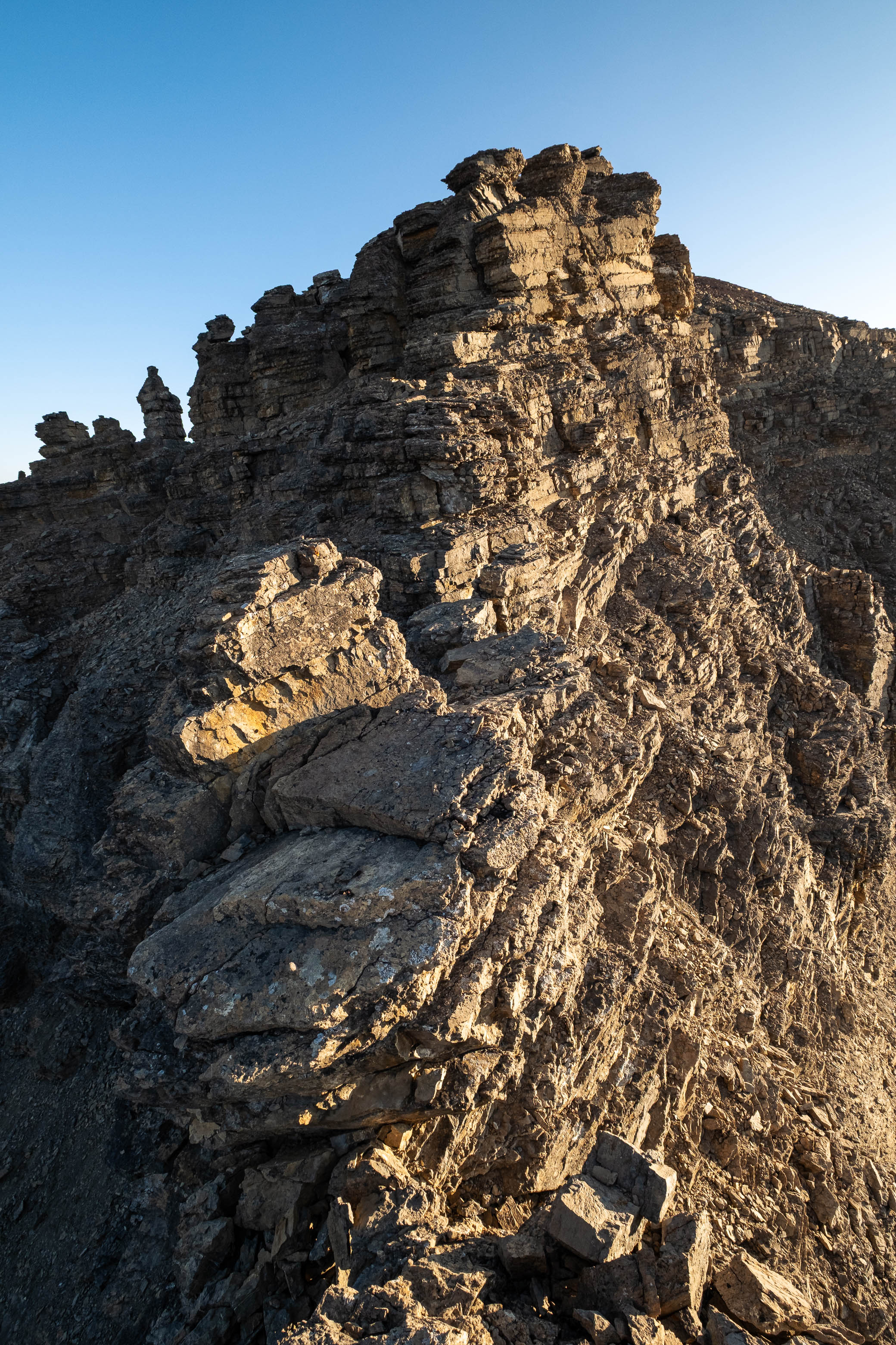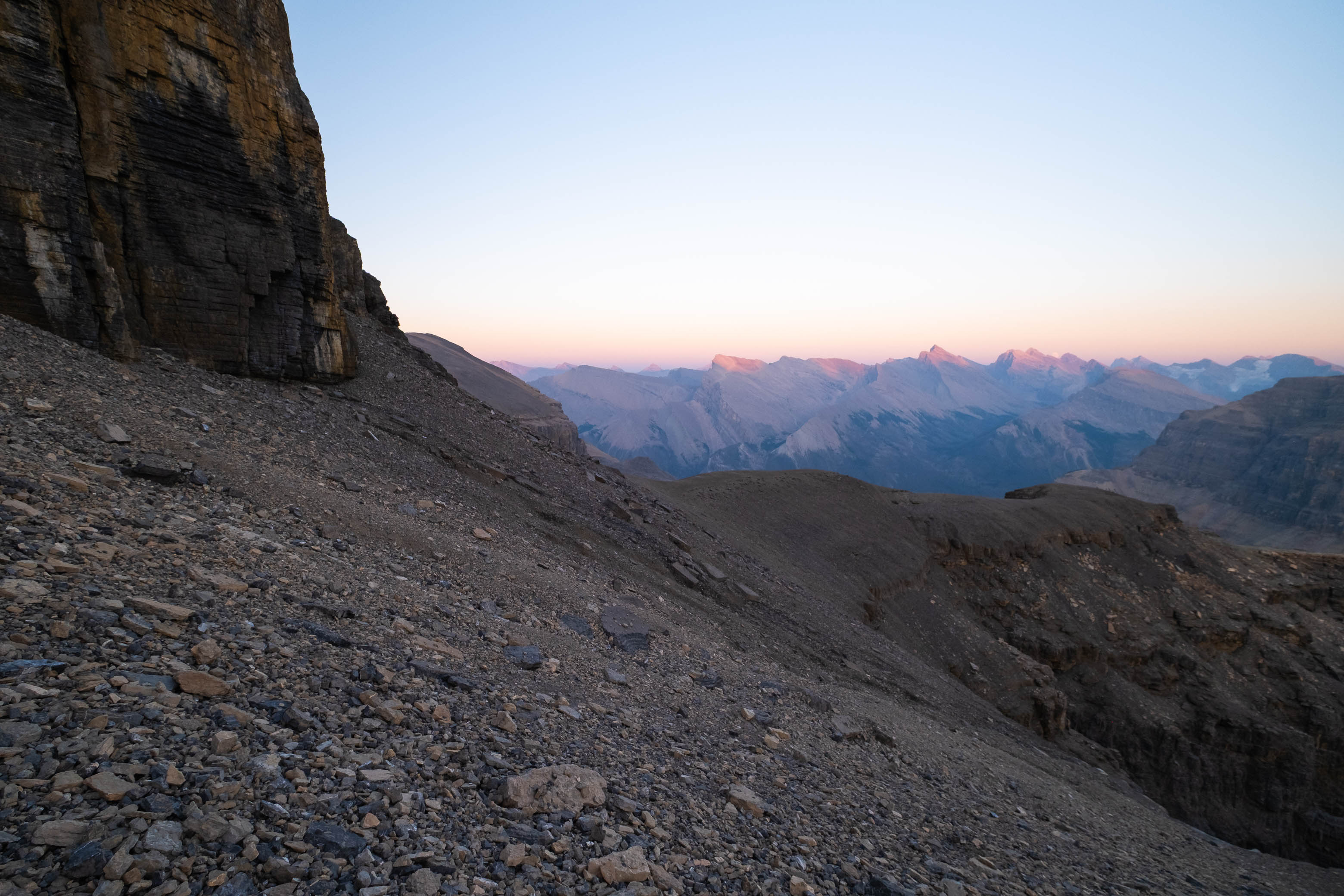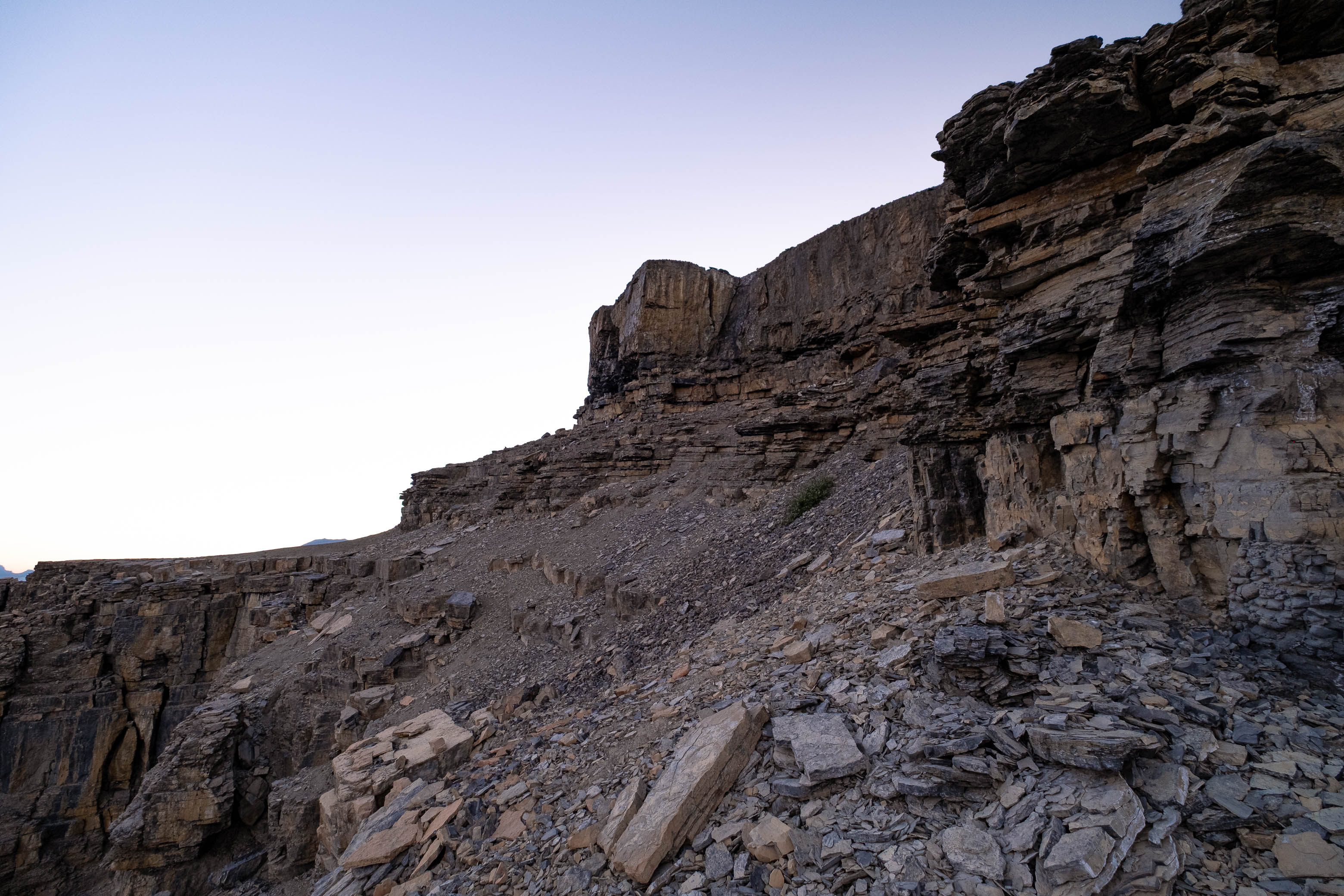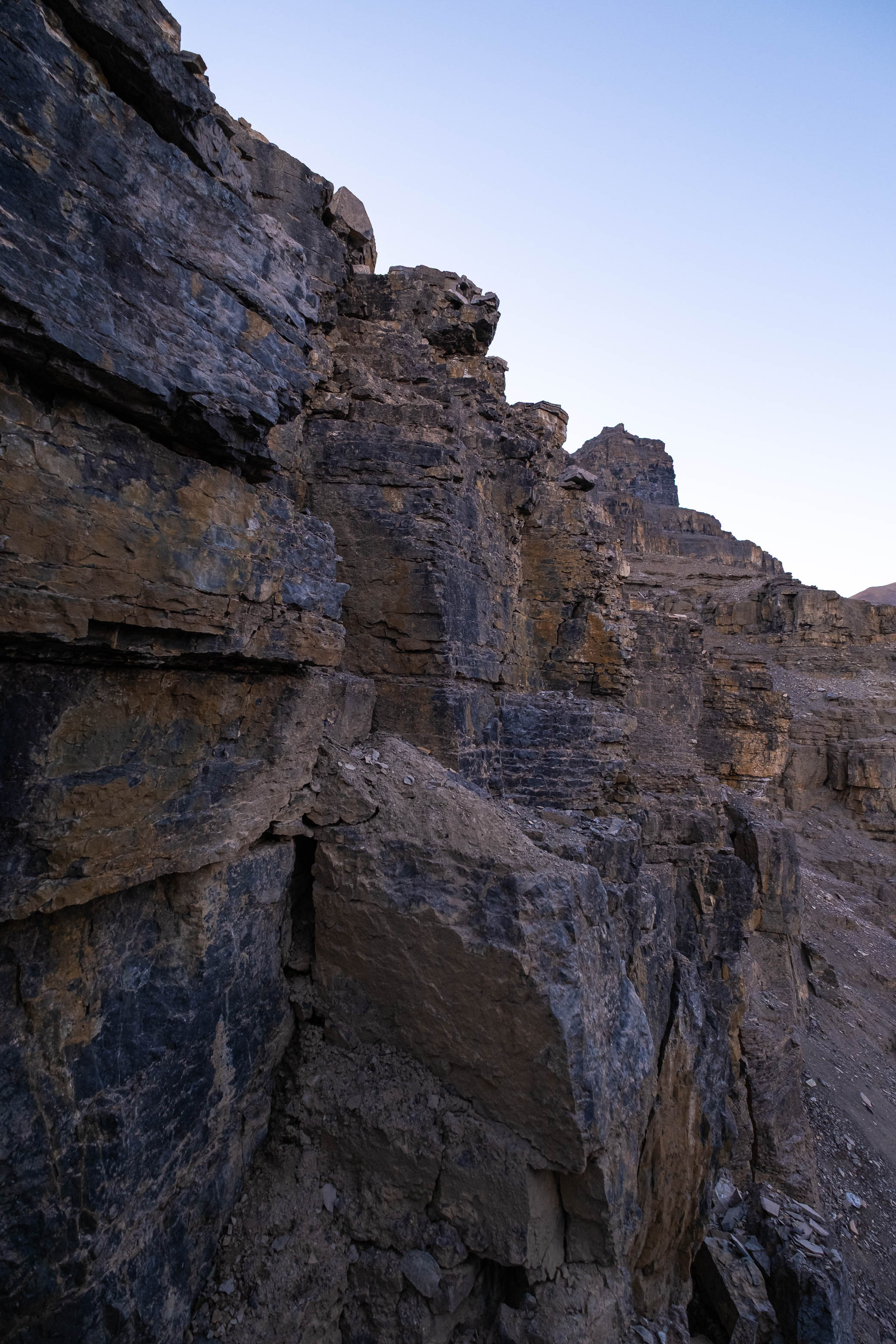 The sun had officially set when I arrived at the base of the false summit's loose, upper SE face, but there was still enough light to see by as I navigated the lower series of broken cliffbands - posing no real challenges, having already downclimbed each step earlier while trying to find a route for my dad.