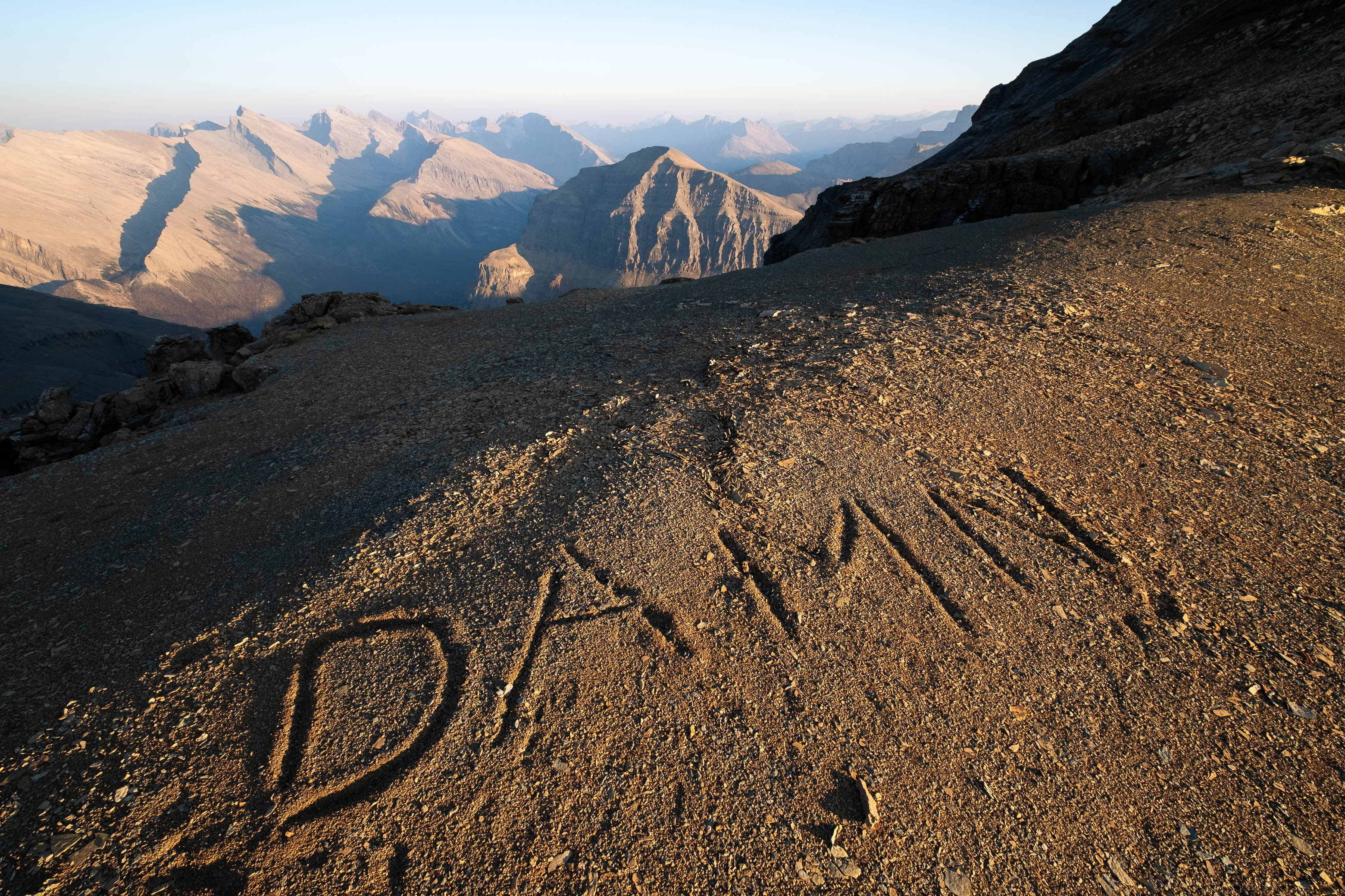 As I started up the final stretch of gentle ridge to the false summit, I paused upon noticing something strange at my feet. Scratched in the dirt, and emphasized by a patch of light from the setting sun were the letters "D A M N". I chuckled. "Yeah, DAMN is right!", I thought to myself, thinking Doug and Eric had written it in the sense of, "Damn! That was one gnarly ridge!", but I later found out that it was actually Brett Pawlyk (the author of the recently published "David Thompson Country: A Scrambling Guide") who wrote it in defeat after being turned back from his attempt just two days before Doug and Eric! Three attempts in the last month?!?! Looks like this is turning into a popular mountain! 😉