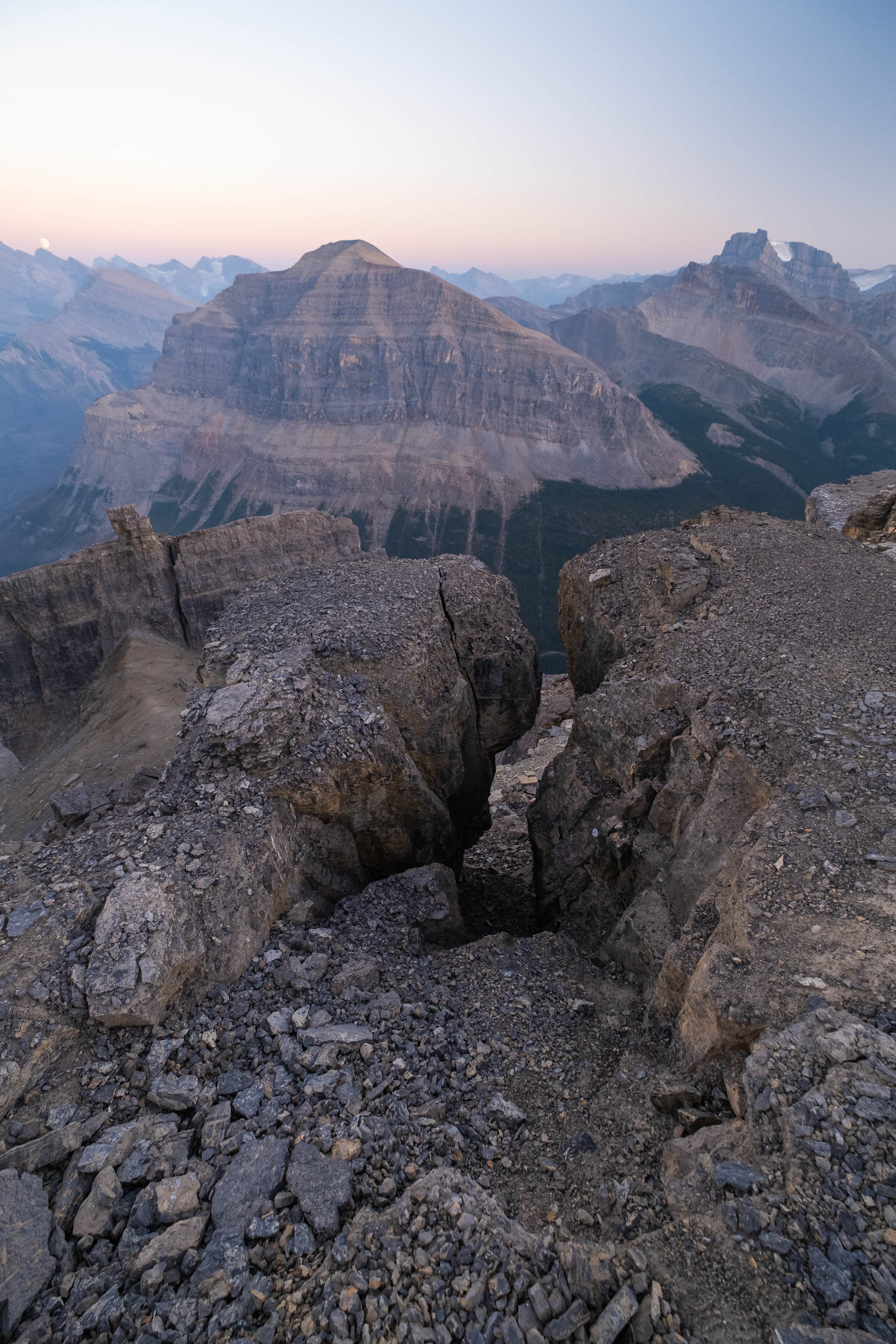 Even though I only had to drop about 100 meters down to the col between the false and true summits, losing any amount of my hard earned elevation was a major blow at this point in the day, and I tried my best not to think about having to re-ascend each and every step in a couple hours time as I slowly started jogging down the gentle ridge. My eyes were drawn to Loudon's intimidating summit block as I descended from the false summit, and I found myself already thinking one step ahead, scanning the cliffs for possible weaknesses and wondering if they were as troublesome as they looked from afar. Aside from this final puzzle that I'd have to solve, I was genuinely starting to feel like I had this ascent in the bag!