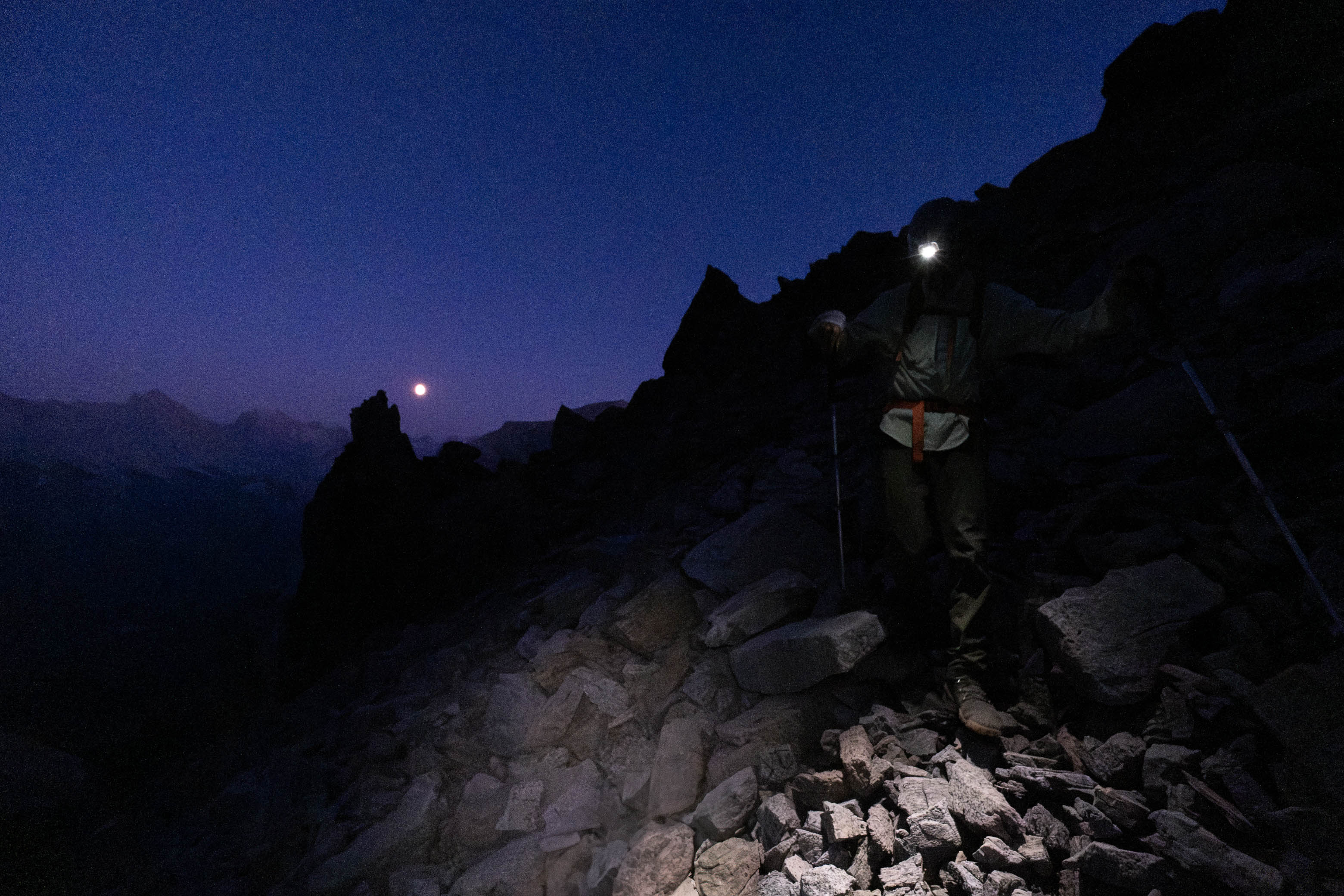 We were already pulling out our headlamps as we packed up and started down from the ridge, and as exhausted as I was, I pushed all my problems aside one last time and switched into "guide mode", taking the lead and searching for the most "knee-friendly" route to safely get my dad down to camp...and this was no piece-of-cake scree run that we could mindlessly descend! Instead, we had to navigate a mix of larger boulders, unstable rubble, and very loose scree, jumbled together with no obvious straight line to the bottom - Not an easy task when you can barely see 5 meters in front of you!