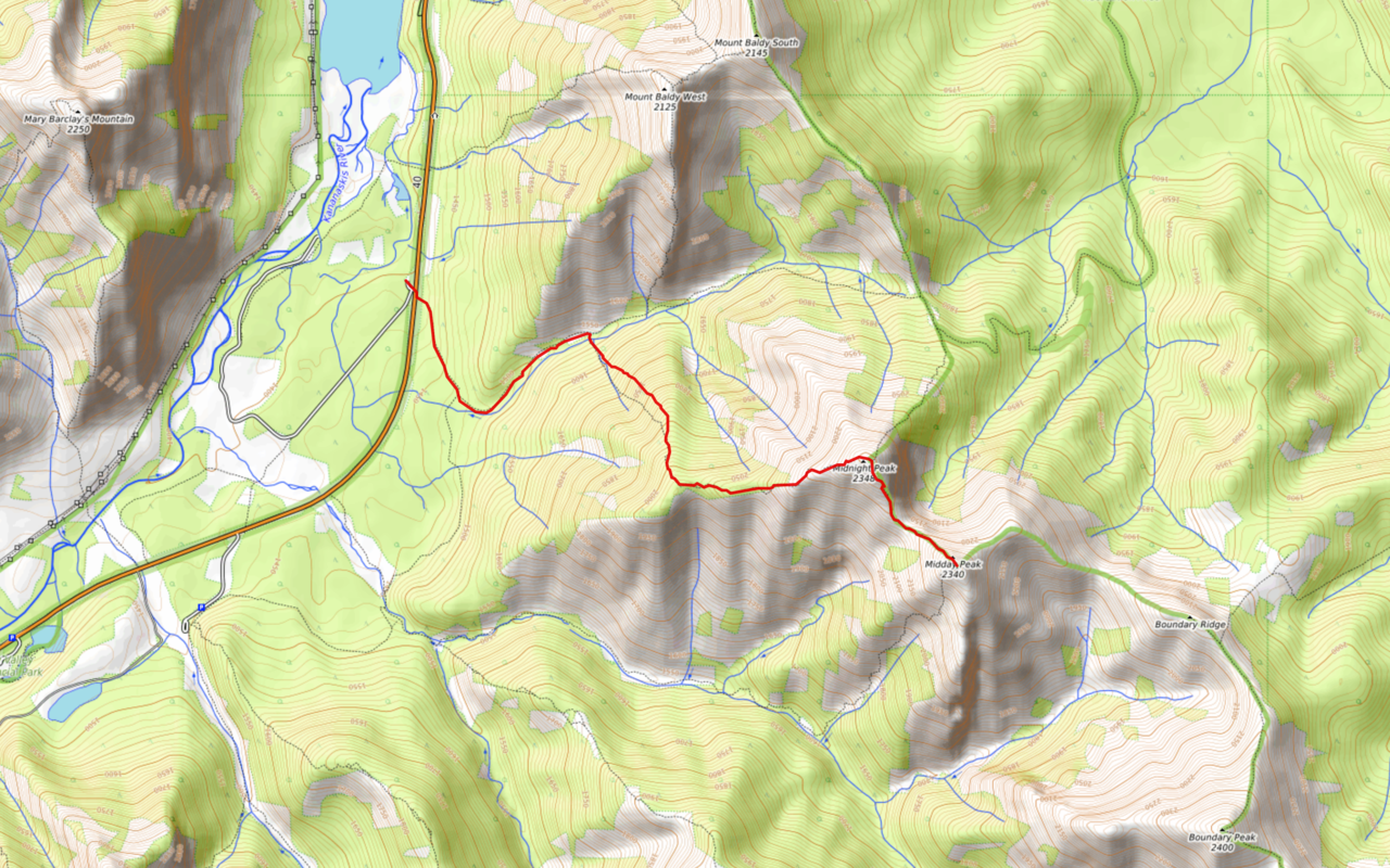 Looking back at our approximate route up to the north ridge, after rejoining with the Baldy Pass Trail.