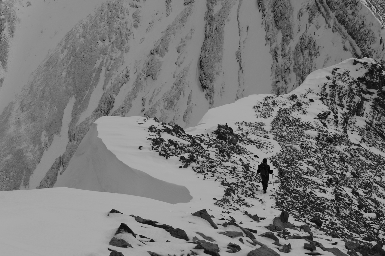Looking along the corniced ridge, as we retrace our steps up towards Midnight.