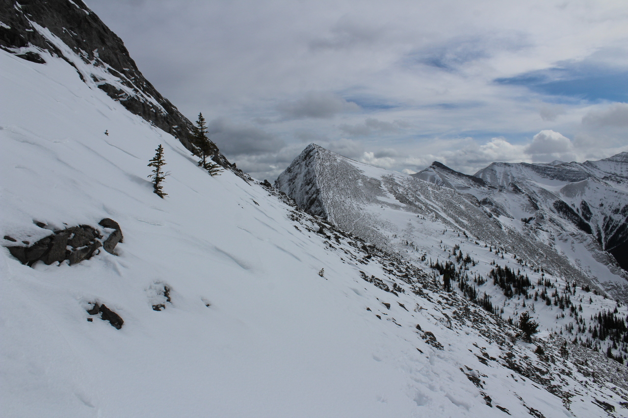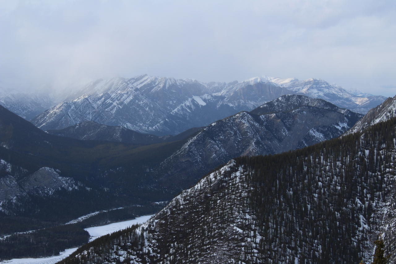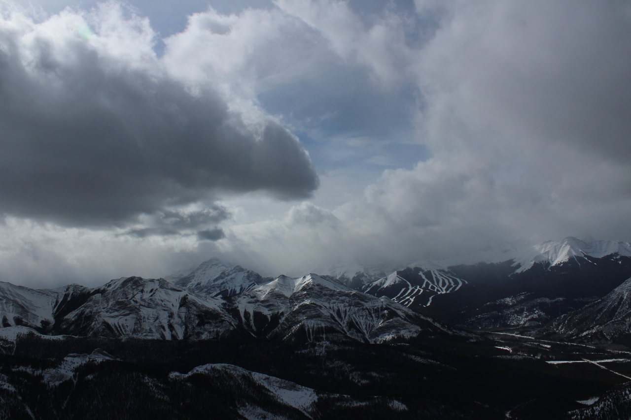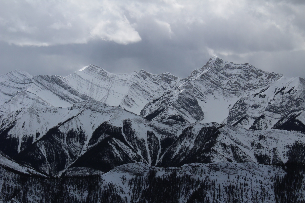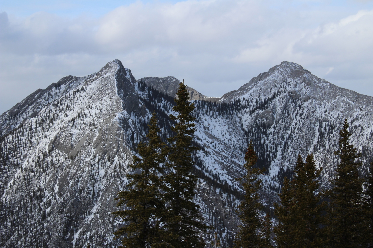 The cloud cleared up slightly to the north, revealing Goat Mountain (left), and Orient Point rising above Yamnuska, in the distance behind Yates Mountain (right).