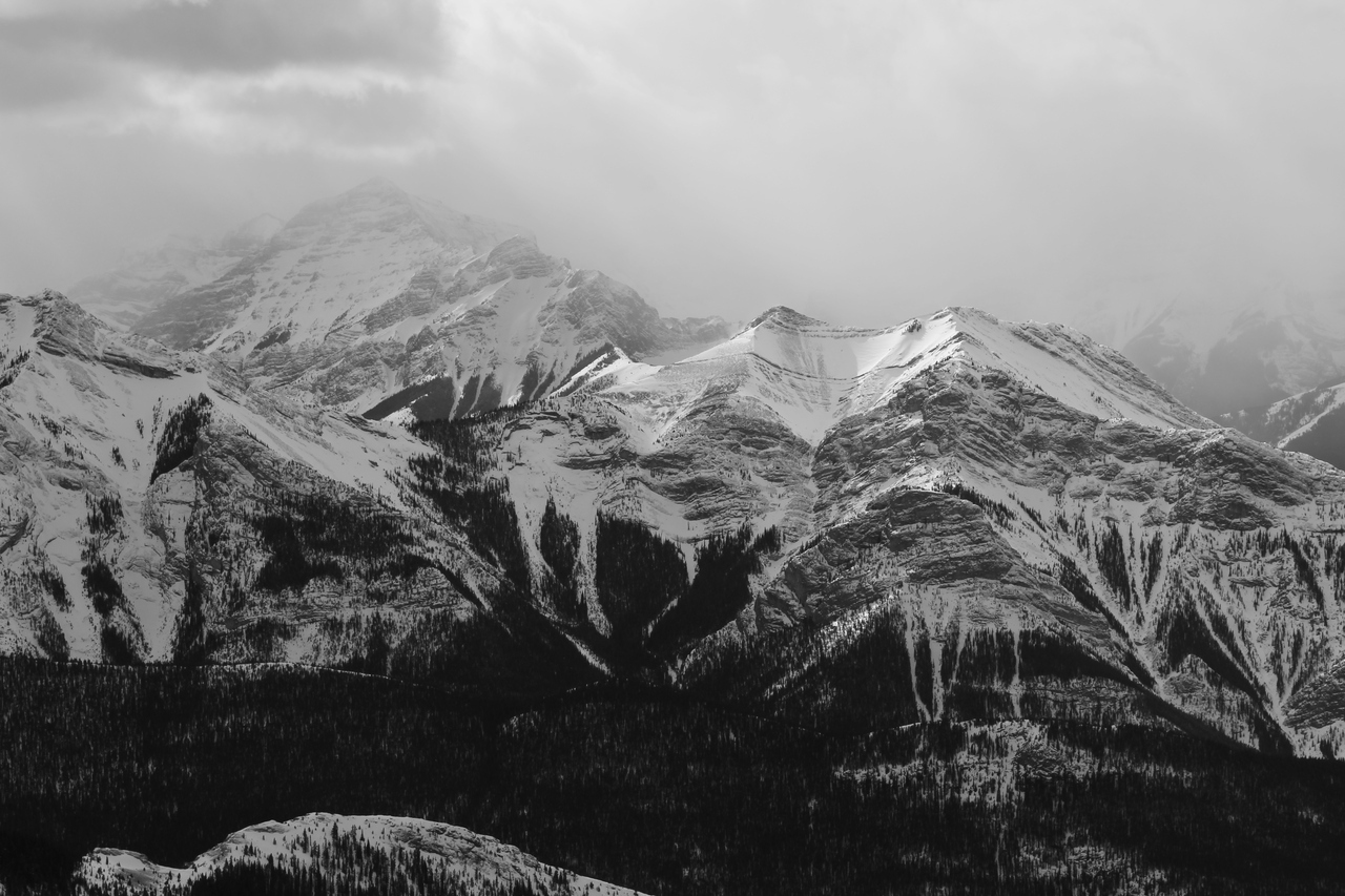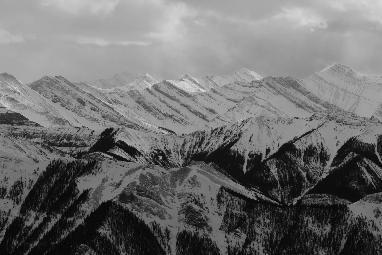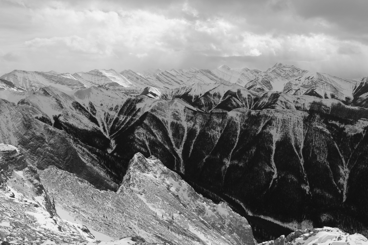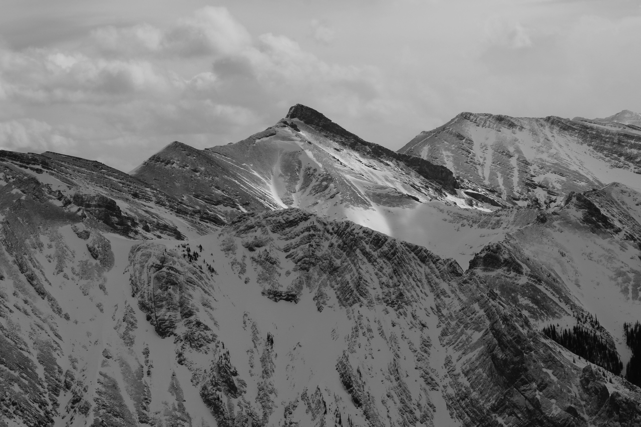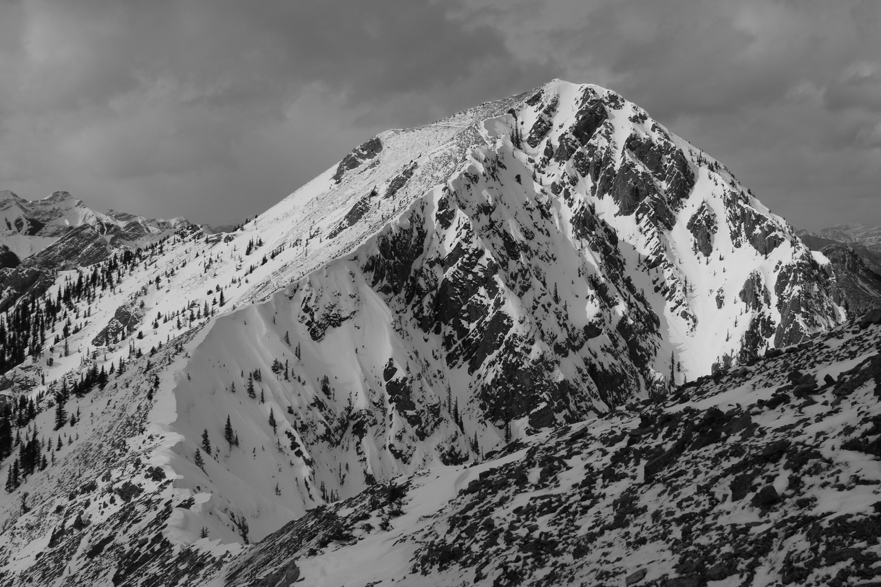 The cloud cleared up slightly to the north, revealing Goat Mountain (left), and Orient Point rising above Yamnuska, in the distance behind Yates Mountain (right).
