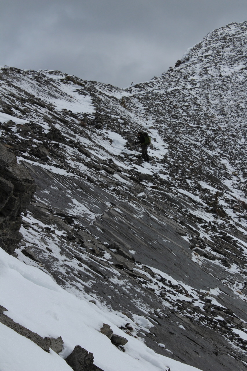 This short slab crossing is the only real obstacle between the col and the summit. Could be troublesome if snow-covered...
