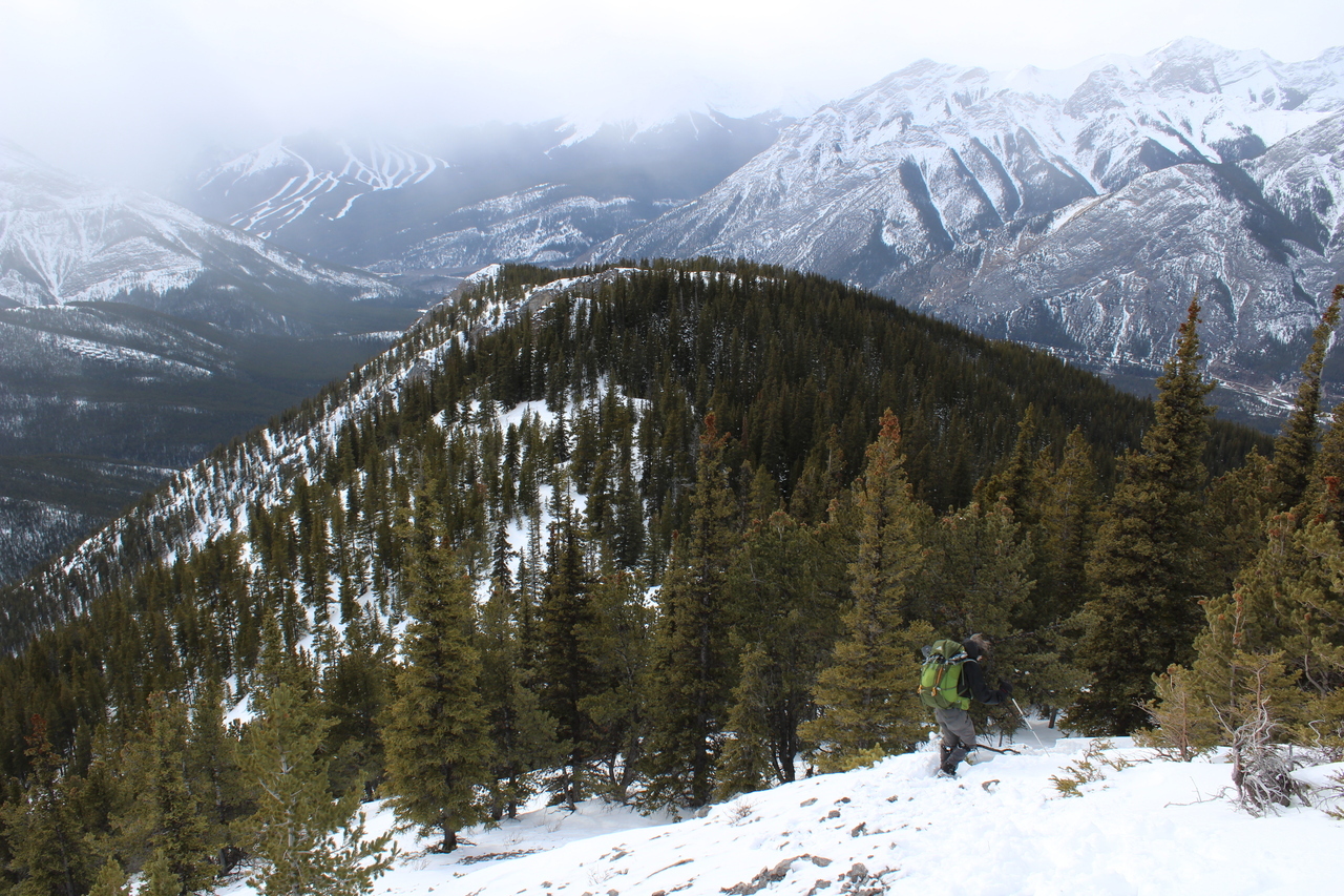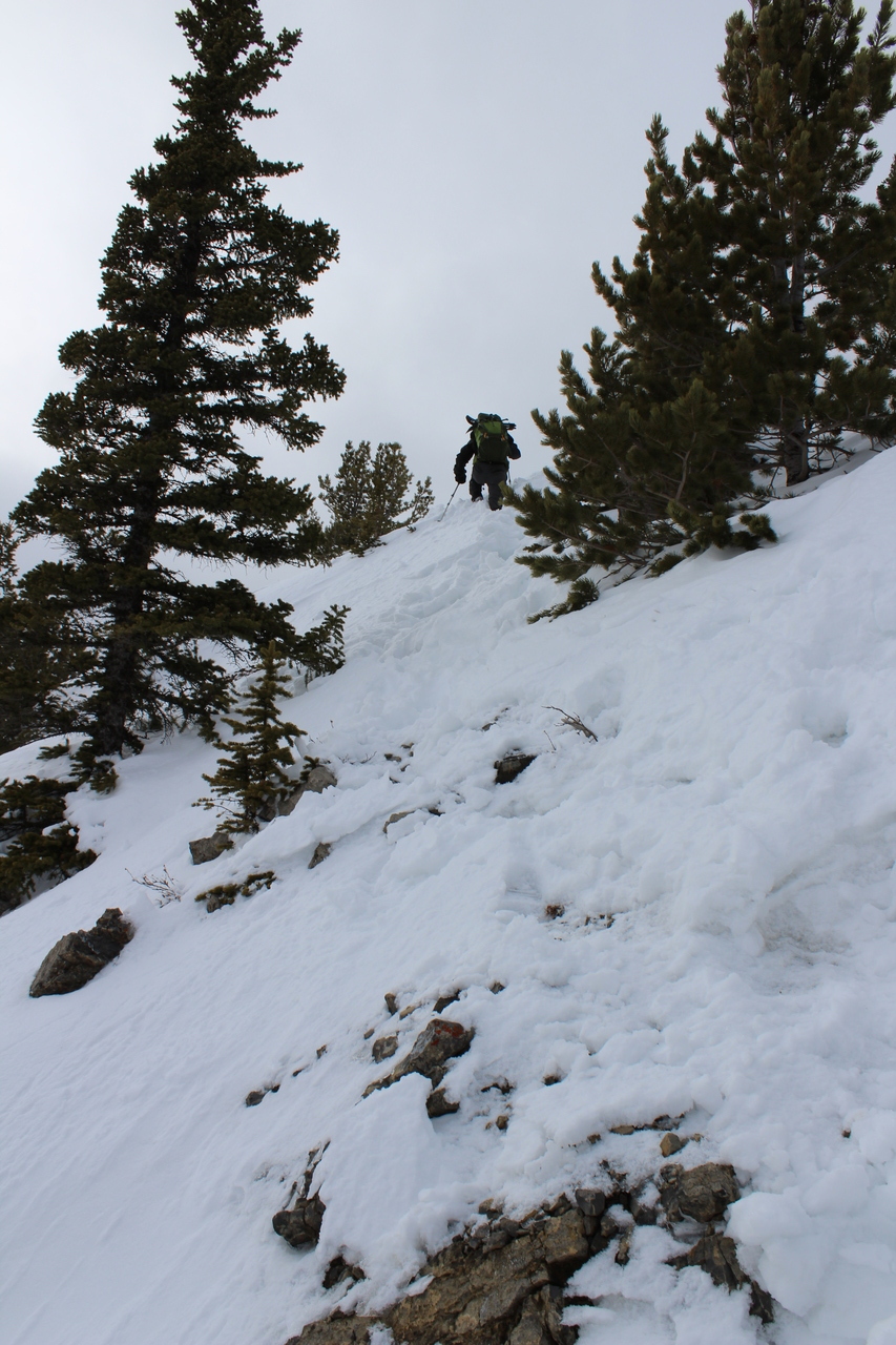 Making our way through the last bit of deep snow, before leaving the north ridge for the drainage below. Having a group of four follow our tracks (in two directions!) since we first made them, packed them down quite nicely! Although not the most pleasant at times...we were (surprisingly) able to make it the whole way down without snowshoes.