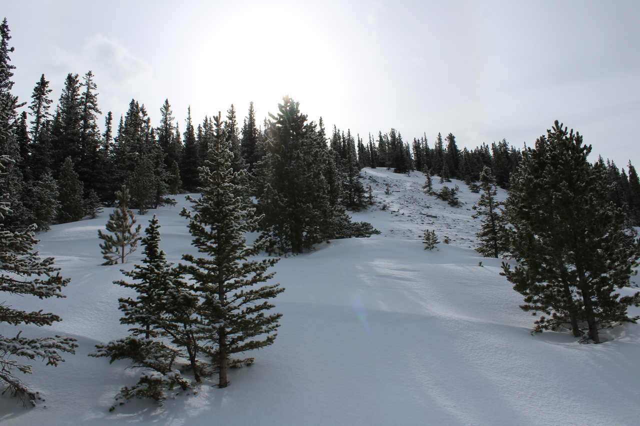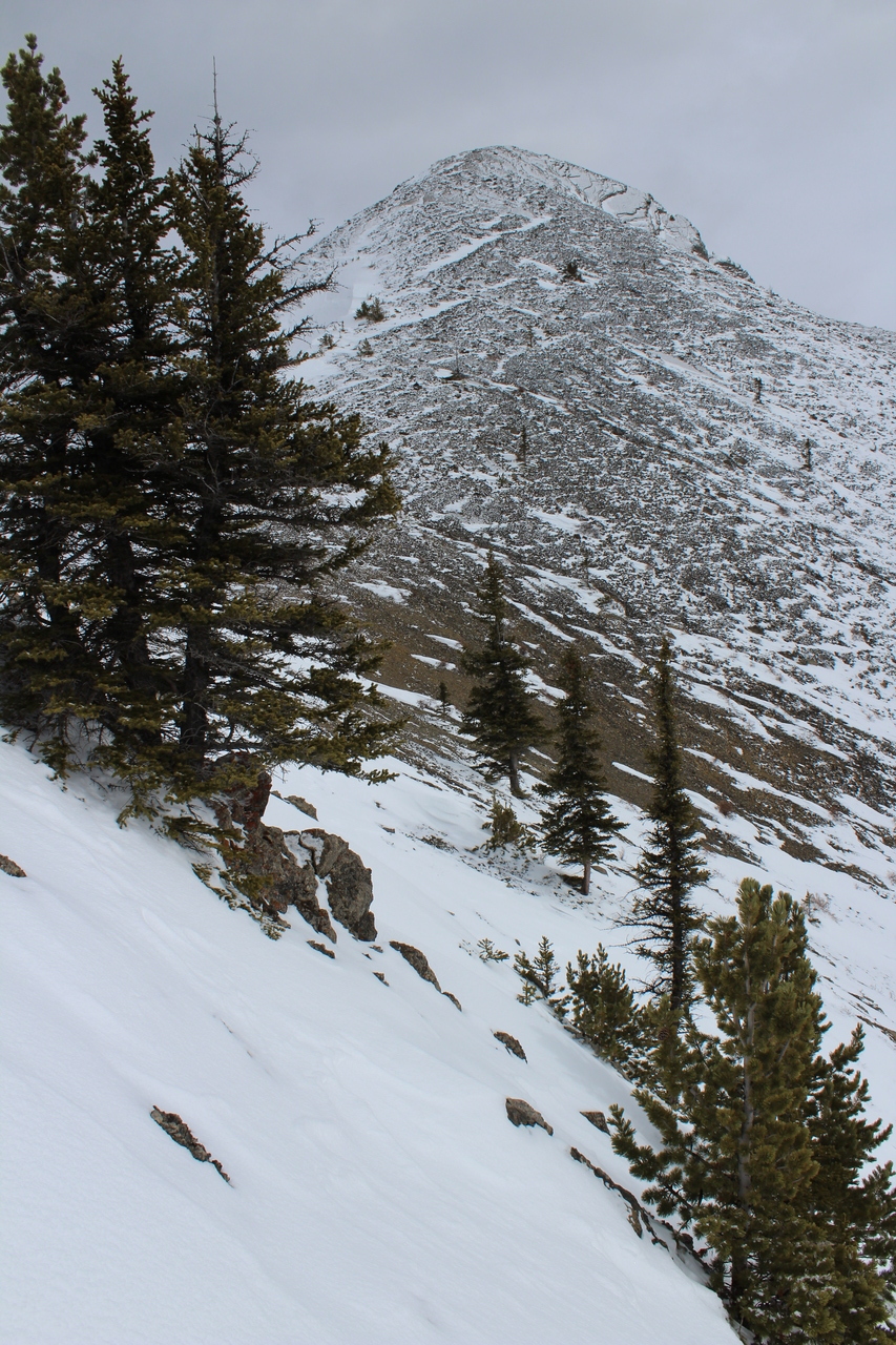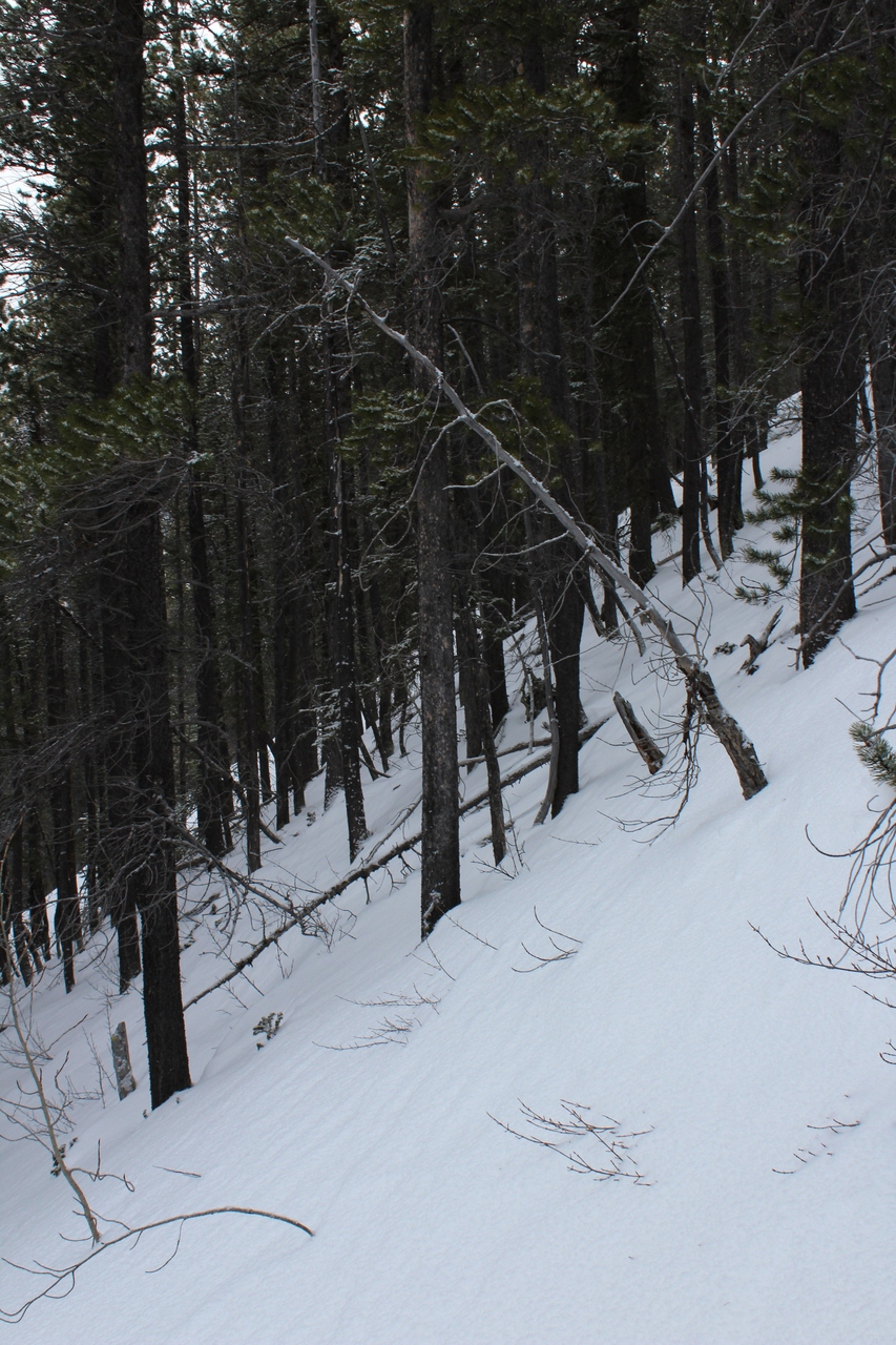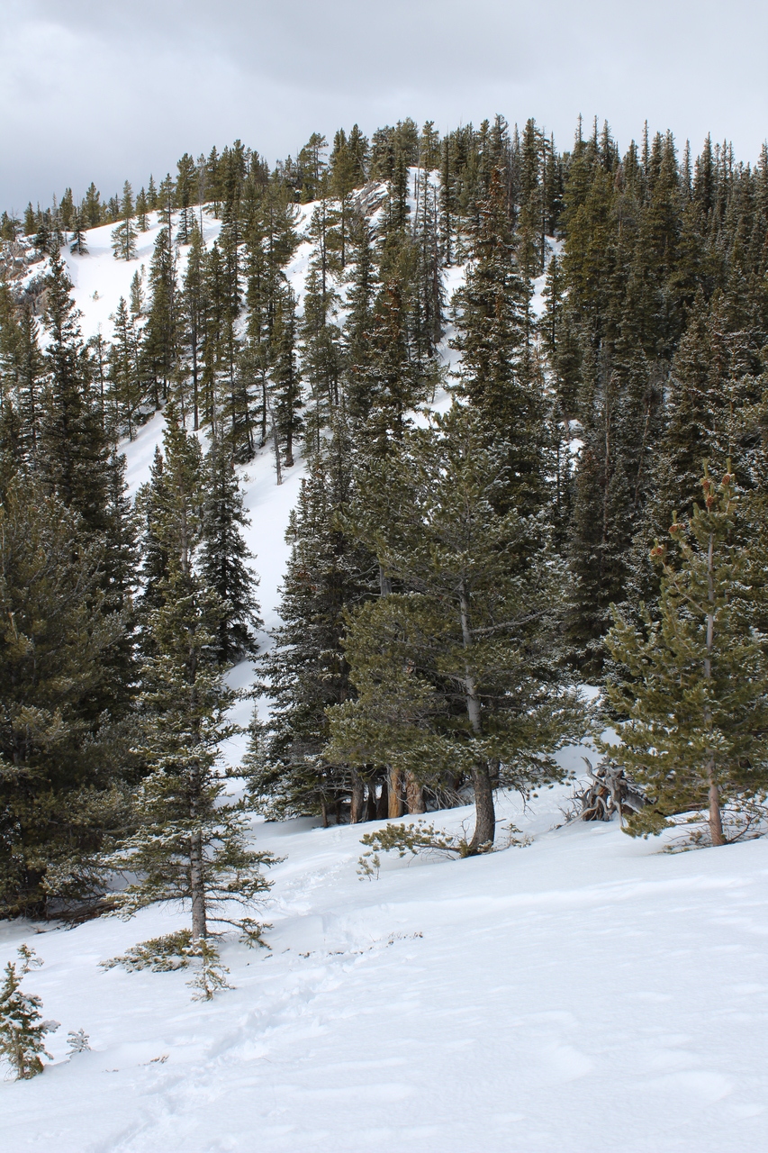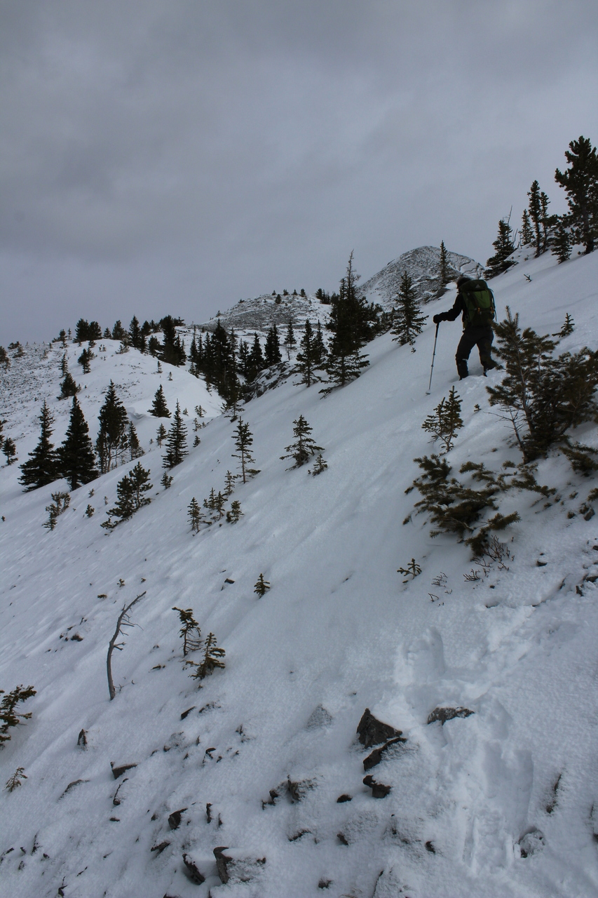 Looking back up to where we gained Midnight's west ridge after losing some hard earned elevation. Try not to get your hopes up, thinking it'll be smooth sailing once you reach the west ridge, like I did! I was super eager to escape the north ridge, hoping to find the west ridge rocky and windblown...Instead we found it to be treed...therefore sheltered...and therefore every bit as snowy as what we just thought we'd escaped!
