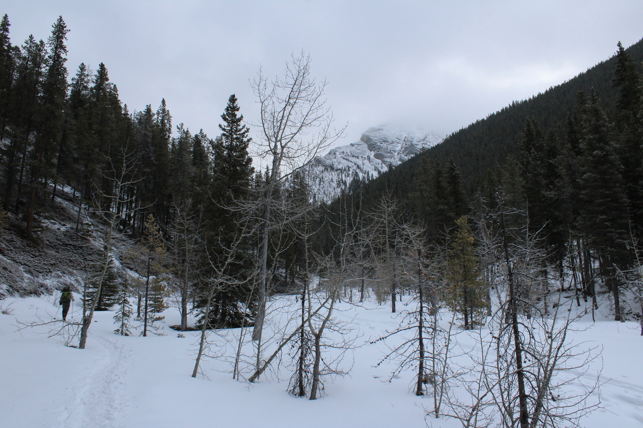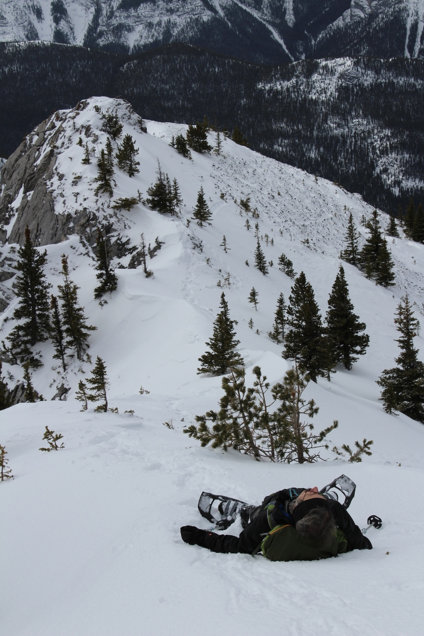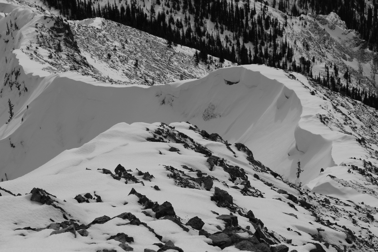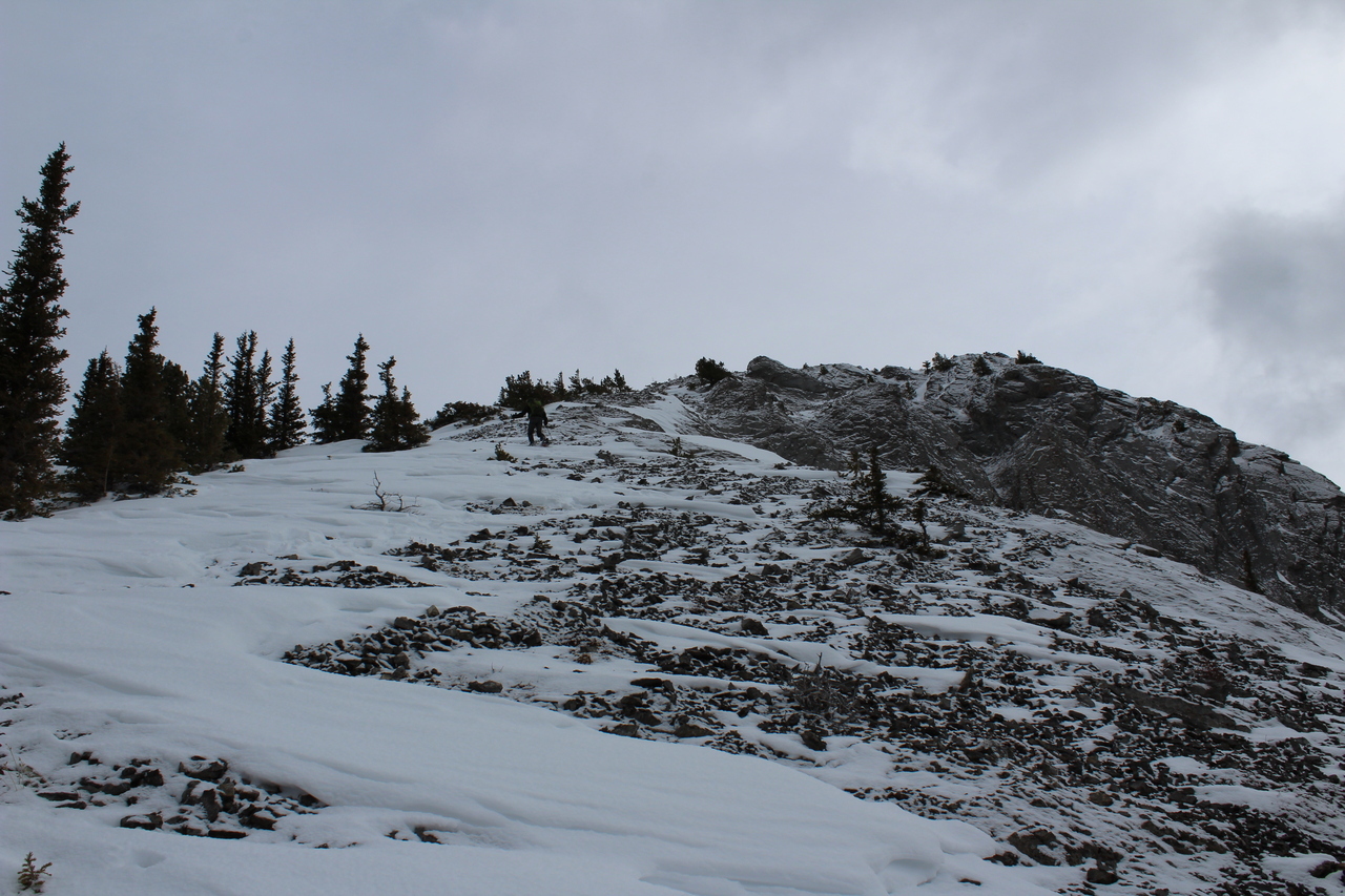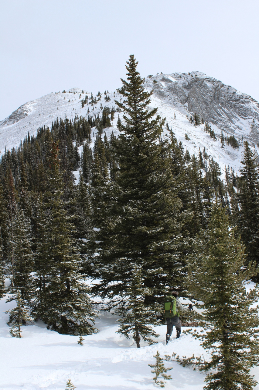 Looking back up to where we gained Midnight's west ridge after losing some hard earned elevation. Try not to get your hopes up, thinking it'll be smooth sailing once you reach the west ridge, like I did! I was super eager to escape the north ridge, hoping to find the west ridge rocky and windblown...Instead we found it to be treed...therefore sheltered...and therefore every bit as snowy as what we just thought we'd escaped!