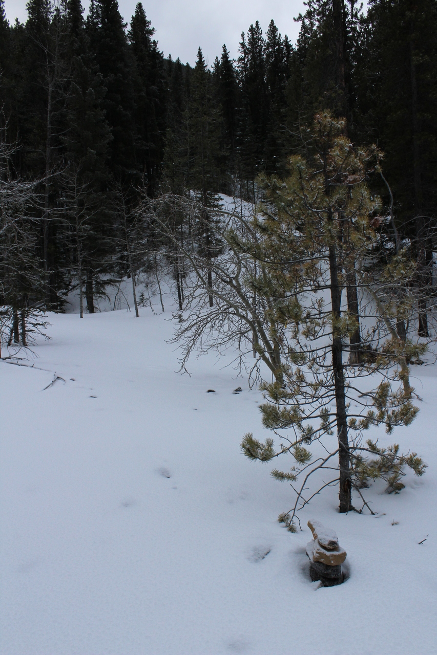 Just under 2km from the parking lot, we reached the ascent drainage (note the carin pointing the way).