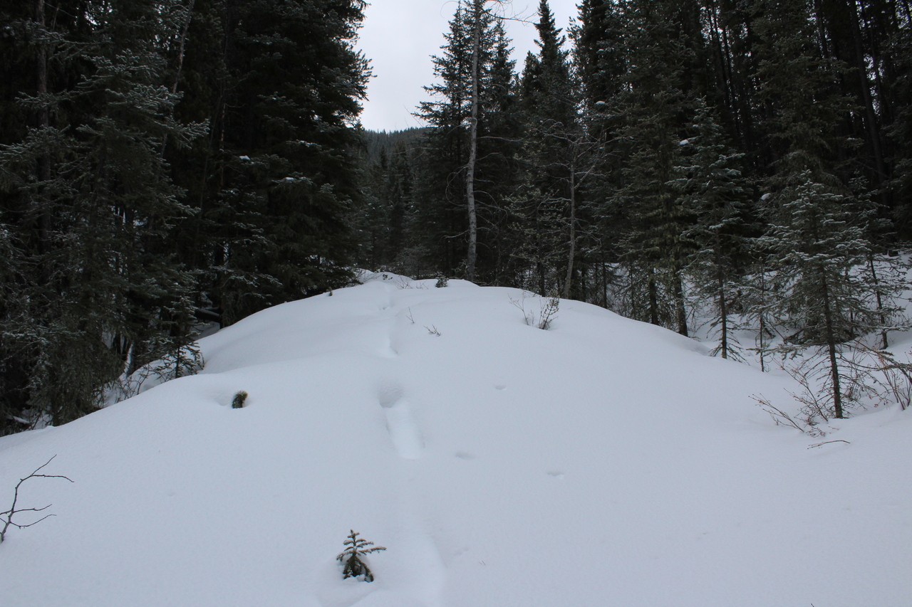 After about 800m, the trail makes a turn to the left, along a cut line, soon arriving at more open terrain along the creek.