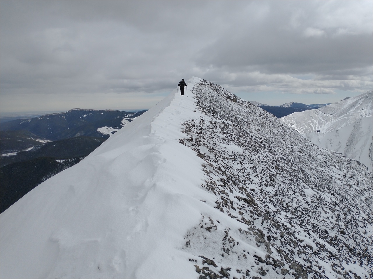 Traversing a steep, snow slope, as we continue along the ridge. Might pose avalanche concern in certain conditions, but it felt quite stable on this day.