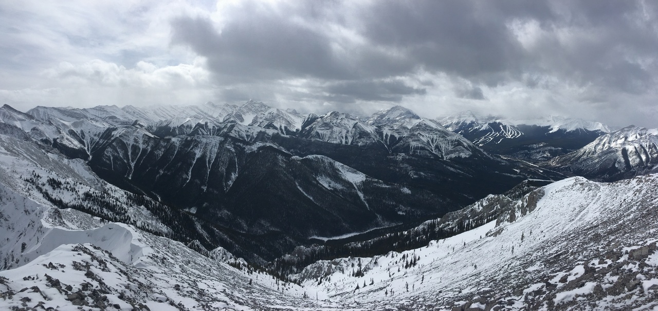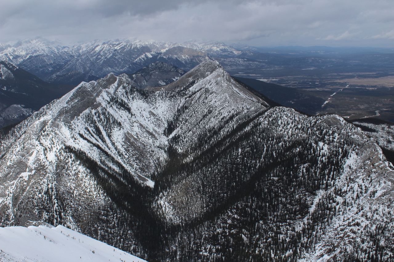 Mount Baldy's three summits neighbour directly to the north, with Yamnuska's iconic south face, noticeable in the distance.