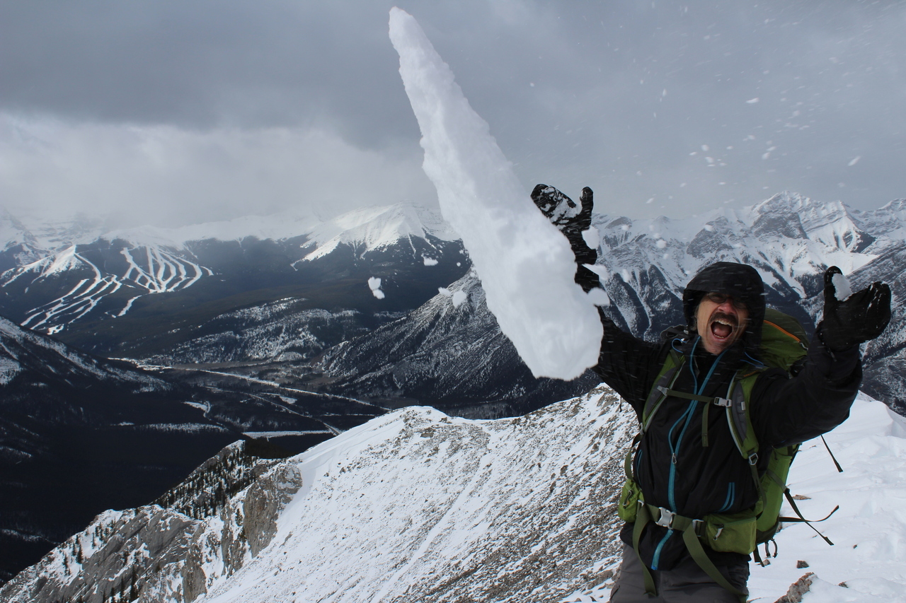 Action shot! My dad (and flying slabs of snow) on Midnight Peak!