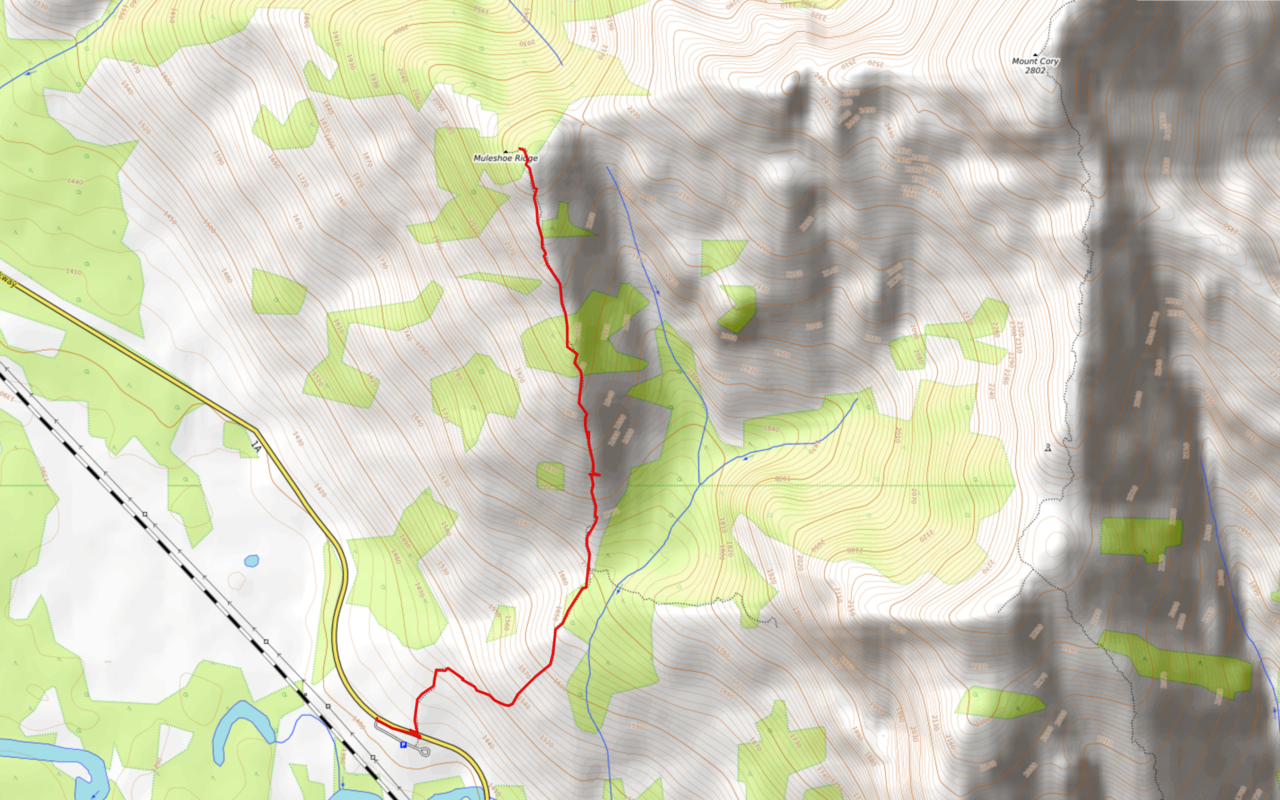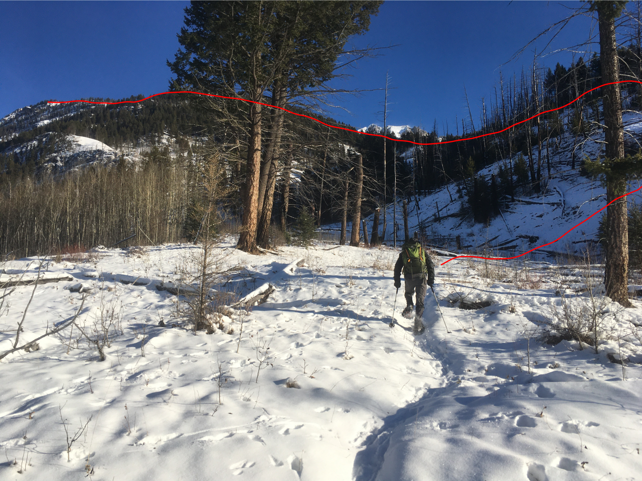 The approximate route we would take up Muleshoe Ridge. The snow wasn't very deep to start, and the trail was obvious, but that would change higher on the ridge...