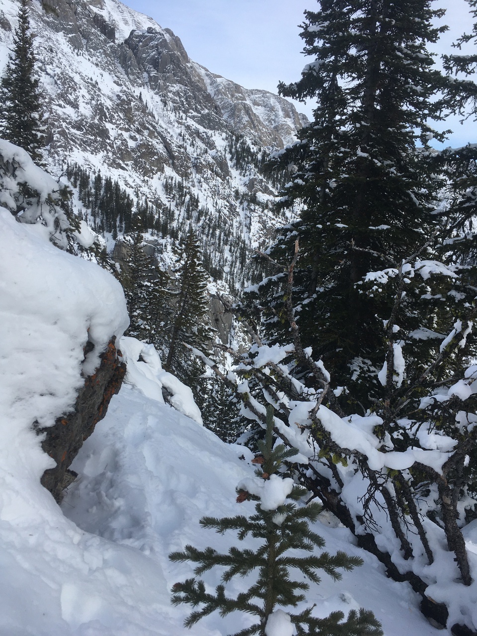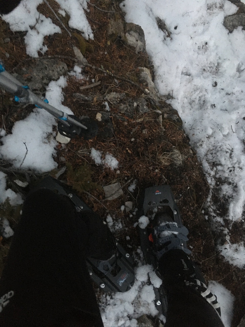 Extreme snowshoeing! We wanted to try and make it all the way down in snowshoes, but were eventually forced to put them away on the prolonged section of rocky terrain.