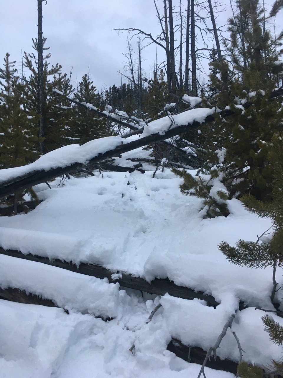 I thought I would benefit in terms of manoeuvrability through all the deadfall by not wearing snowshoes...but it turns out that floatation plays a much greater role in being a happy hiker...