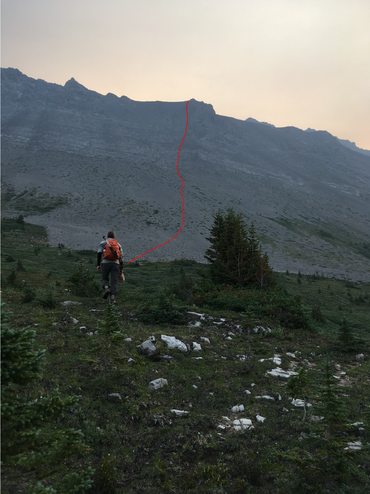 Nigel Peak looms high above! Upon reaching the valley leading to Wilcox Pass, we left the trail, and took a direct line across the bushy meadow, towards Nigel Peak. PS. The mosquitoes here were awful!!...A few of them were even desperate enough to follow us up the mountain!