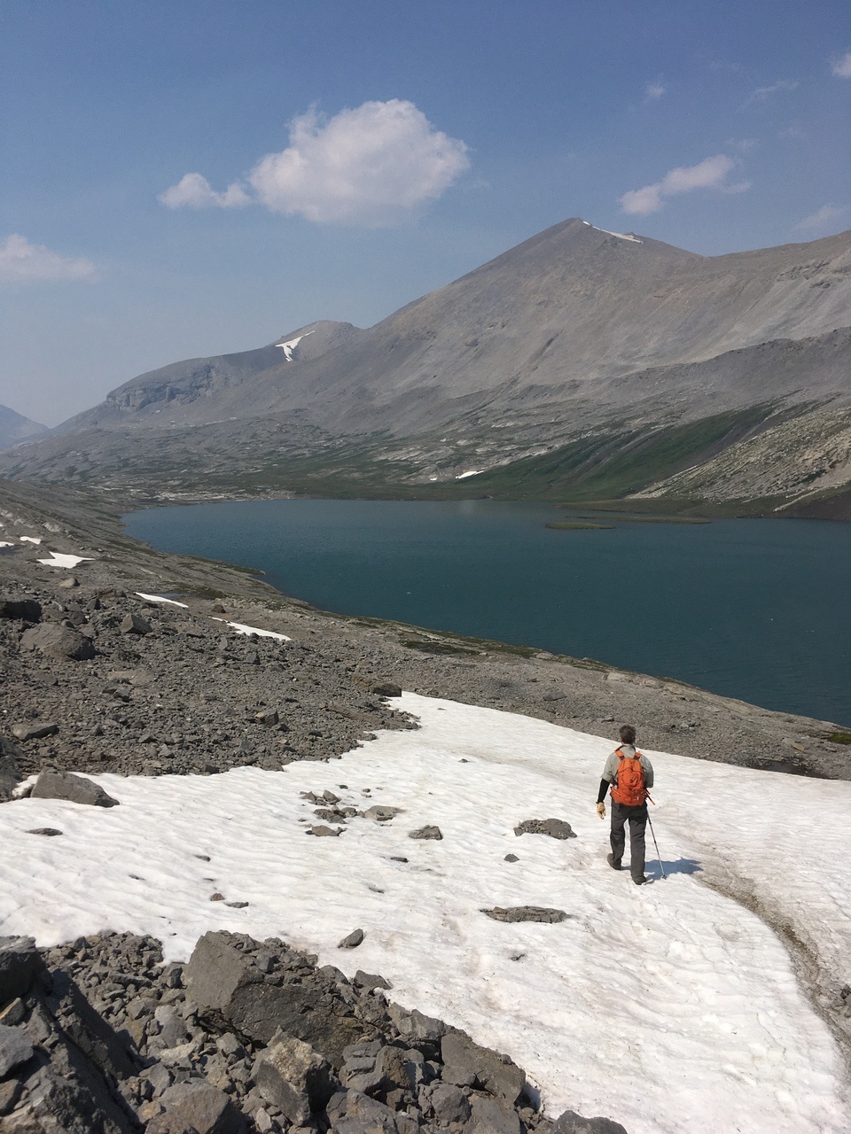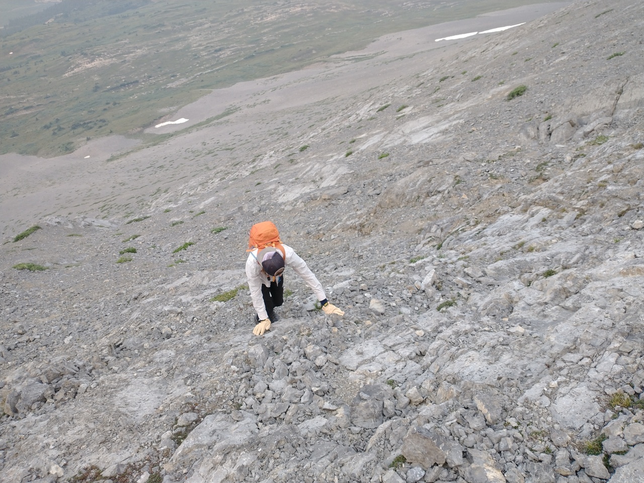 Just past 1:00, we were at the end of the summit ridge, traversing back across the bowl (and that's with sitting at the top for 3 hours!). I originally thought of taking the alternate descent route, down fast scree on skier's left of the connecting ridge, but that would take us back to the campsite in no time! We decided to fill our day with some more hiking instead, and descended down the bowl below Nigel's summit cliffs. We were feeling adventurous, and hoped to make it to Wilcox Lake, and then find a way back around to Wilcox Pass!
