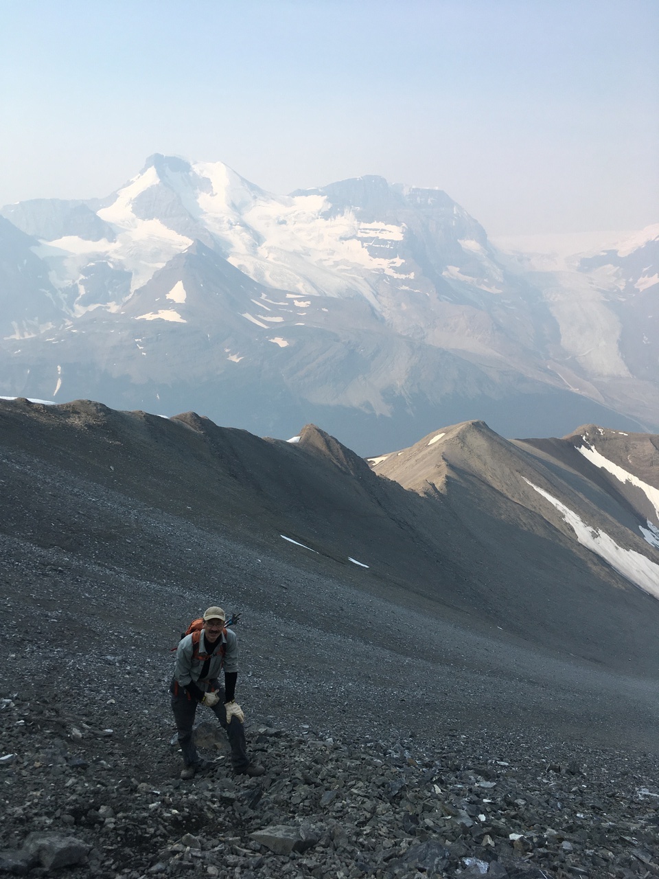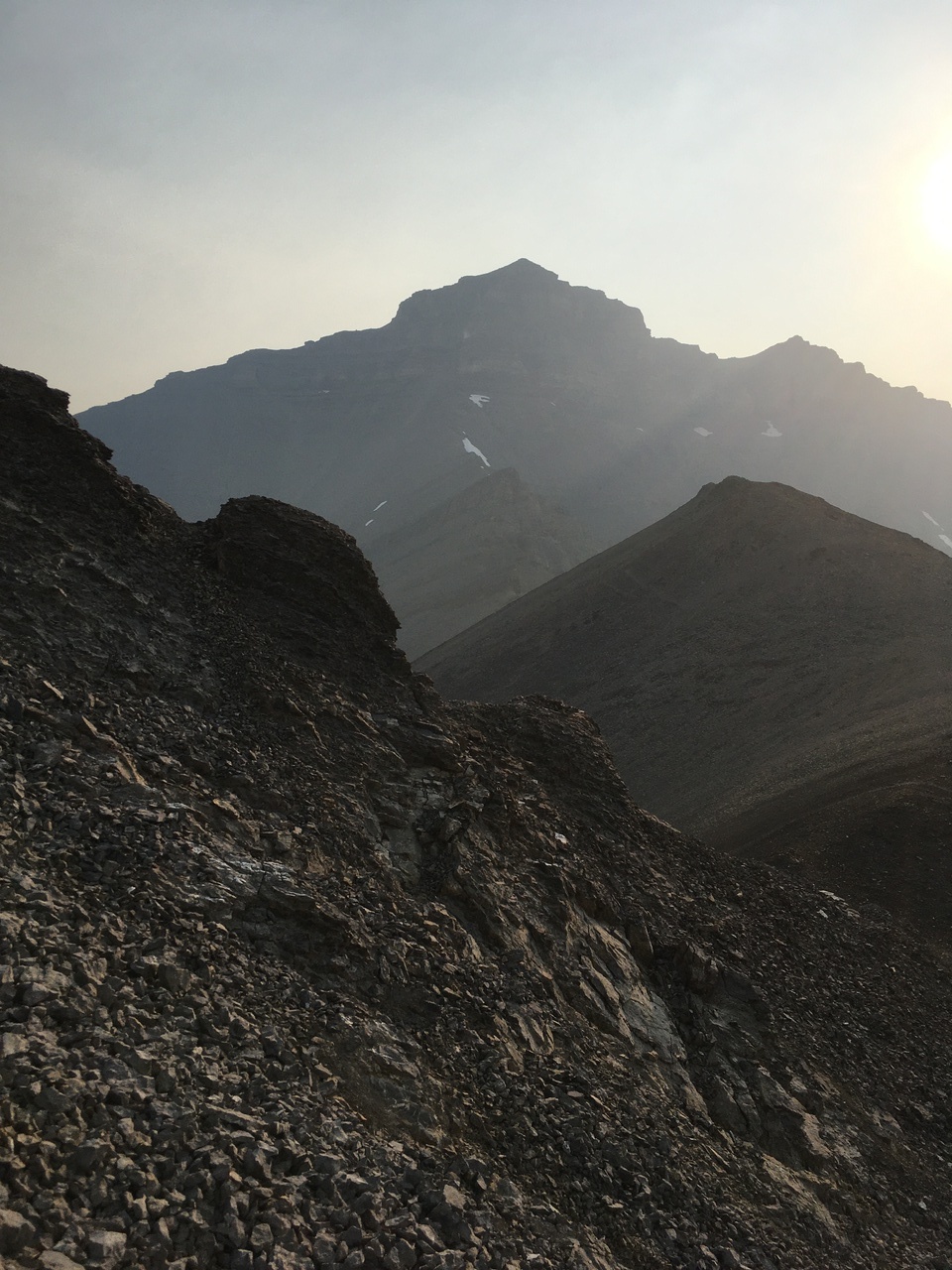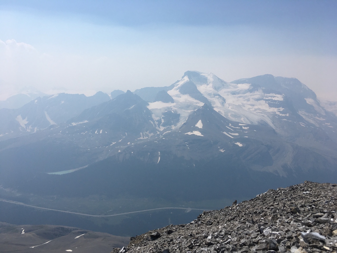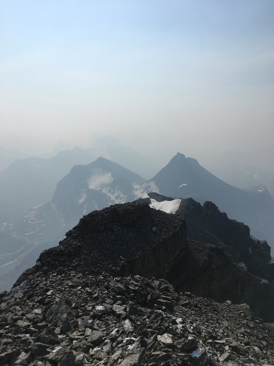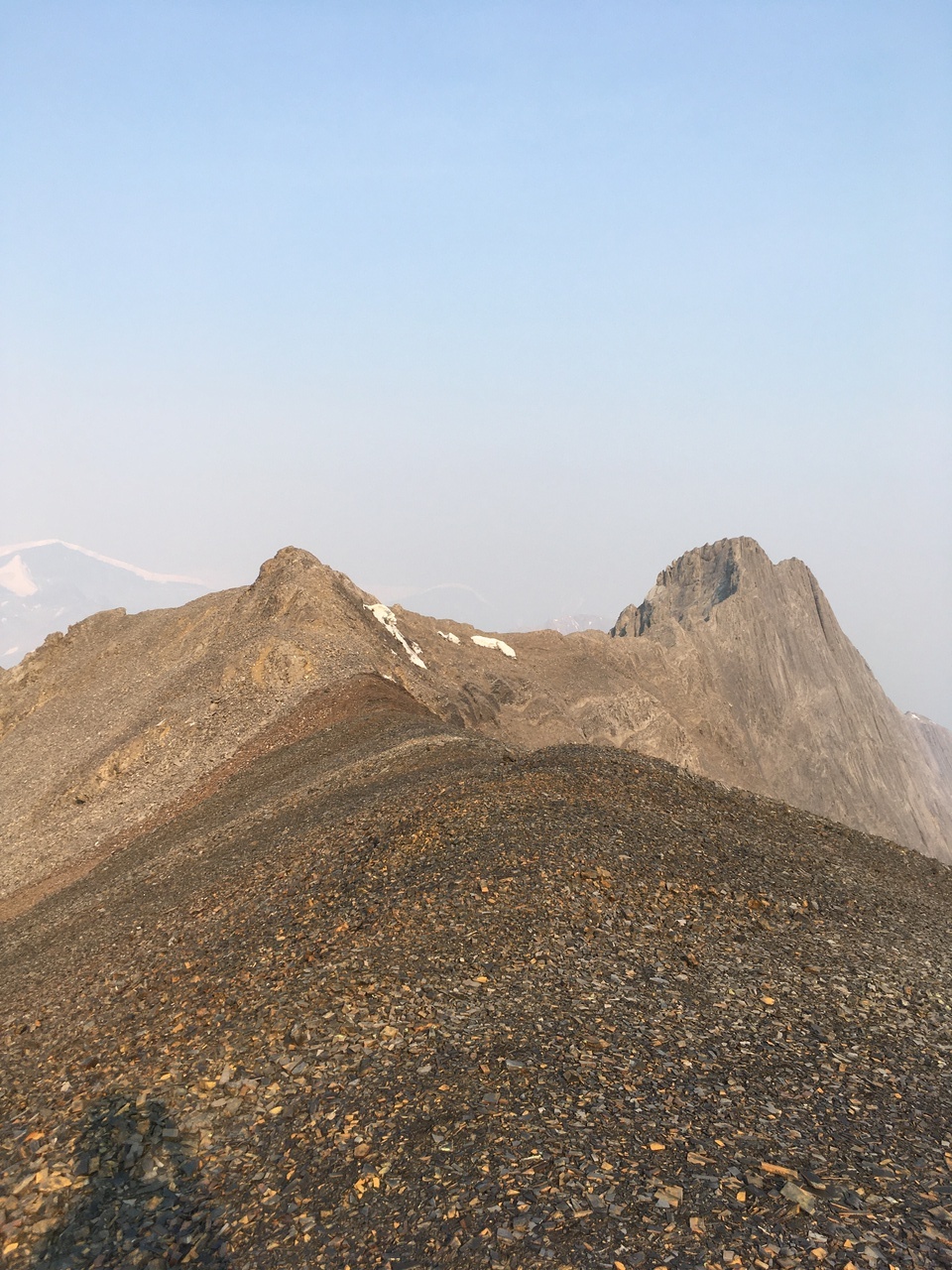 At 3211m, Nigel Peak is a big mountain and caught my attention many years ago. When viewed from Athabasca Glacier, Nigel Peak rises majestically across the highway and has a temple-like aura about it. Although it may be separated from, and get less attention then the giants of the Columbia Icefield, Nigel has a glacier of its own on the backside and holds its own as a beautiful mountain! The scramble route is fairly short and enjoyable, and takes you right along the glacier when ascending the summit ridge! Unfortunately for us, this day marked the beginning of weeks of smoke and the views really took a hit :( Even so, scrambling this peak made for a great day, combined with an alternate descent that added a good chunk of distance, but also variety and unique views to our trip!
