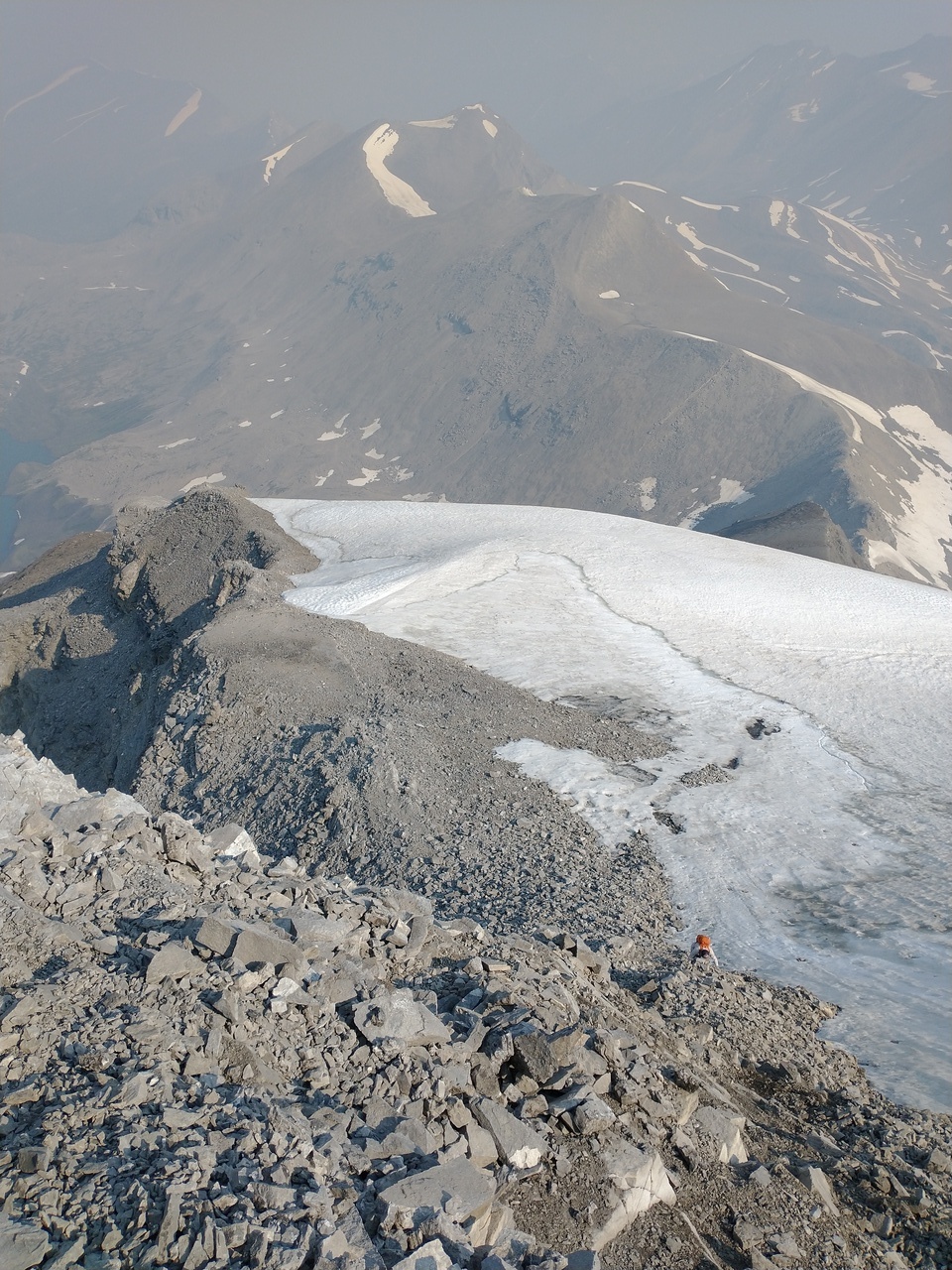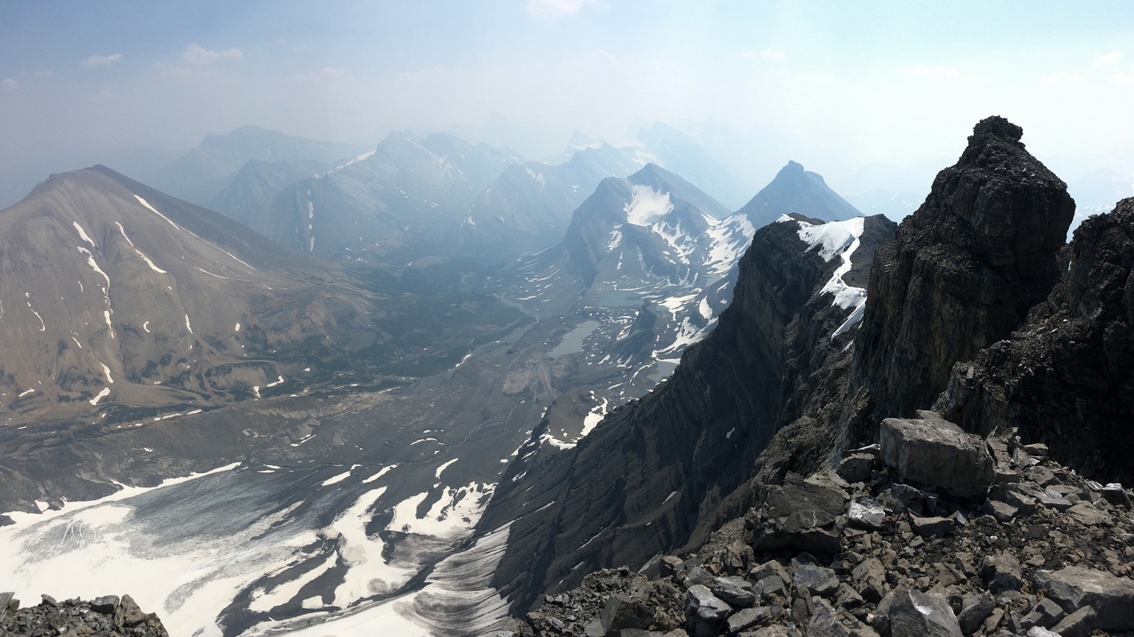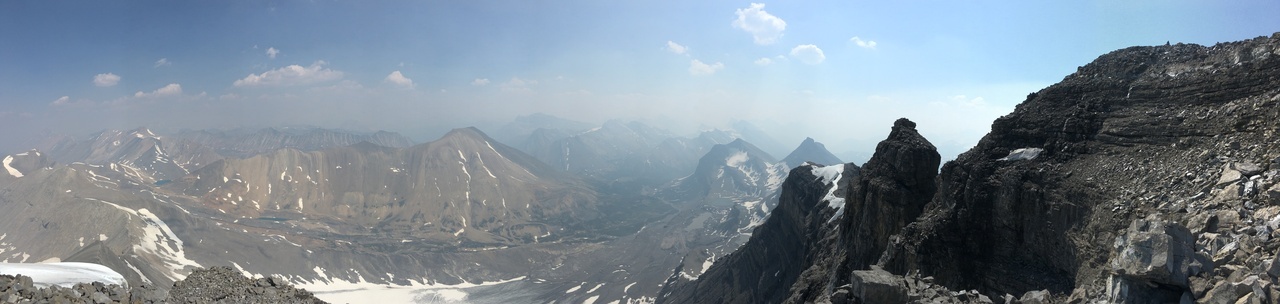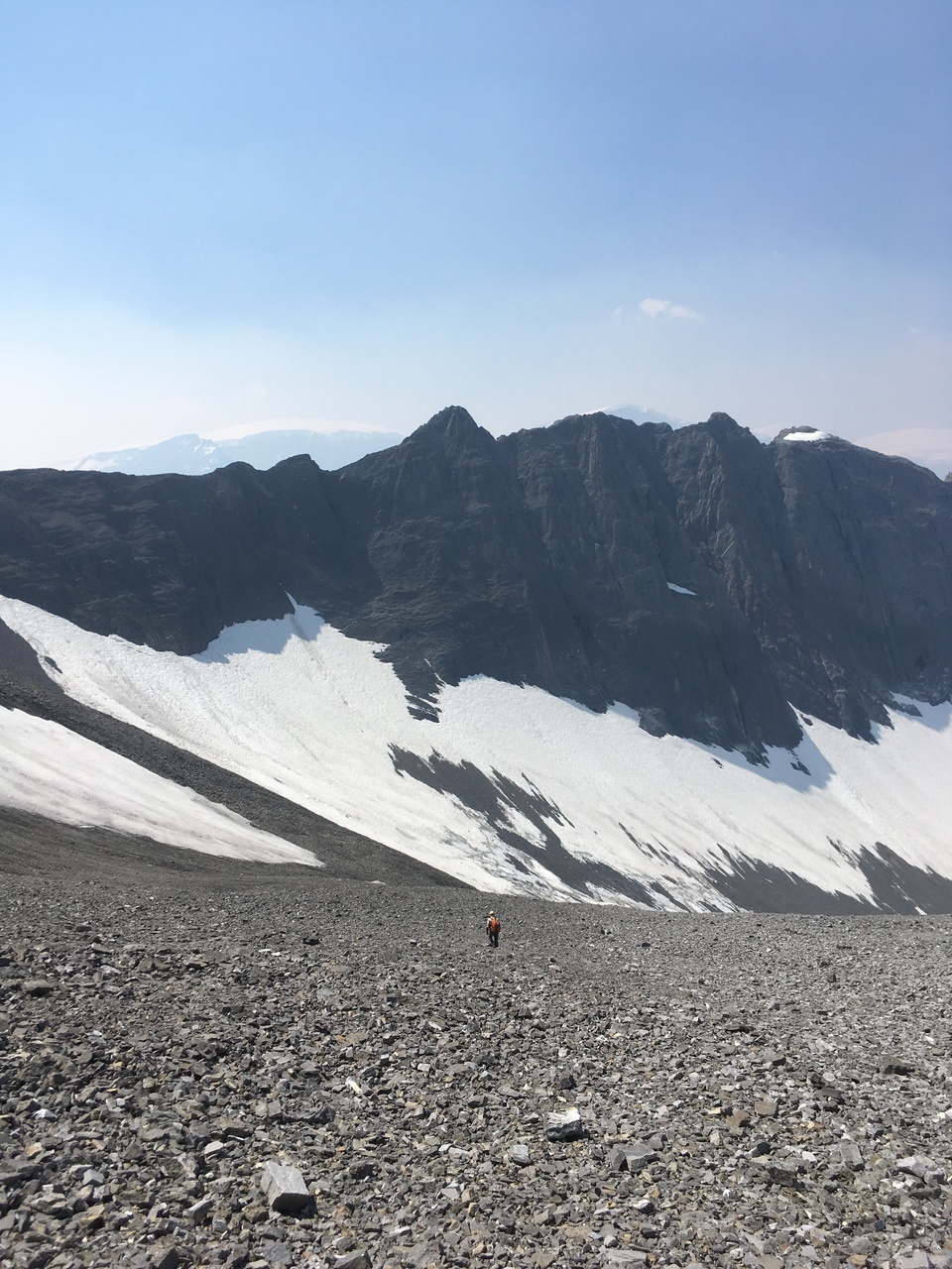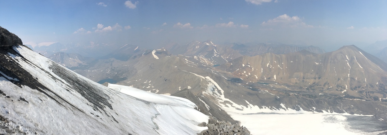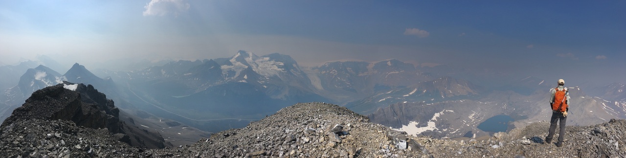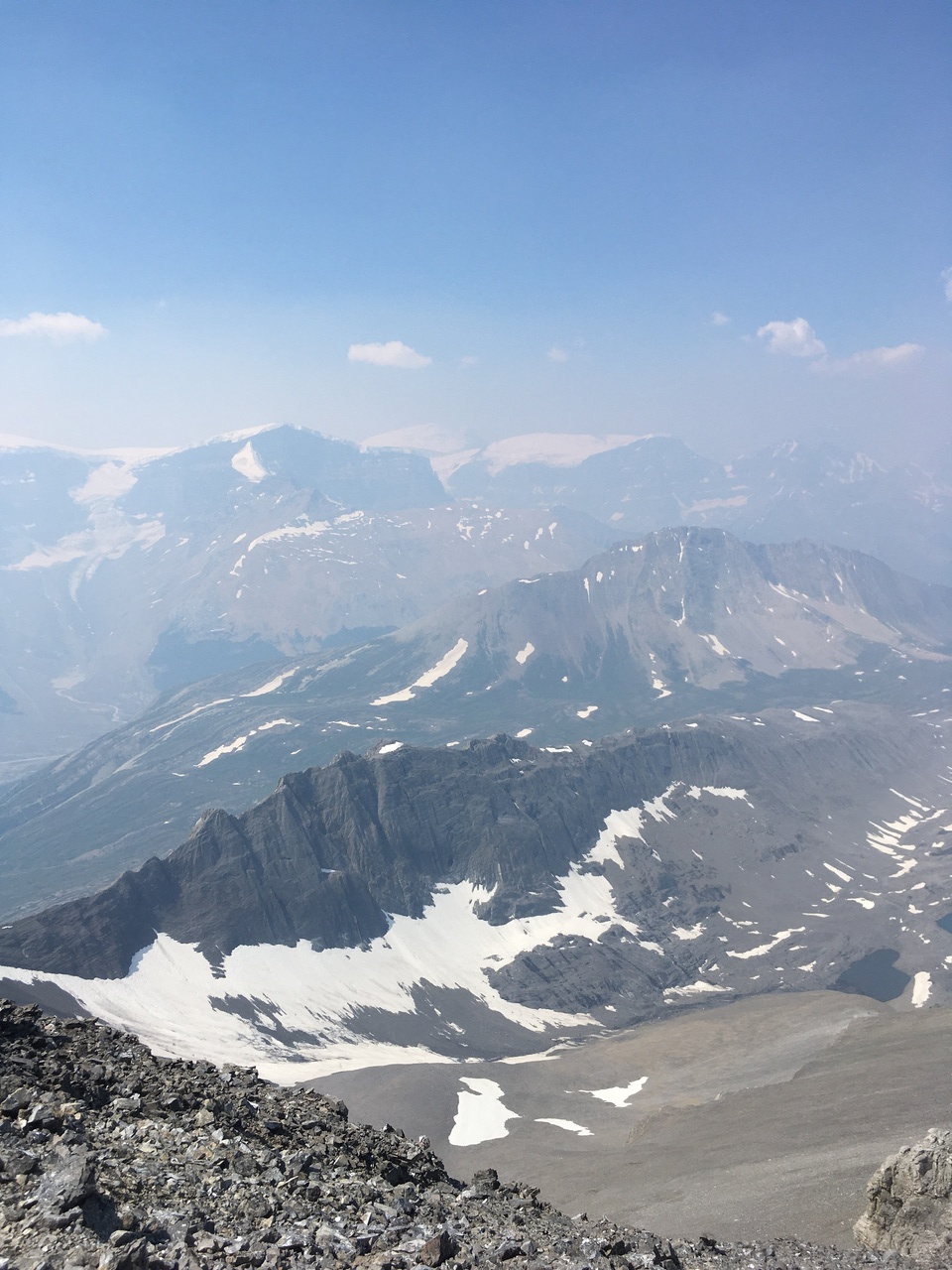 At 3211m, Nigel Peak is a big mountain and caught my attention many years ago. When viewed from Athabasca Glacier, Nigel Peak rises majestically across the highway and has a temple-like aura about it. Although it may be separated from, and get less attention then the giants of the Columbia Icefield, Nigel has a glacier of its own on the backside and holds its own as a beautiful mountain! The scramble route is fairly short and enjoyable, and takes you right along the glacier when ascending the summit ridge! Unfortunately for us, this day marked the beginning of weeks of smoke and the views really took a hit :( Even so, scrambling this peak made for a great day, combined with an alternate descent that added a good chunk of distance, but also variety and unique views to our trip!