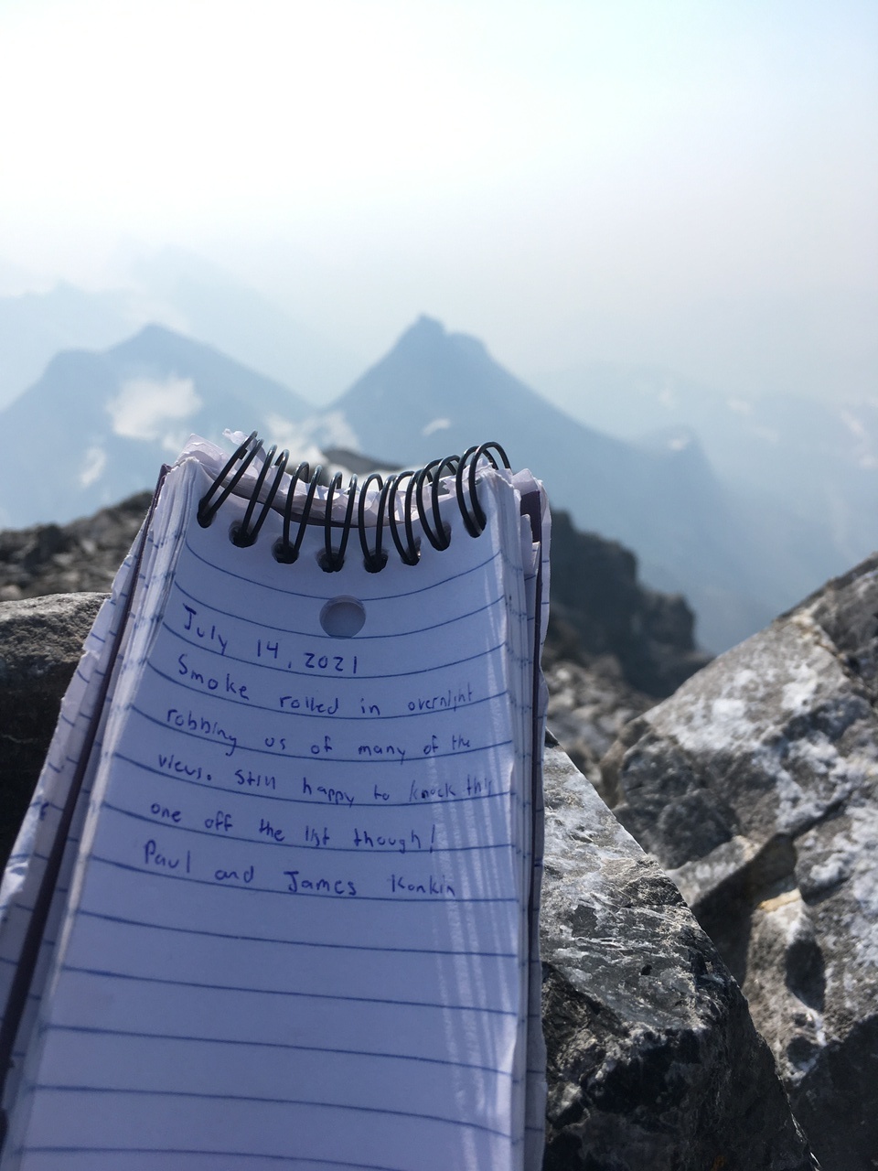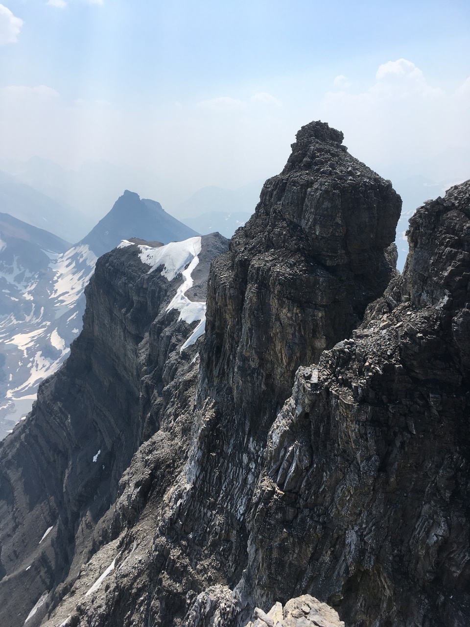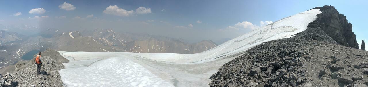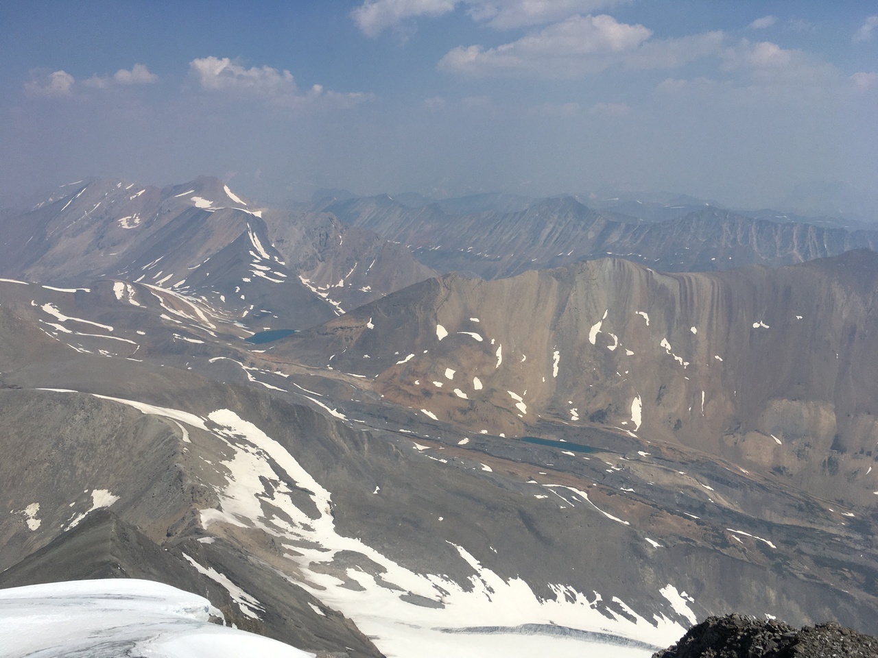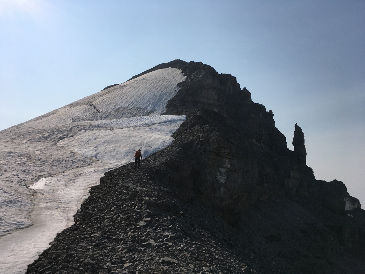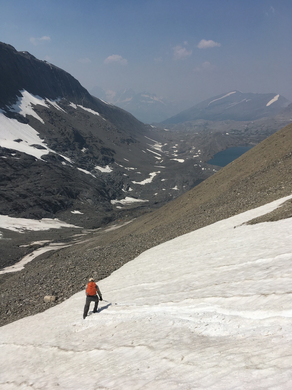 At 3211m, Nigel Peak is a big mountain and caught my attention many years ago. When viewed from Athabasca Glacier, Nigel Peak rises majestically across the highway and has a temple-like aura about it. Although it may be separated from, and get less attention then the giants of the Columbia Icefield, Nigel has a glacier of its own on the backside and holds its own as a beautiful mountain! The scramble route is fairly short and enjoyable, and takes you right along the glacier when ascending the summit ridge! Unfortunately for us, this day marked the beginning of weeks of smoke and the views really took a hit :( Even so, scrambling this peak made for a great day, combined with an alternate descent that added a good chunk of distance, but also variety and unique views to our trip!