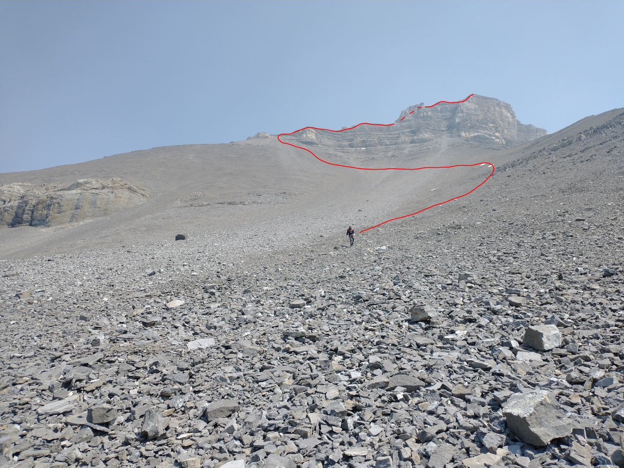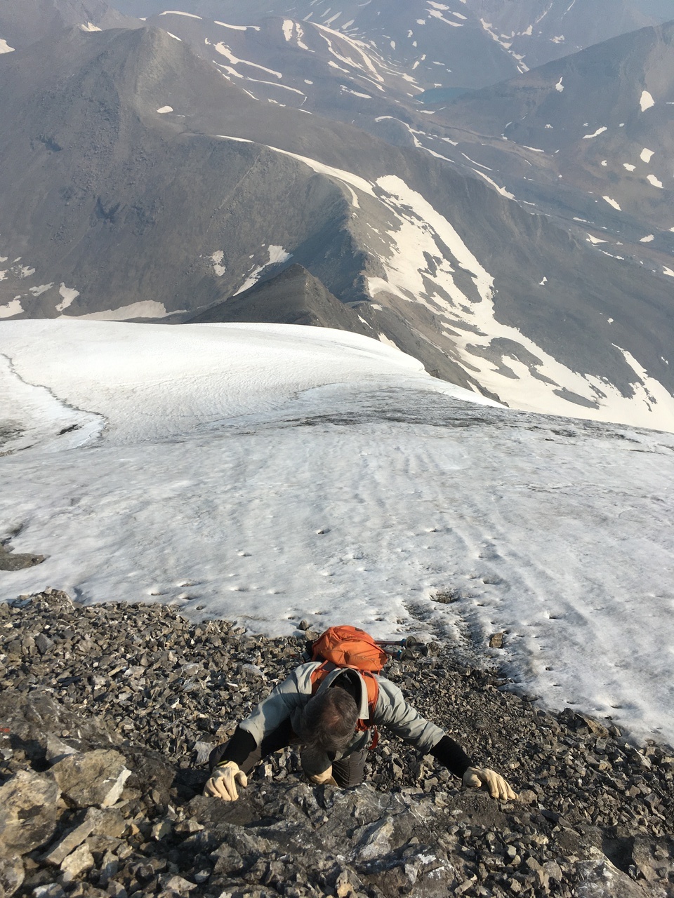 For the remainder of our ascent to the connecting ridge, we stuck to climber's right, hugging the solid rock rib. This offered something to hold on to, on the ever steepening loose scree slope!...I eventually had to pick off the mosquitoes one by one, so we could finally climb in peace!
