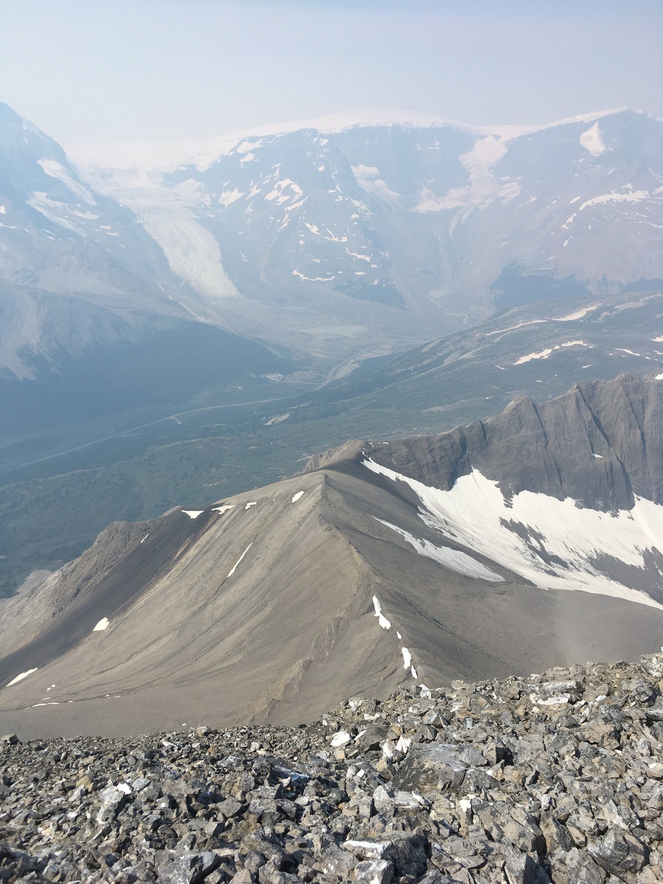 Looking down to the connecting ridge, with Snow Dome rising across the highway, and Athabasca Glacier flowing down from the Columbia Icefield, to the left!