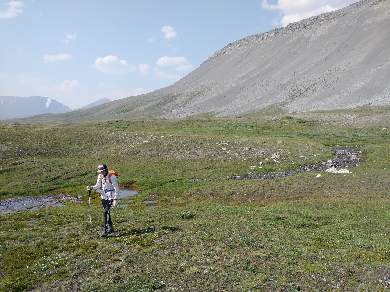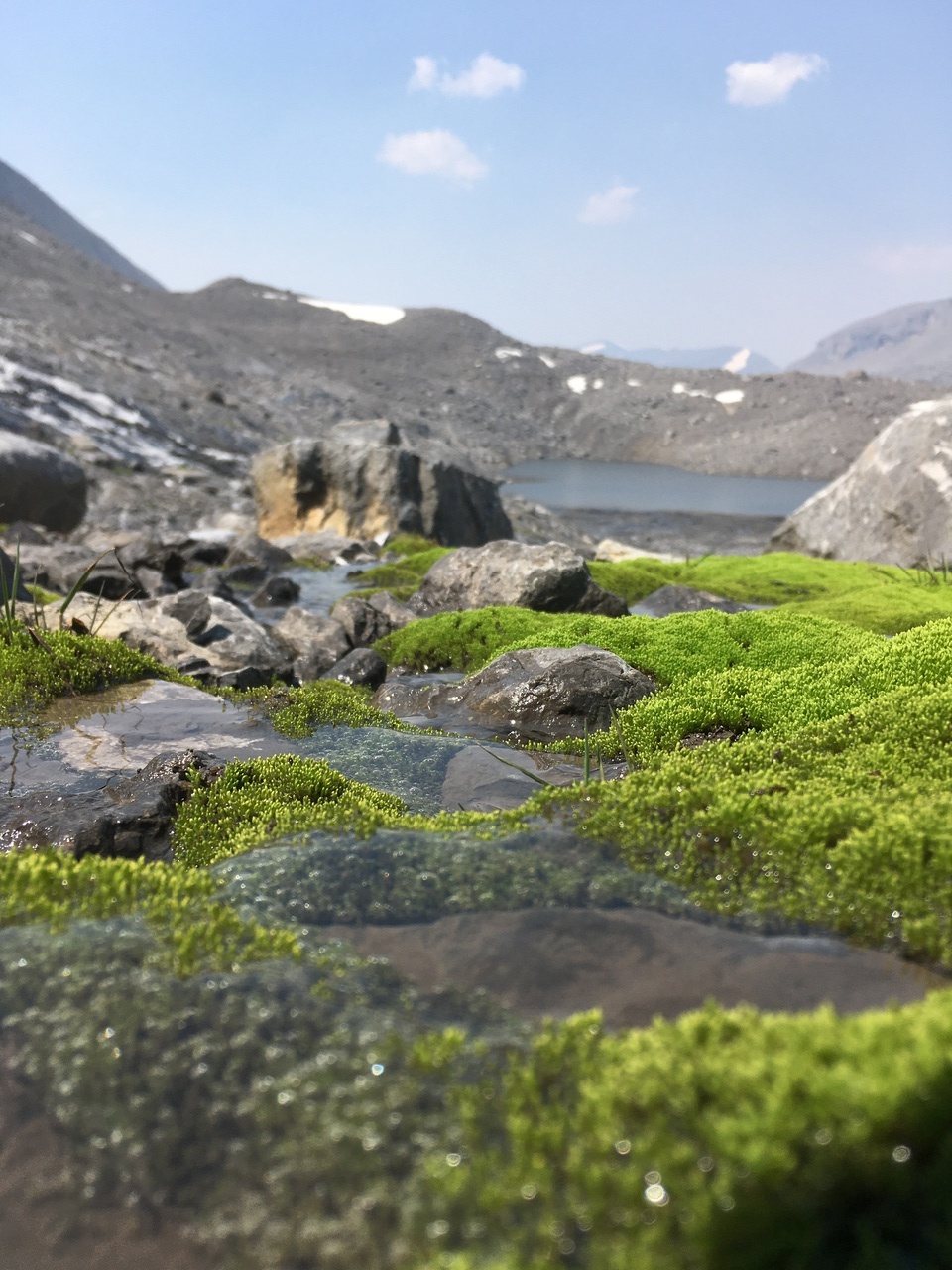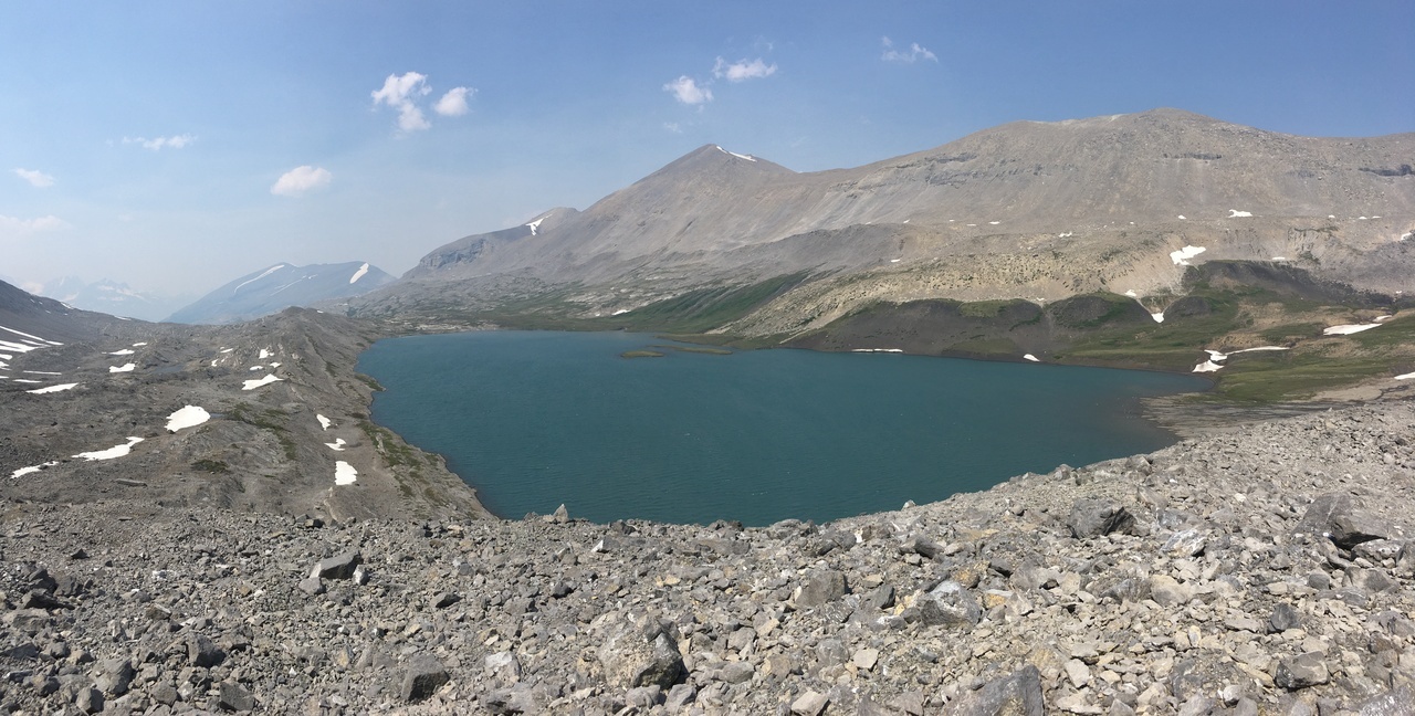 The view back, from the end of Wilcox Lake! We continued down the valley and angled to skier's left when the ridge above (left) petered out. There were some cliffs blocking the way to Wilcox Pass below, but we had no trouble finding an easy scree weakness that allowed passage through them. From there, we just followed the lush, green valley back to Wilcox Pass.