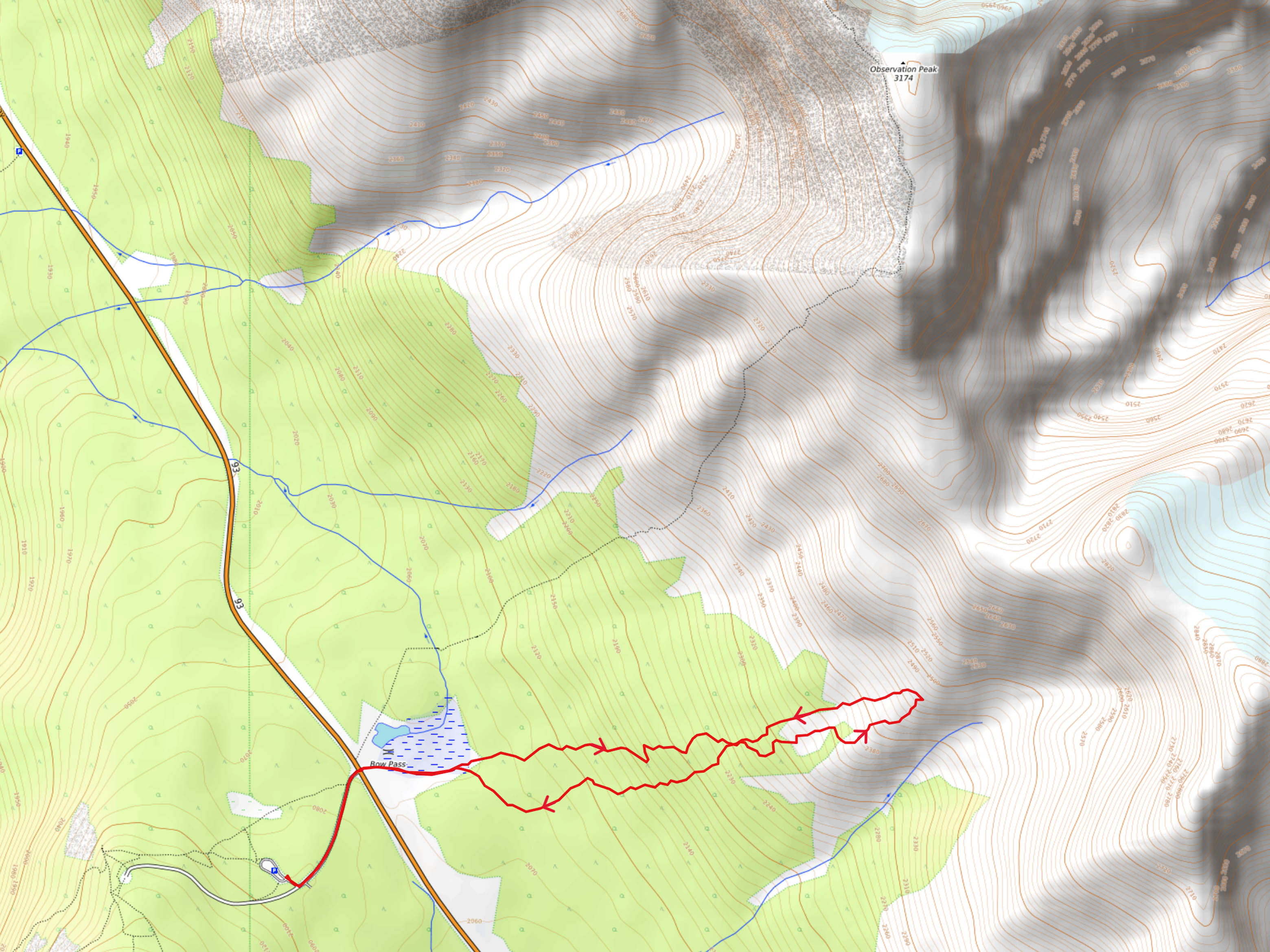 I assumed most - probably all - the cars in the parking lot were from folks already tracking out the classic Bow Summit runs, and decided we'd have better luck making fresh tracks on the opposite side of the highway. Having recently spent some time perusing through Marcus Baranow's "Confessions of a Ski Bum: The Icefields Parkway" guidebook, I was intrigued by the amount of ski-able terrain on the Observation massif and thought the "Roadside Glades" on the mellow, lower SW slopes of Observation Peak might make for some nice low hazard storm laps.
