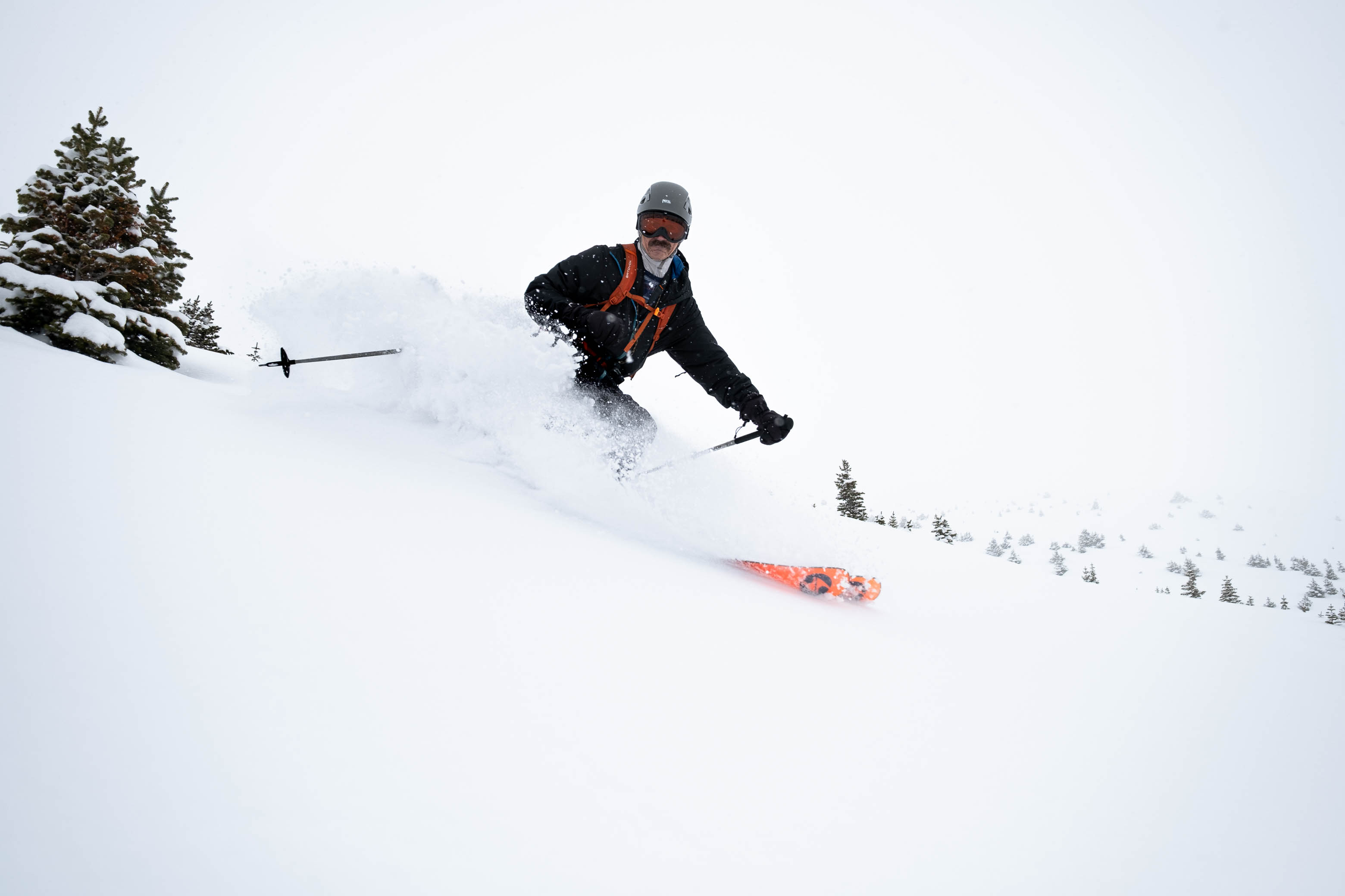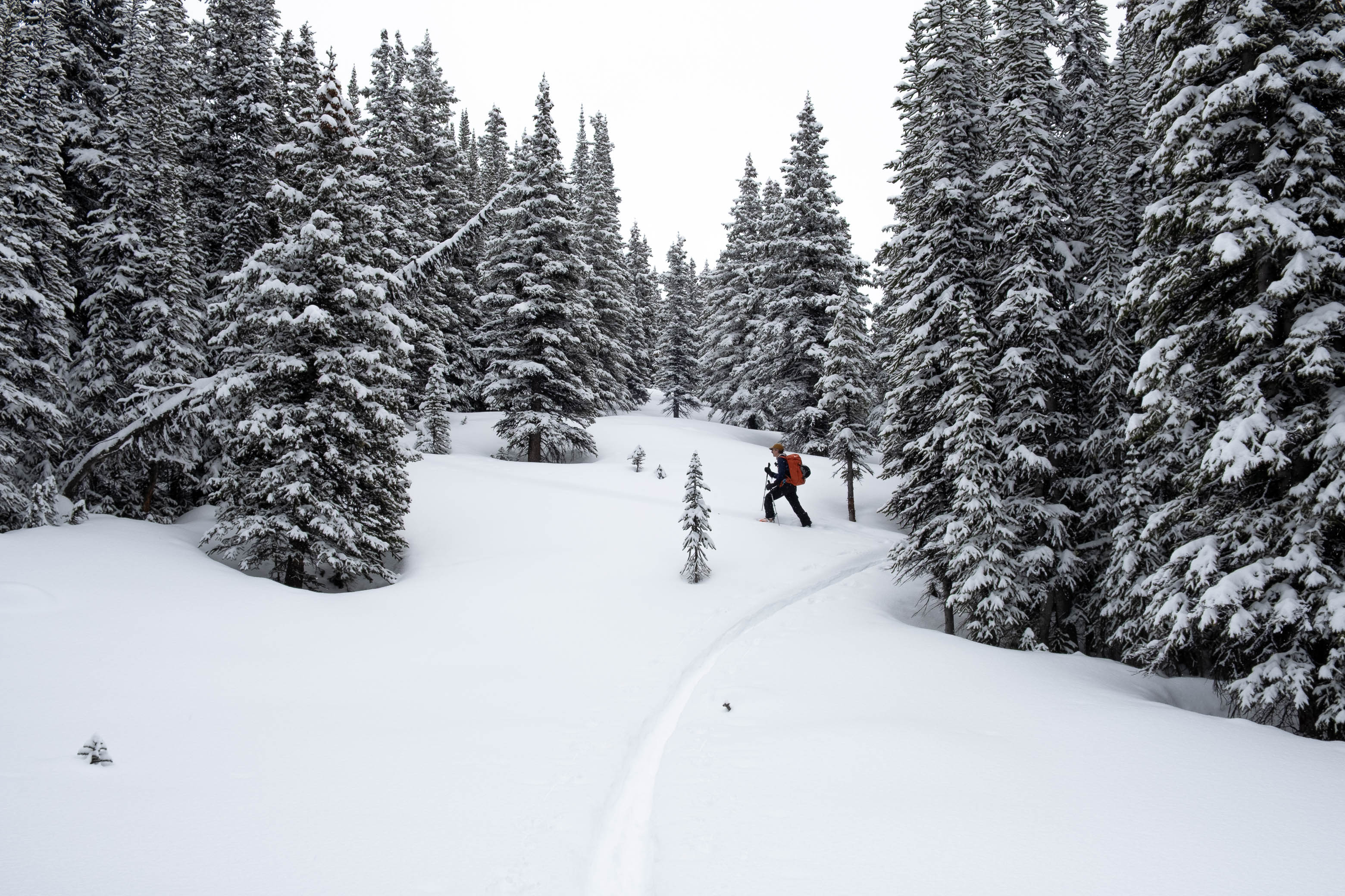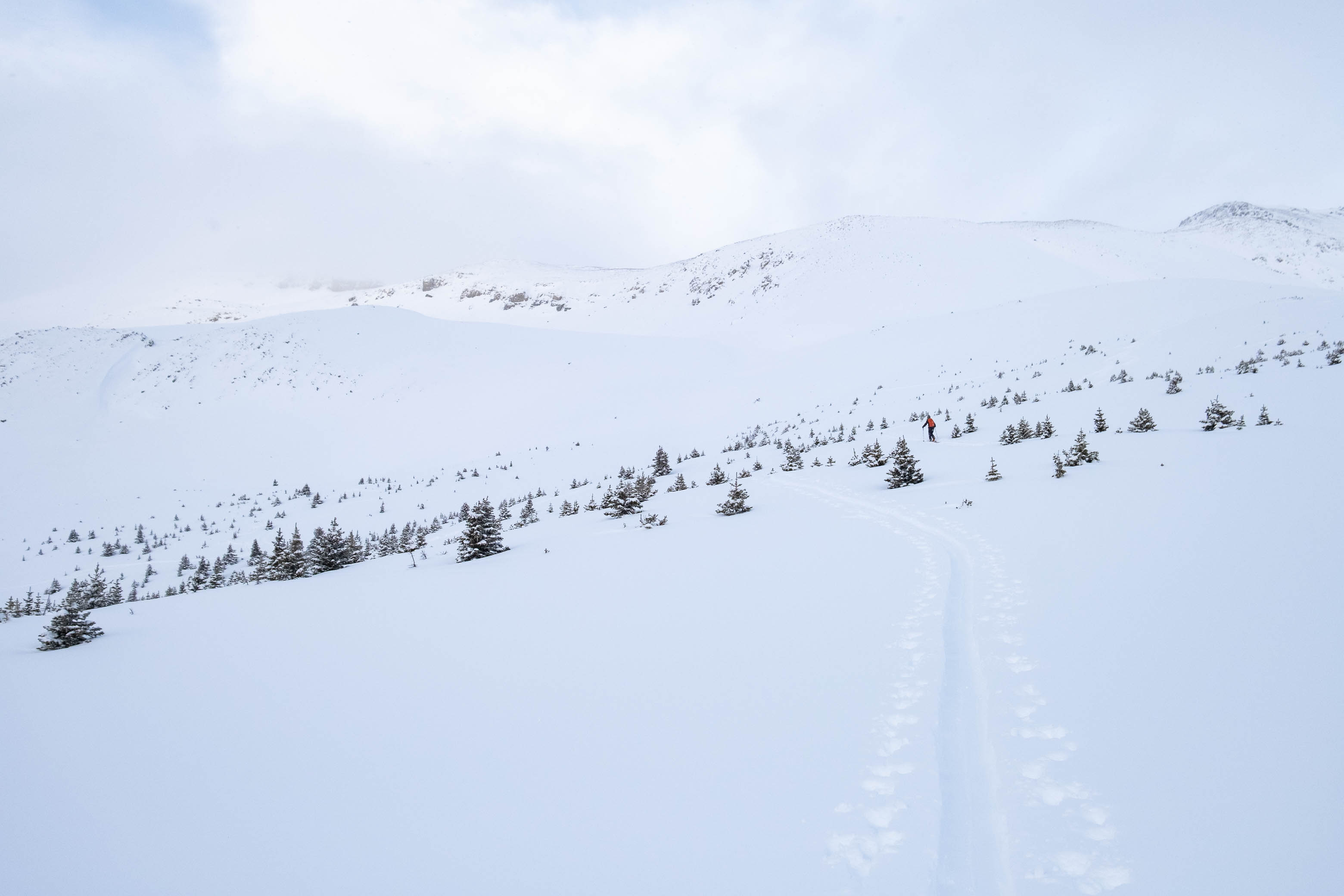 As we climbed past treeline, we crossed over a minor drainage and up onto a broad ridge to climber's right, paralleling the major drainage between Observation and its sub peaks to the southeast. Now out of the trees, the skin track we'd been following had been erased by the storm, and we simply continued up this gentle ridge, transitioning for our ride back down as soon as the slope started to steepen considerably, and we noticed obvious wind slabs starting to form.
