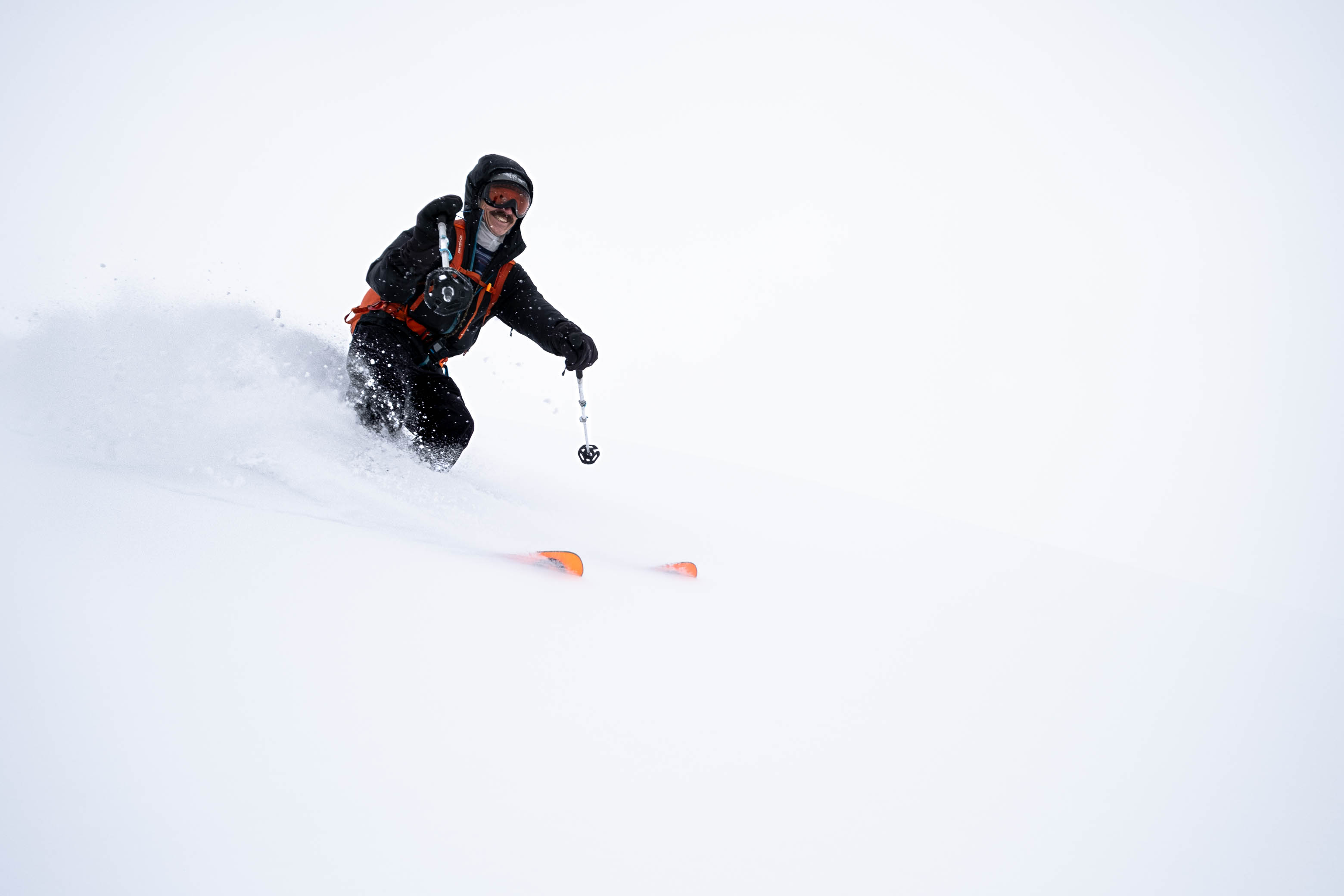 We chose our runs to skier's right of the ridge - where the snow was less wind affected - and enjoyed 4 laps of stellar ski conditions as the storm moved in and out around us, constantly changing what views we could and (mostly) couldn't see. We skied until we hit the obvious "tree wall", when it wouldn't really be "skiing" anymore, before putting the human powered ski lift (ie. our legs) back to work and climbing back up our skin track, resulting in ~ 250 m runs. Pretty solid, considering the "lap-able" runs across the highway are only about 120 m!