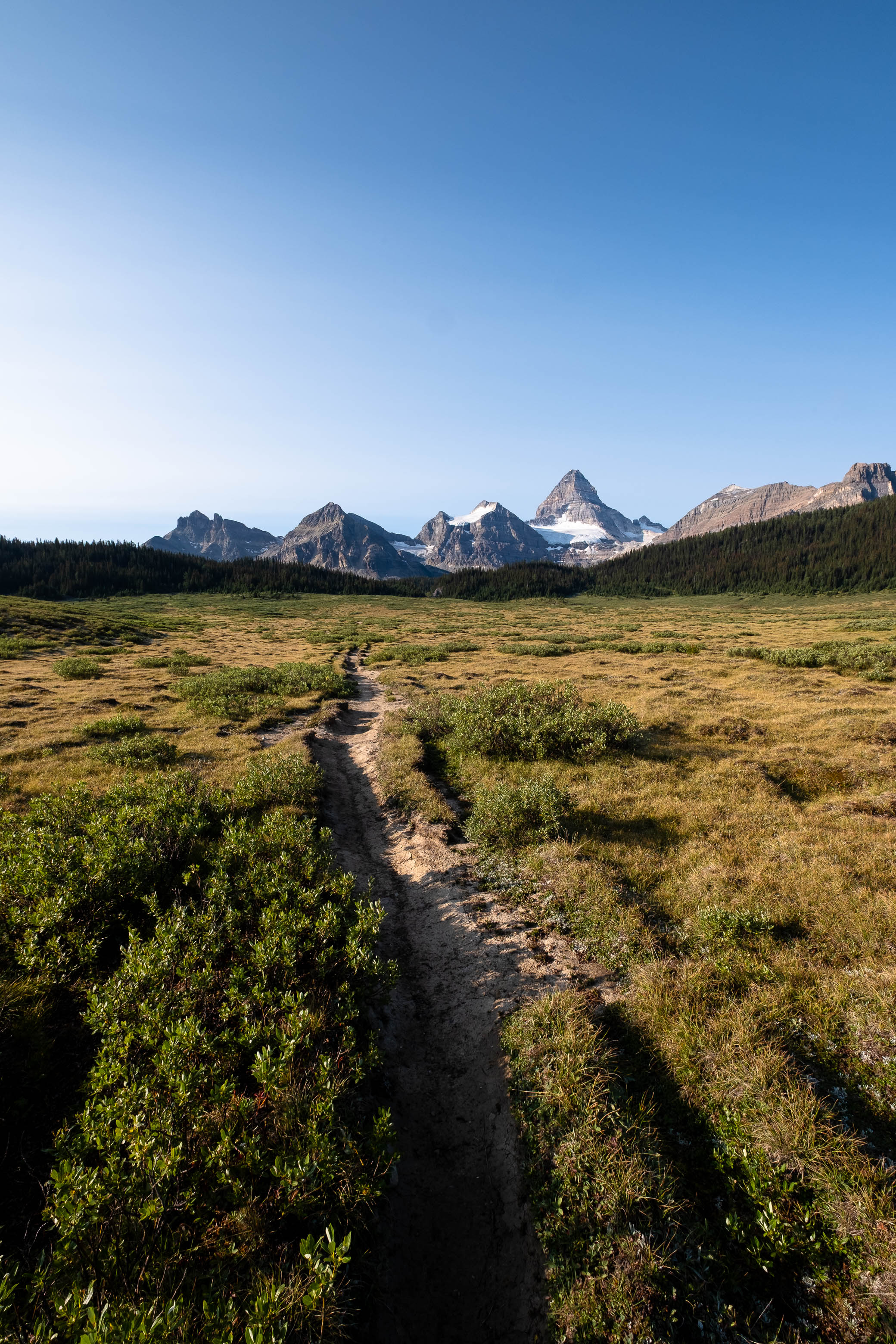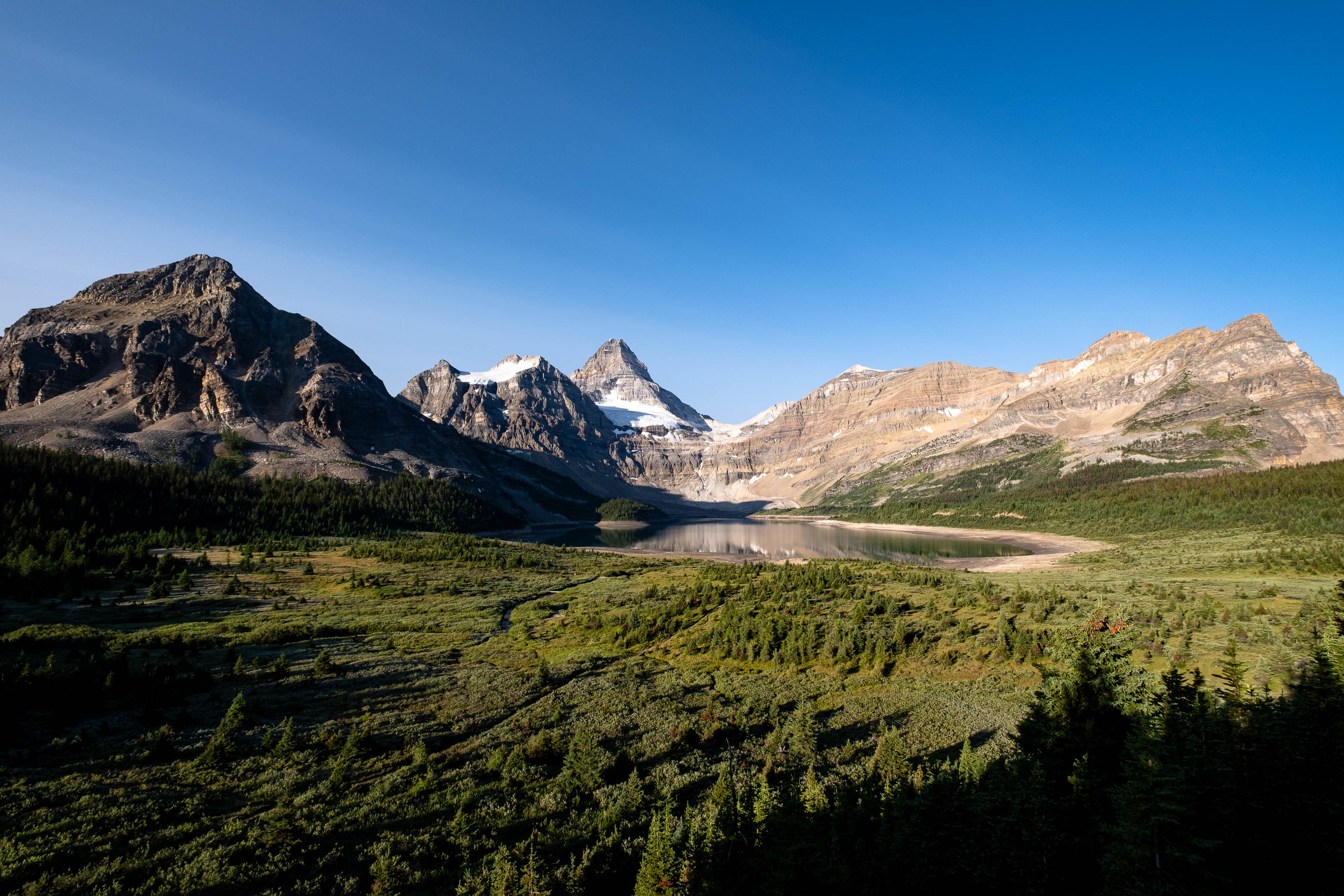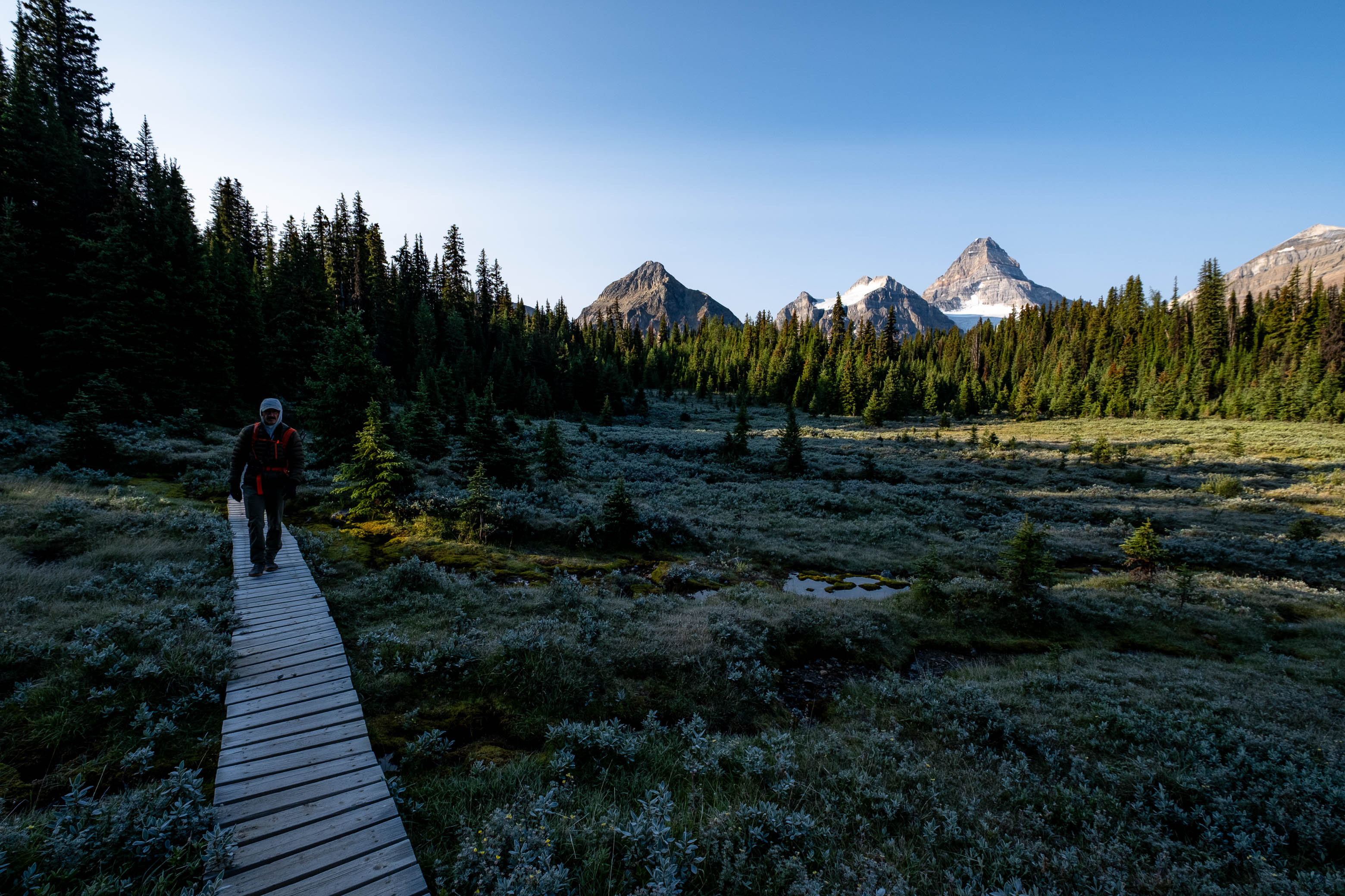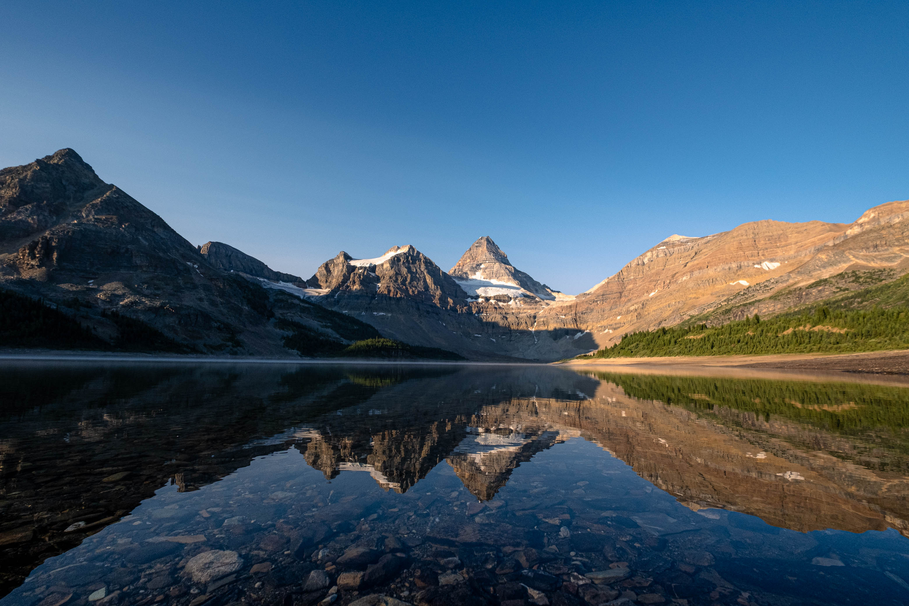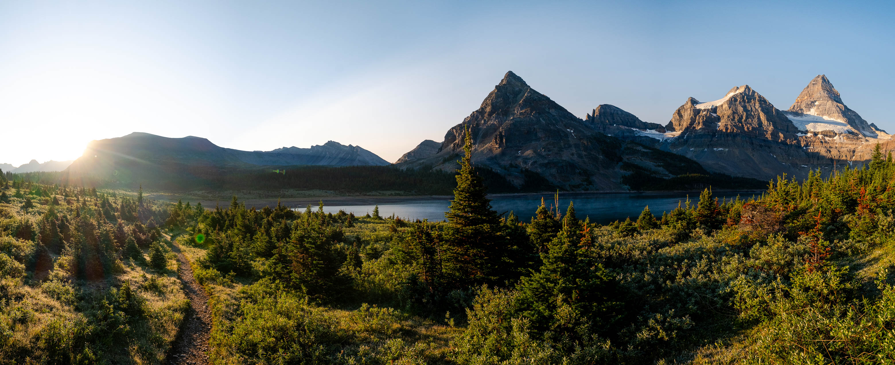 Poking our heads out of our tent to perfectly clear skies, we rushed to wiggle out of our sleeping bags and were leaving the campground within minutes, hiking down the trail towards the north shores of Lake Magog. A different trail leads more directly from the campground towards Og Pass, but personally I thought this minor detour was more than worth it to experience Mount Assiniboine's impressive, pyramidal form reflected perfectly in the calm morning waters.