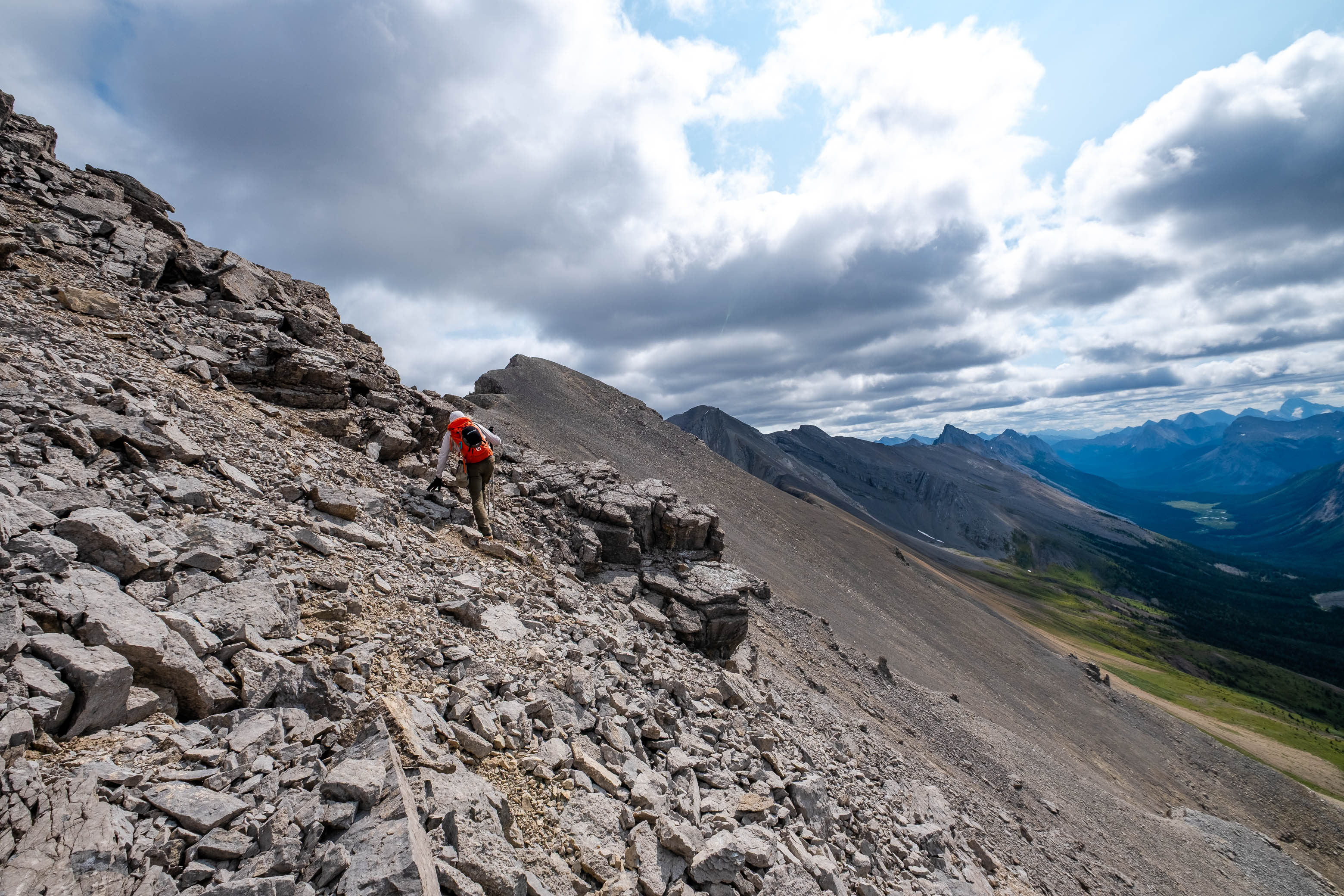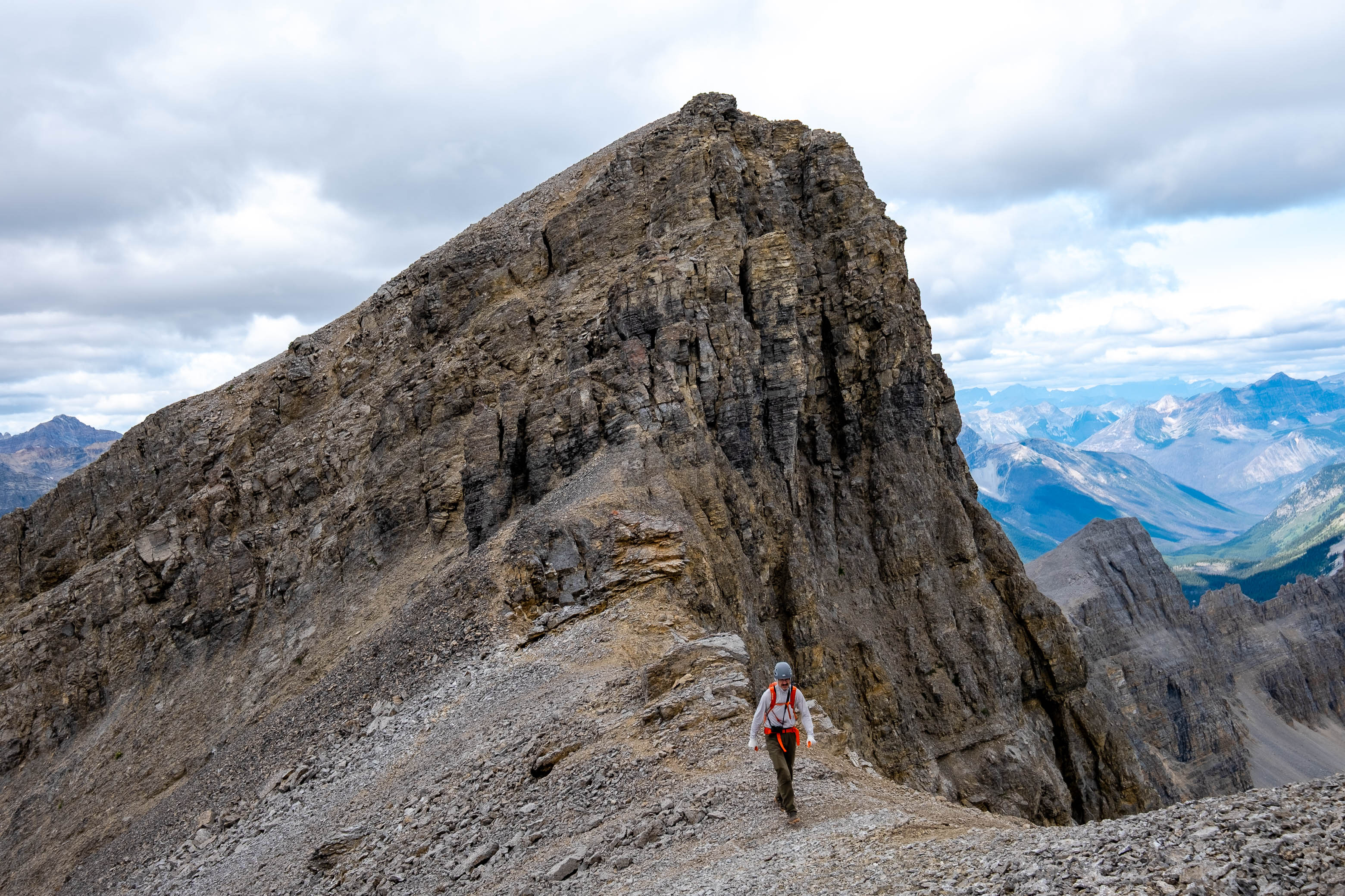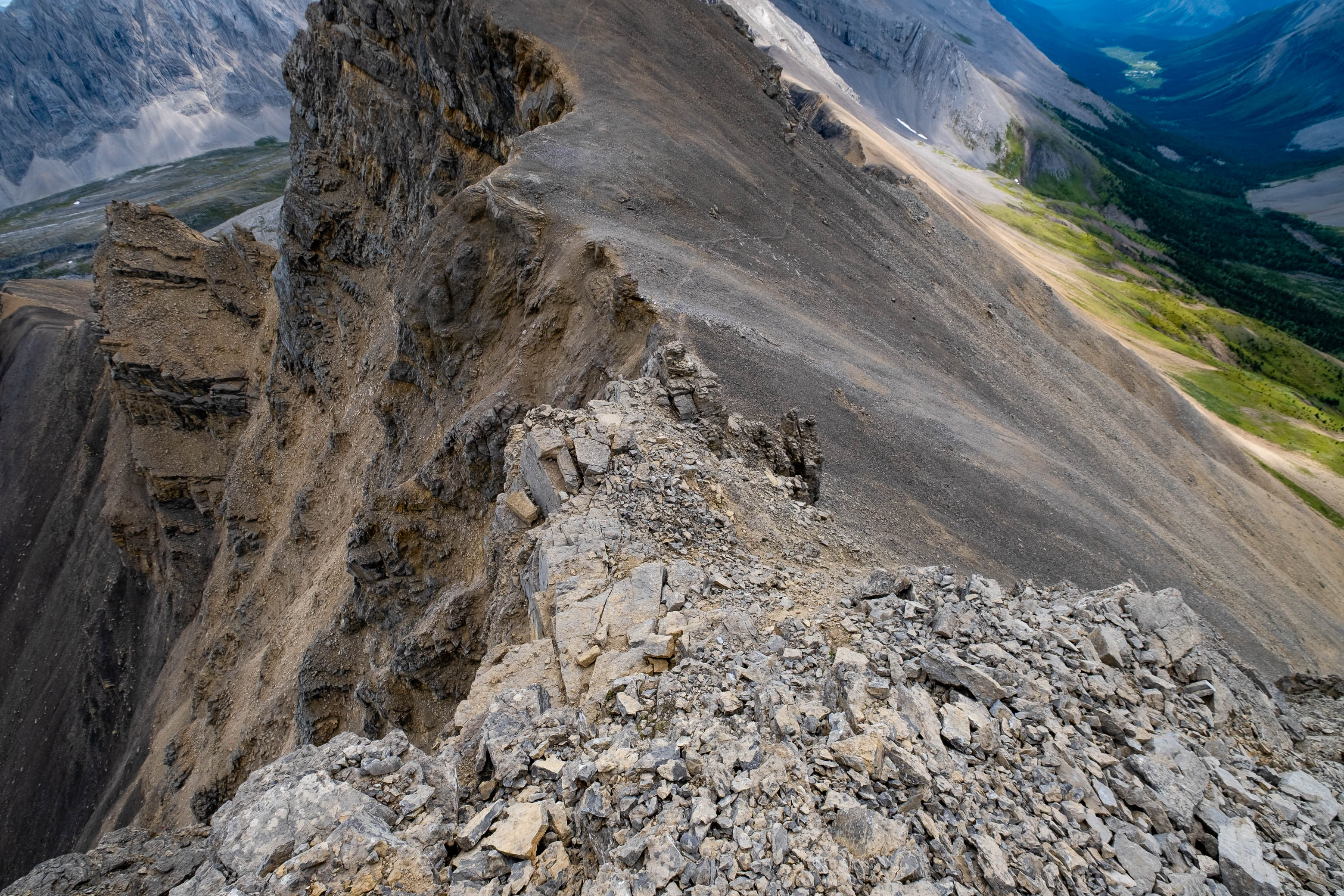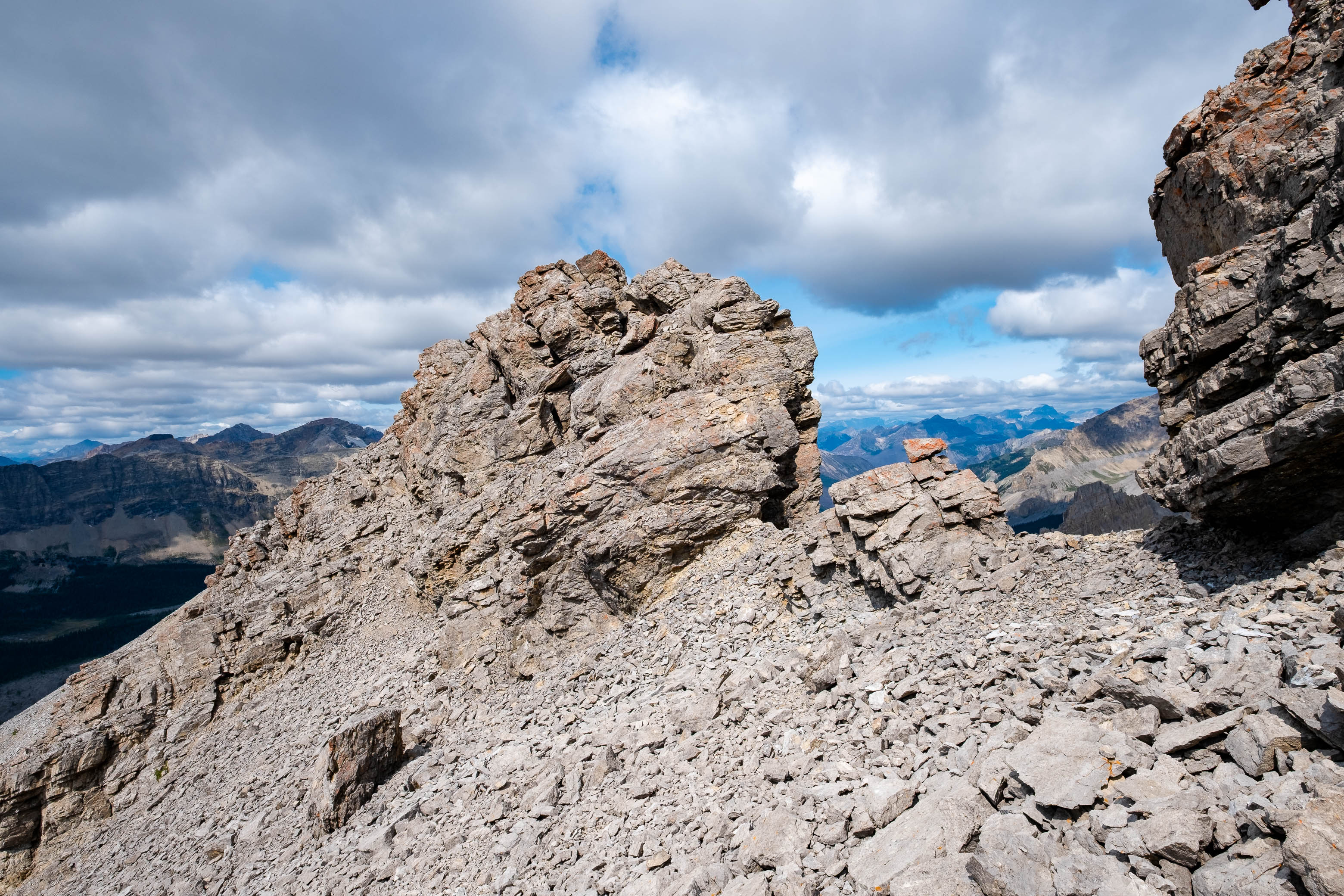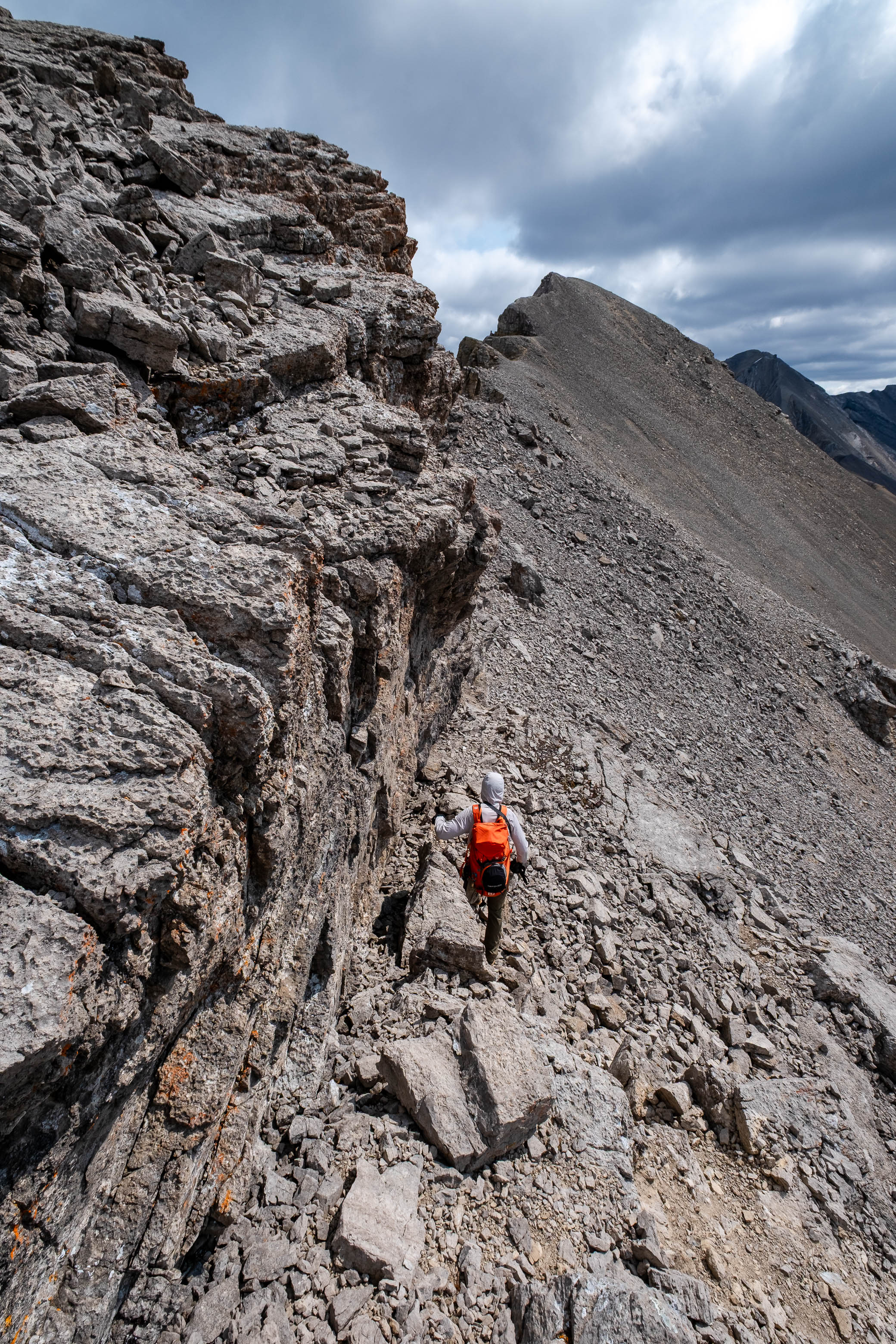 After a brief peek around the cairn for a register, we turned our attention to the long traverse ahead. We lost a bit of elevation from the first summit and promptly started towards the second. A noticeable scree trail has formed here, traversing around the right (south) side of the second summit and saves on unnecessary elevation gains. It should also be noted that the ridge cliffs out immediately after the second summit, so if you choose to ascend up n' over it you might just end up having to backtrack anyway.