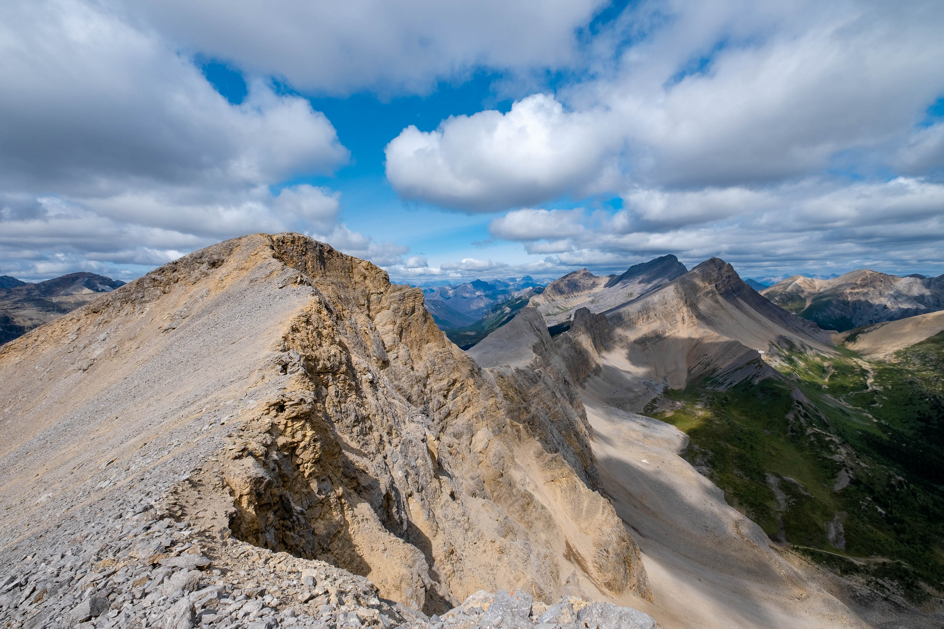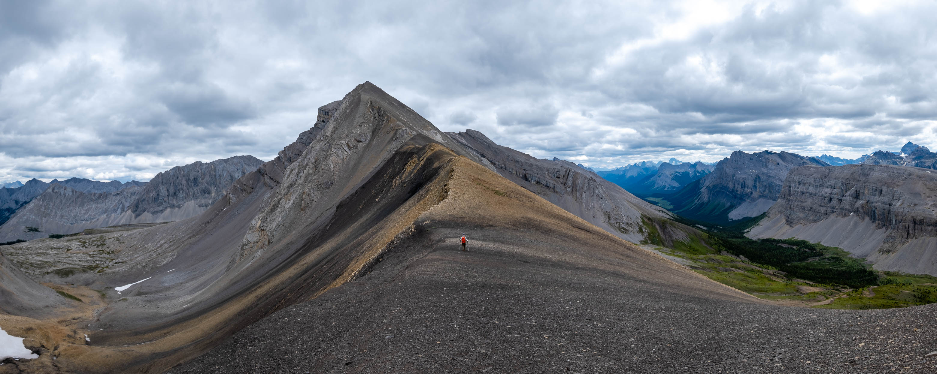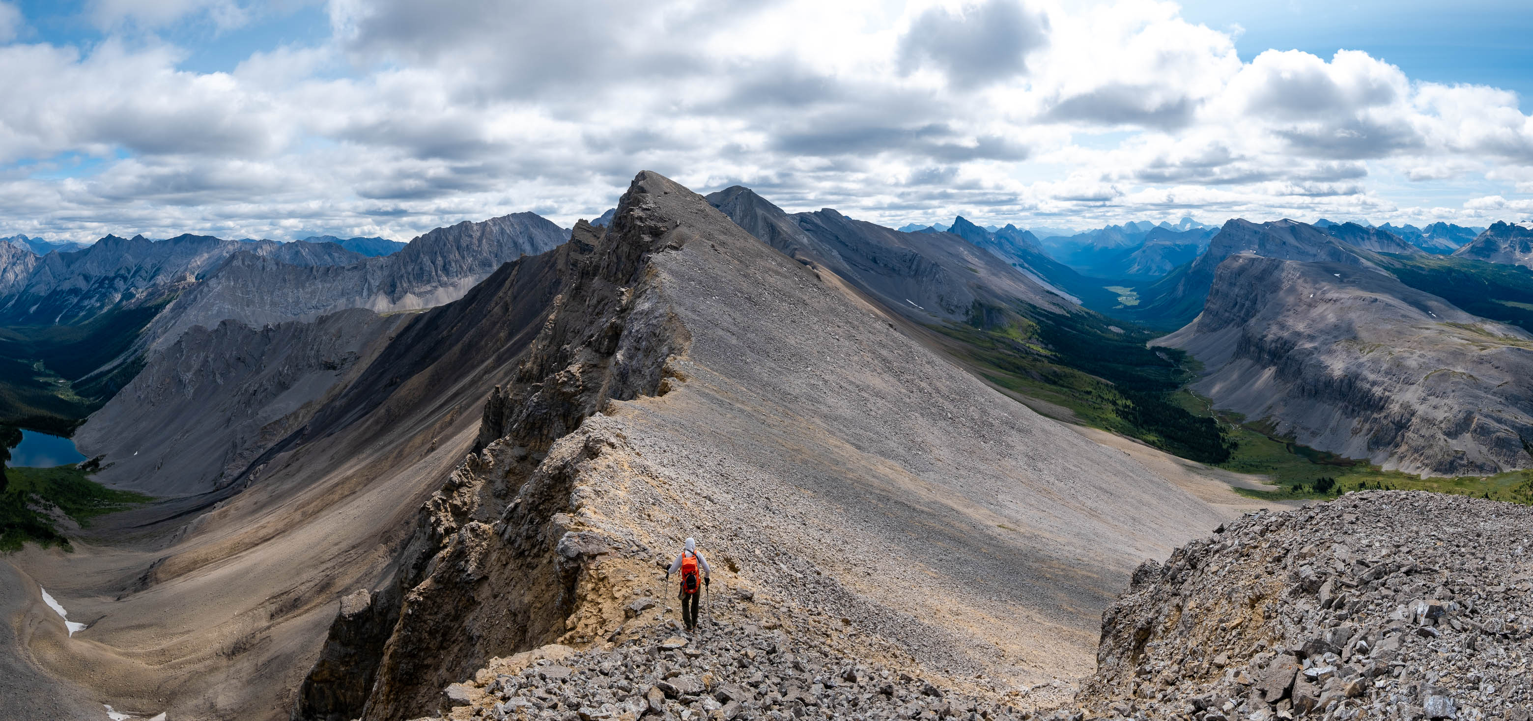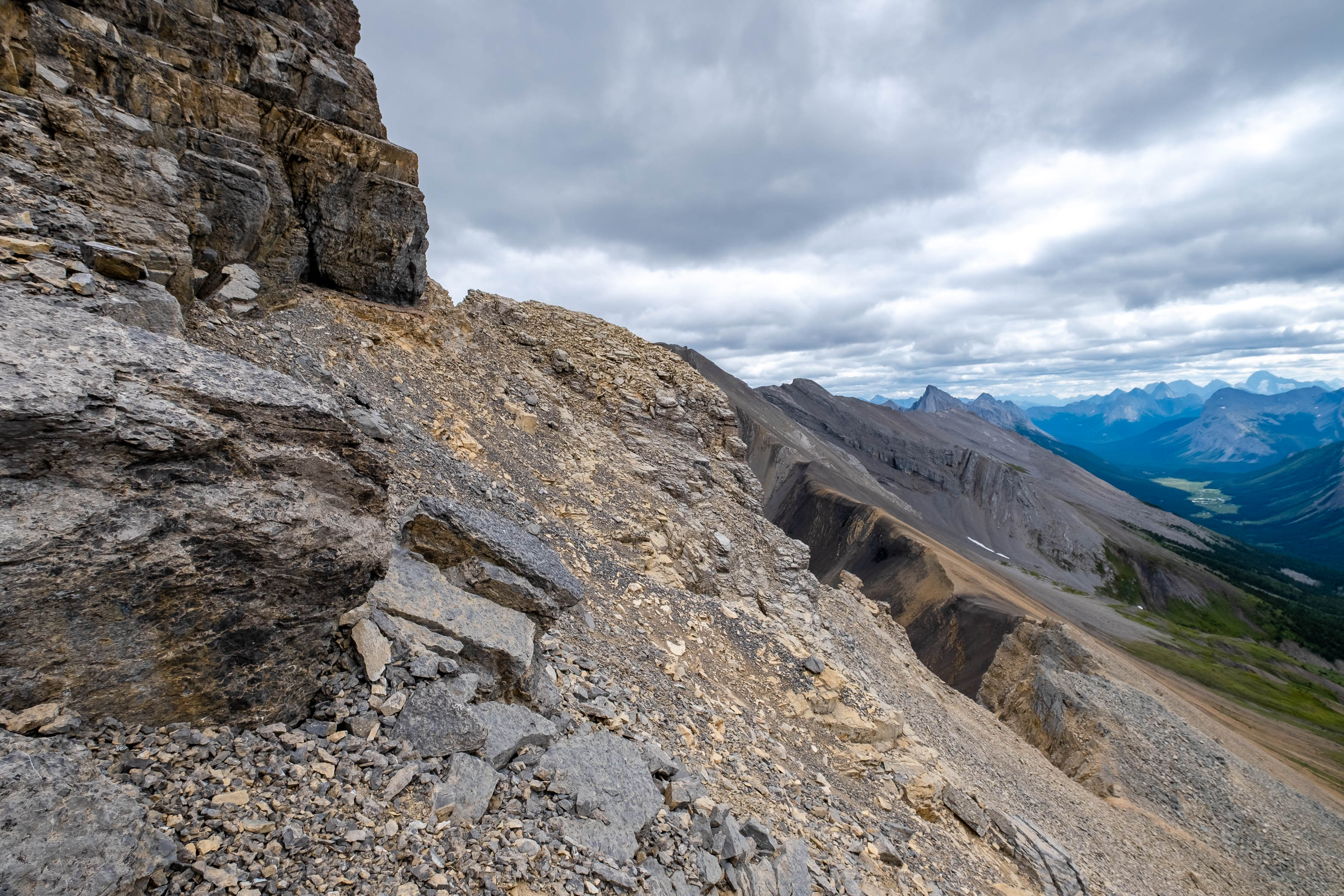 After a brief peek around the cairn for a register, we turned our attention to the long traverse ahead. We lost a bit of elevation from the first summit and promptly started towards the second. A noticeable scree trail has formed here, traversing around the right (south) side of the second summit and saves on unnecessary elevation gains. It should also be noted that the ridge cliffs out immediately after the second summit, so if you choose to ascend up n' over it you might just end up having to backtrack anyway.