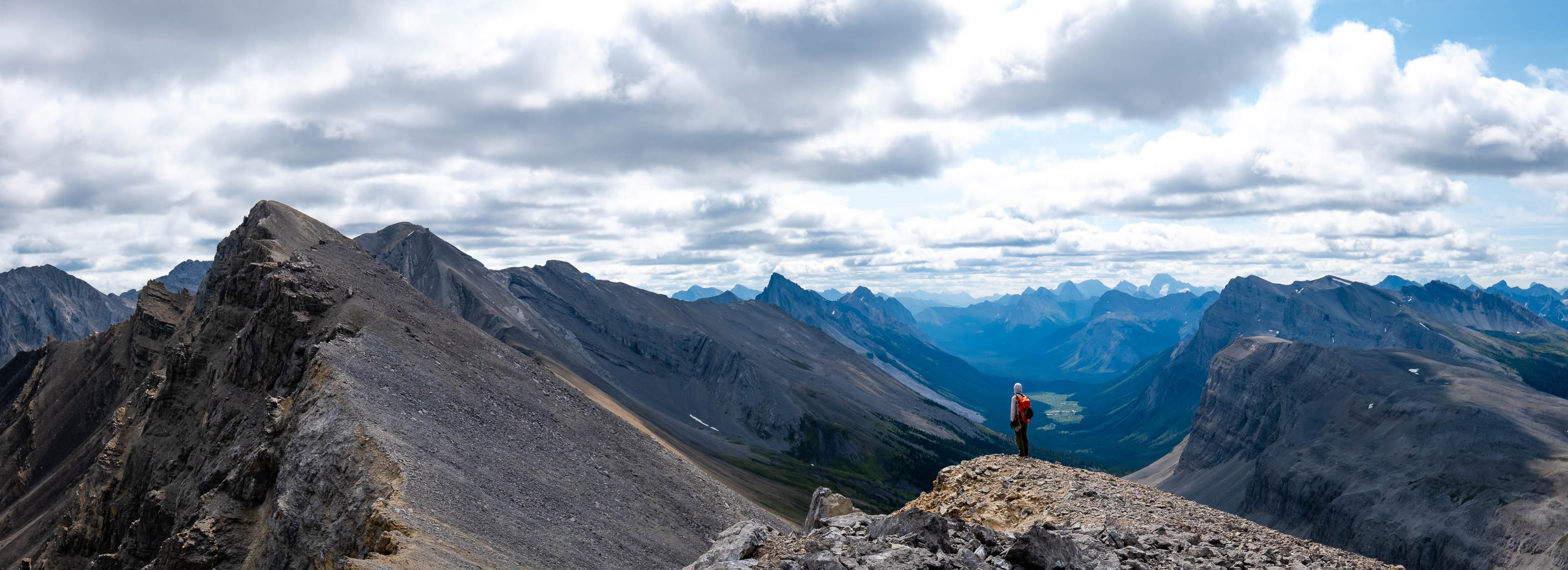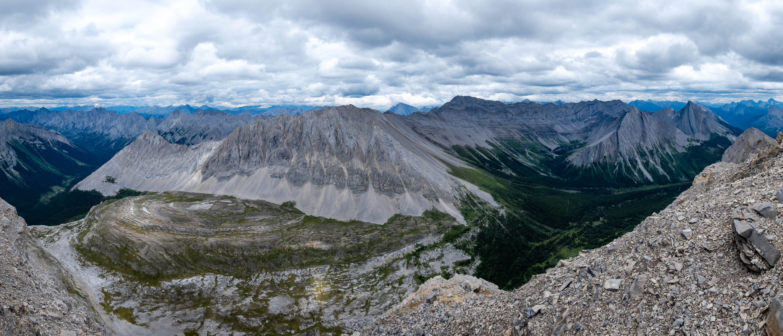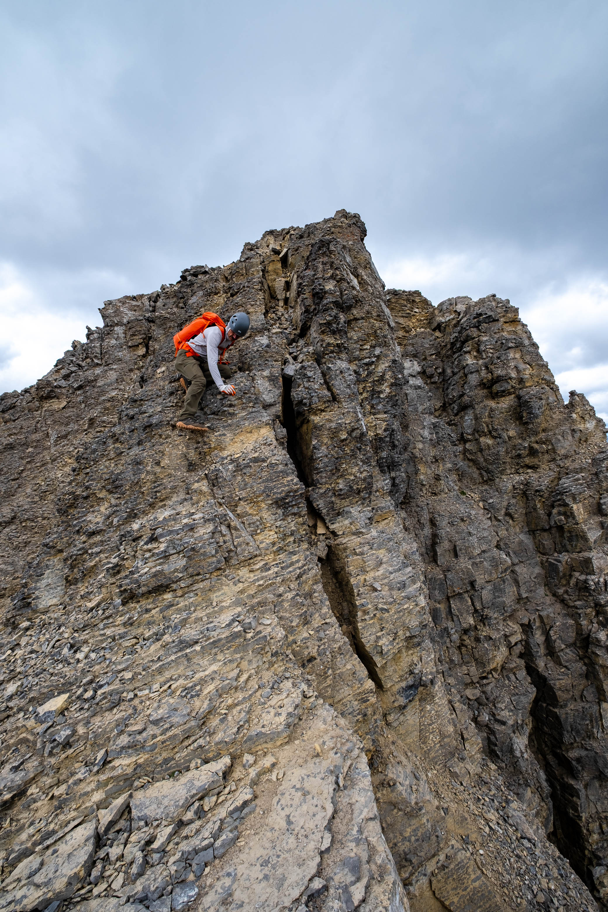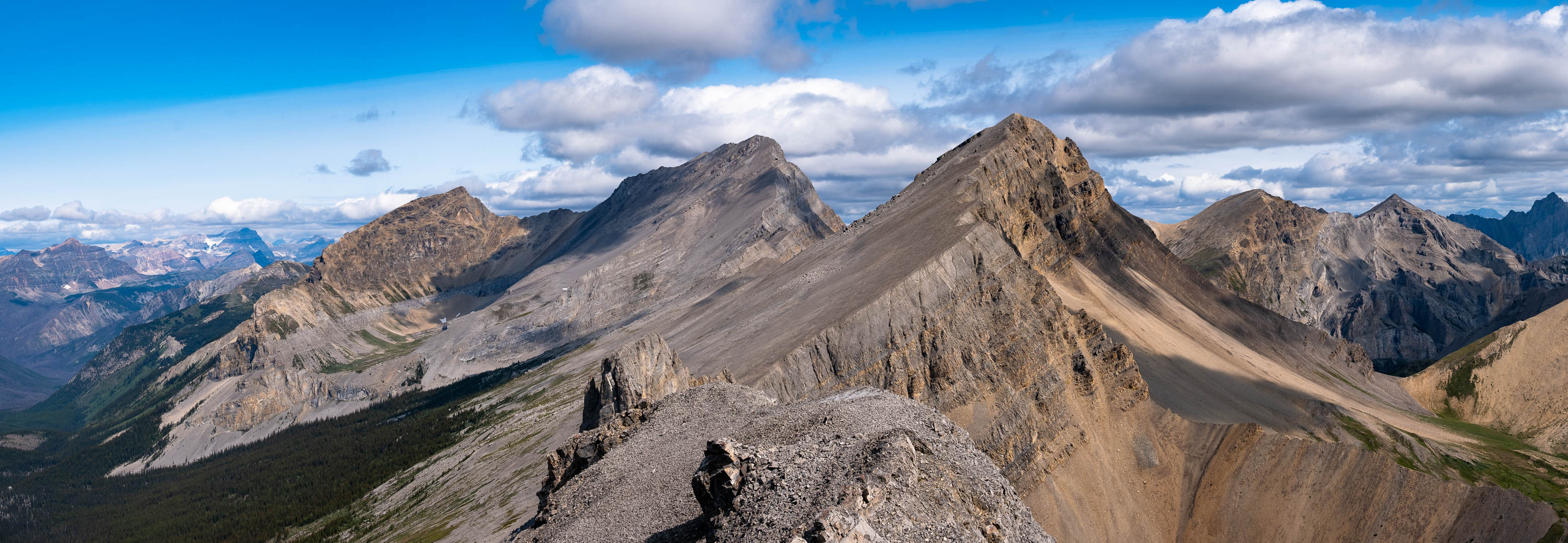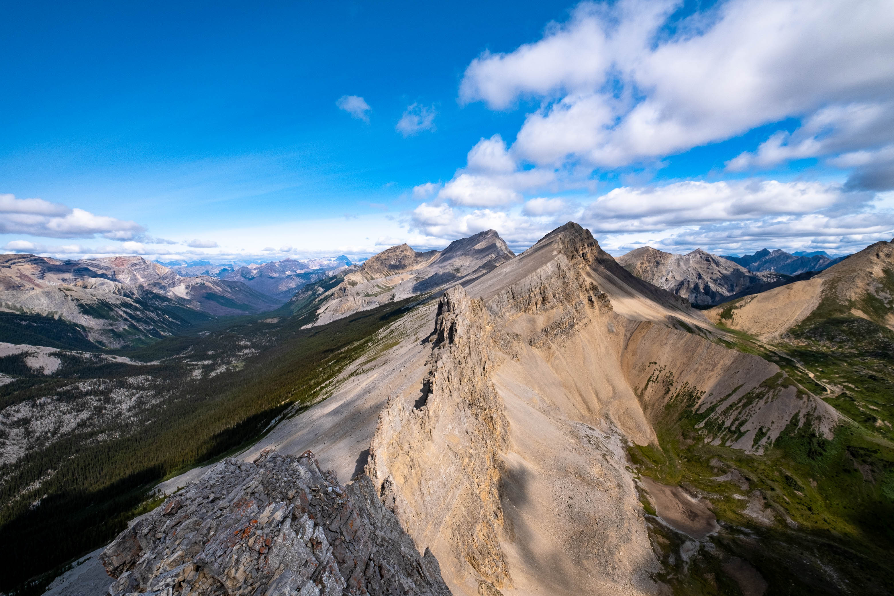 After a brief peek around the cairn for a register, we turned our attention to the long traverse ahead. We lost a bit of elevation from the first summit and promptly started towards the second. A noticeable scree trail has formed here, traversing around the right (south) side of the second summit and saves on unnecessary elevation gains. It should also be noted that the ridge cliffs out immediately after the second summit, so if you choose to ascend up n' over it you might just end up having to backtrack anyway.