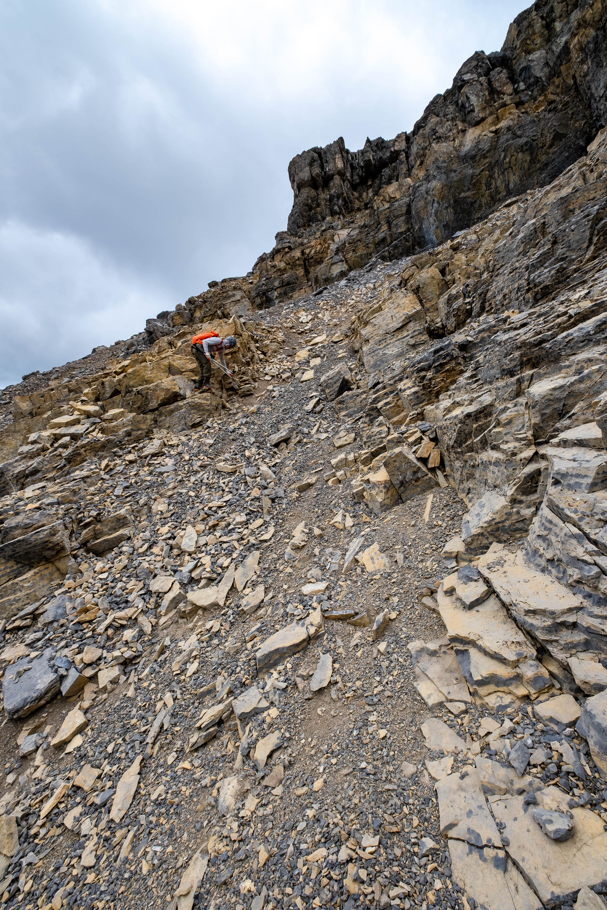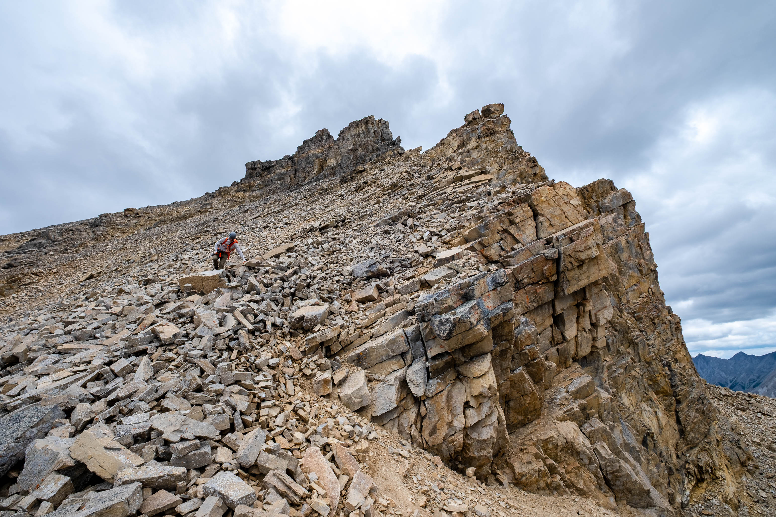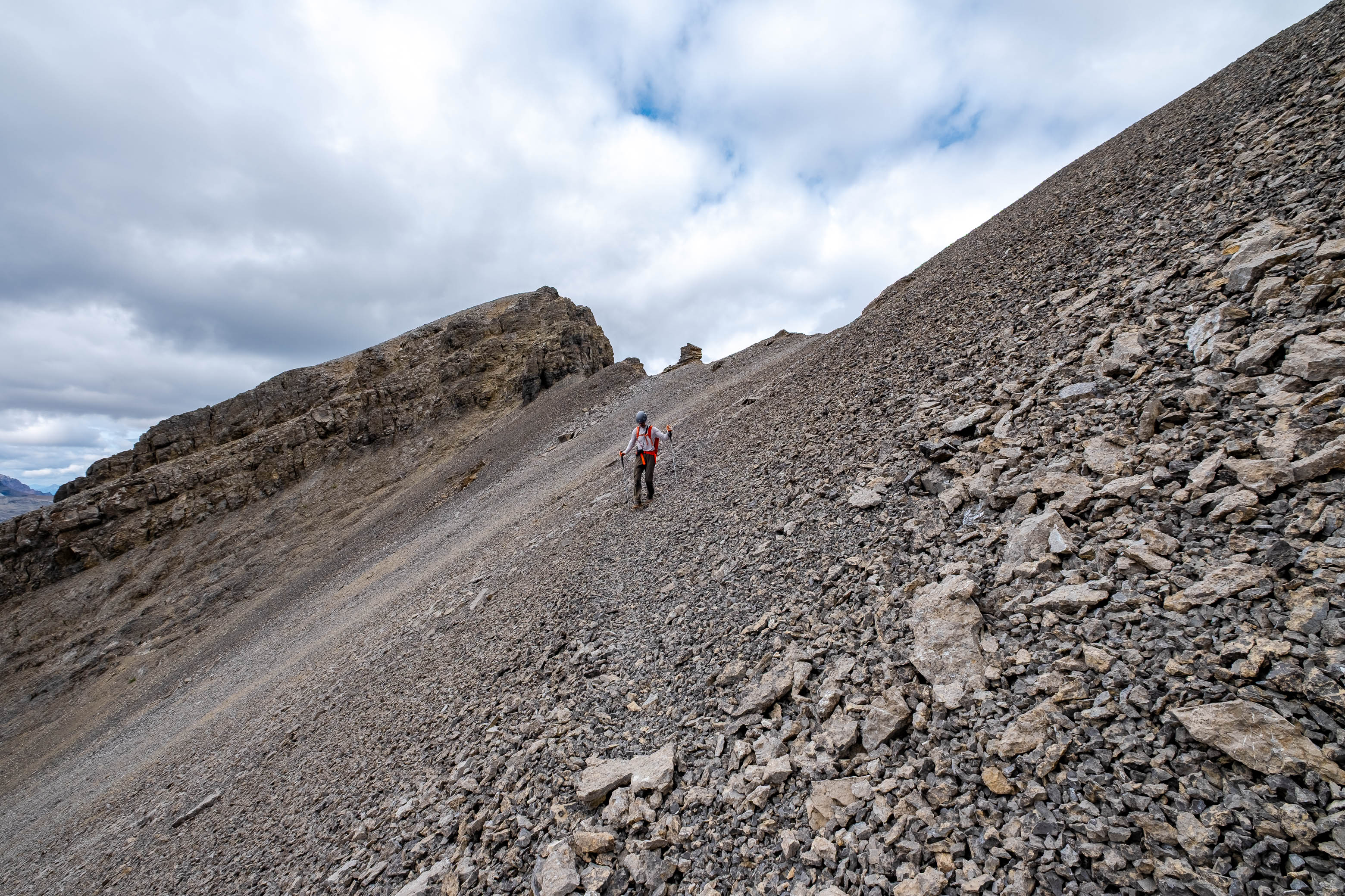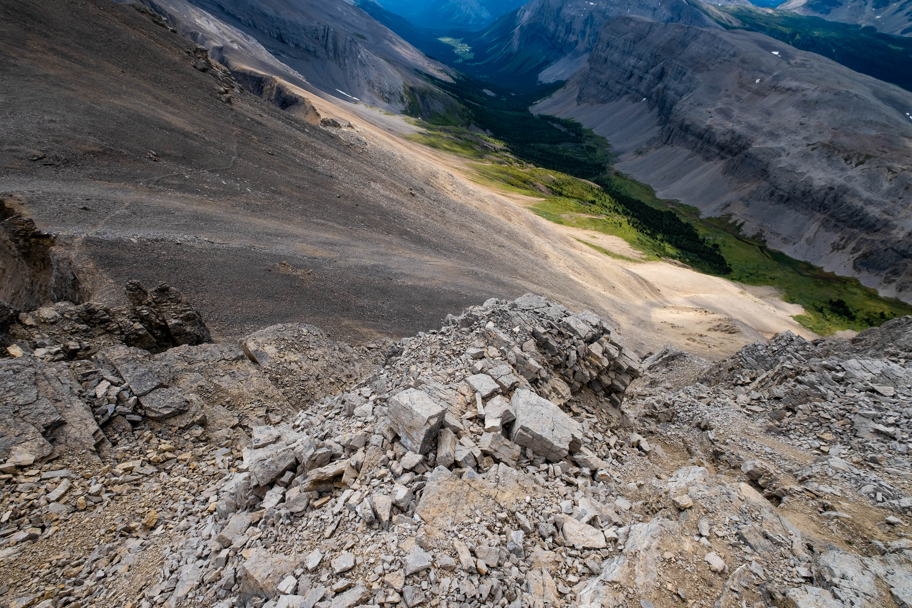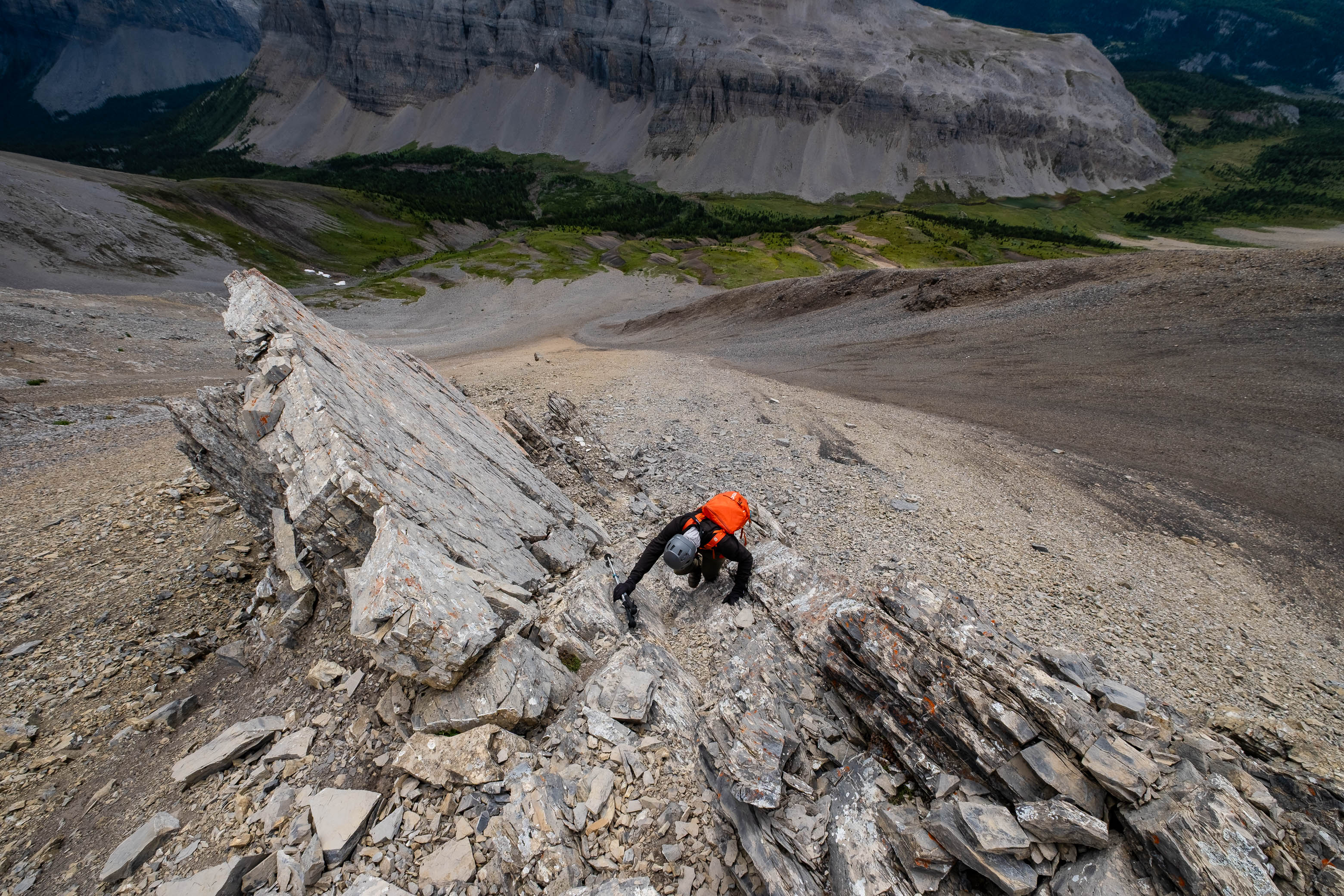 I thought we might be able to simply continue right down the ridge, but was immediately turned back by an incredibly loose and exposed cliff band that I wasn't about to tempt fate with. We retraced our steps back to the col between summits three and four, where we were then able to join a goat trail, bypassing the peak on its southern scree slopes. The sidehilling started out surprisingly pleasant, but would soon become downright nasty as the slope steepened and the trail was "washed away", replaced with crumbly, downsloping slabs and crazy loose gullies. Everything moved and this traverse went on for far too long. It was a relief to arrive back on the ridge, along with the solid footing it provided, and we both agreed that what we'd just completed was easily the "low-light" of the traverse.